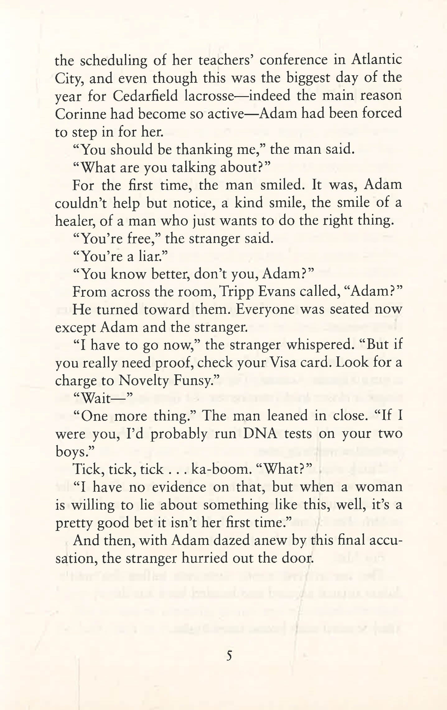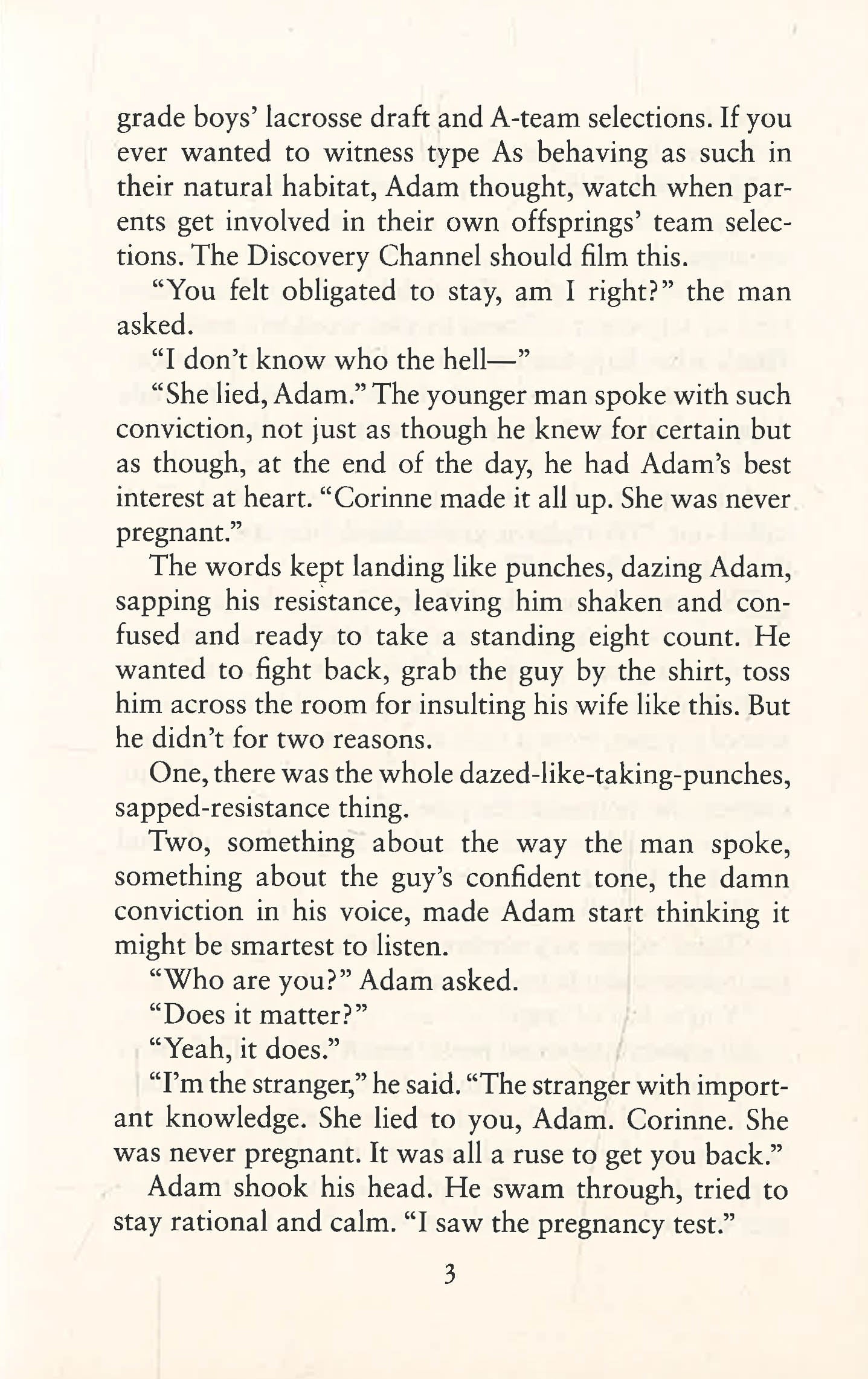 'The modern master of the hook and twist' DAN BROWN Adam Price has a lot to lose: a beautiful family, a big house, a good job - a perfect life.But then he meets a stranger in a bar and learns a devastating secret about his wife.With the mirage of perfection shattered, Adam finds himself caught up in something far darker than his wife's deception.And if he doesn't make the right moves, the conspiracy he's stumbled into will not only ruin lives - it will end them.Praise for Harlan Coben:'One of the all-time greats - pick up any one of his thrillers and you'll find a riveting, surprising story with a big, beating heart' GILLIAN FLYNN'With convincing characters and a strong emotional heart, you're effortlessly swept along to a tense and dramatic conclusion' SUNDAY MIRROR