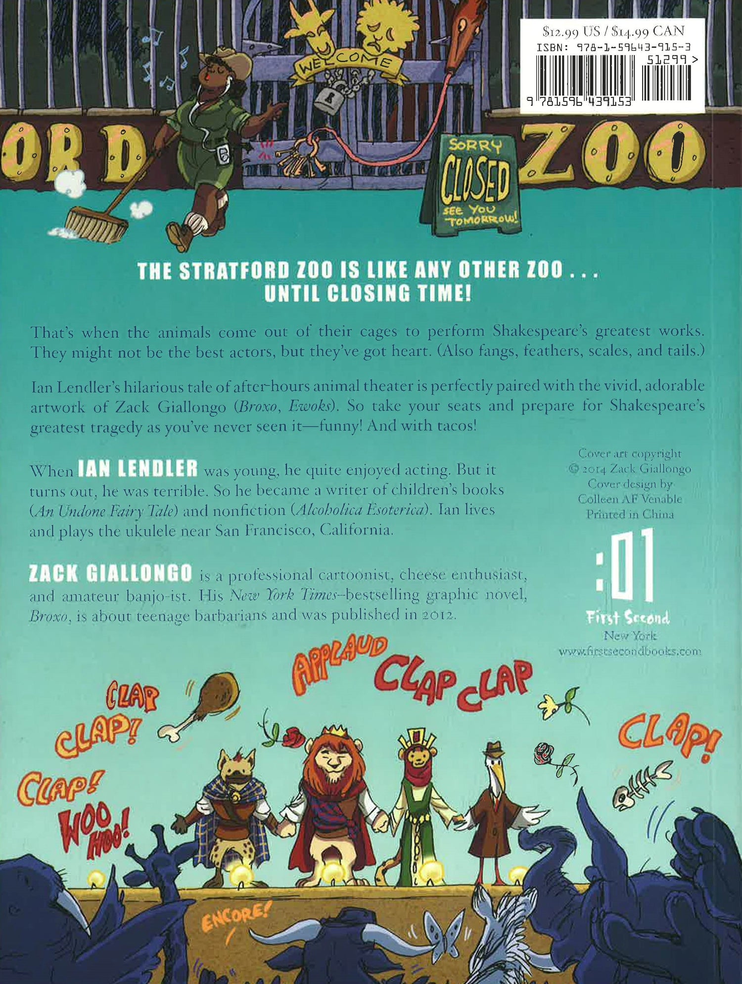 The Stratford Zoo looks like a normal zoo... until the gates shut at night. That's when the animals come out of their cages to stage elaborate performances of Shakespeare's greatest works. They might not be the most accomplished thespians, but they've got what counts: heart. Also fangs, feathers, scales, and tails, in The Stratford Zoo Midnight Revue Presents Macbeth. Ian Lendler's hilarious tale of after-hours animal stagecraft is perfectly paired with the adorable, accessible artwork of Zack Giallongo (Broxo, Ewoks). And with Romeo and Juliet coming in book two, this is a promising new series of graphic novels for young readers.