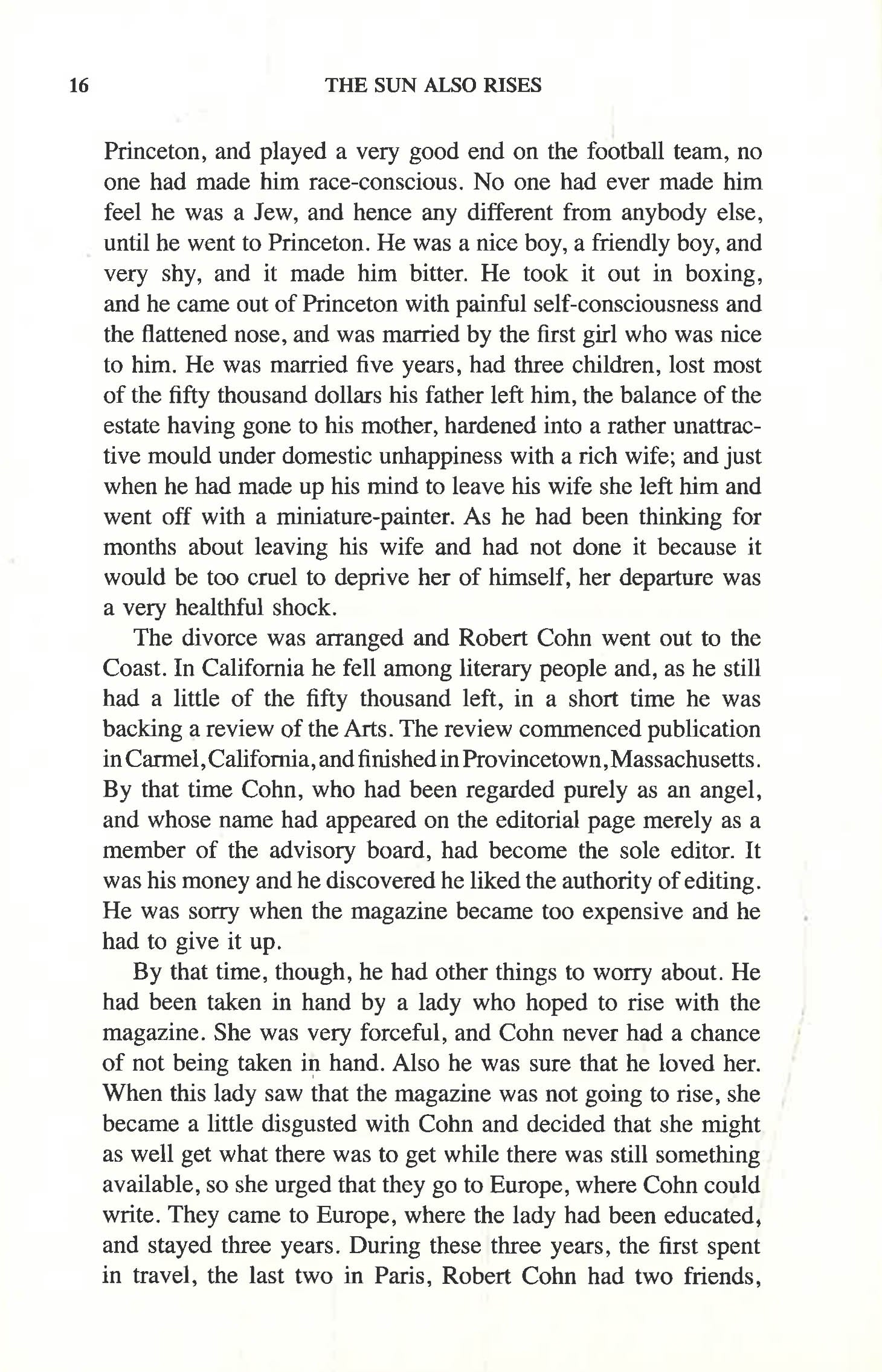 Jake Barnes is a man whose war wound has made him unable to have sex—and the promiscuous divorcée Lady Brett Ashley. Jake is an expatriate American journalist living in Paris, while Brett is a twice-divorced Englishwoman with bobbed hair and numerous love affairs, and embodies the new sexual freedom of the 1920s. The novel is a roman à clef: the characters are based on real people in Hemingway's circle, and the action is based on real events, particularly Hemingway's life in Paris in the 1920s and a trip to Spain in 1925 for the Pamplona festival and fishing in the Pyrenees.