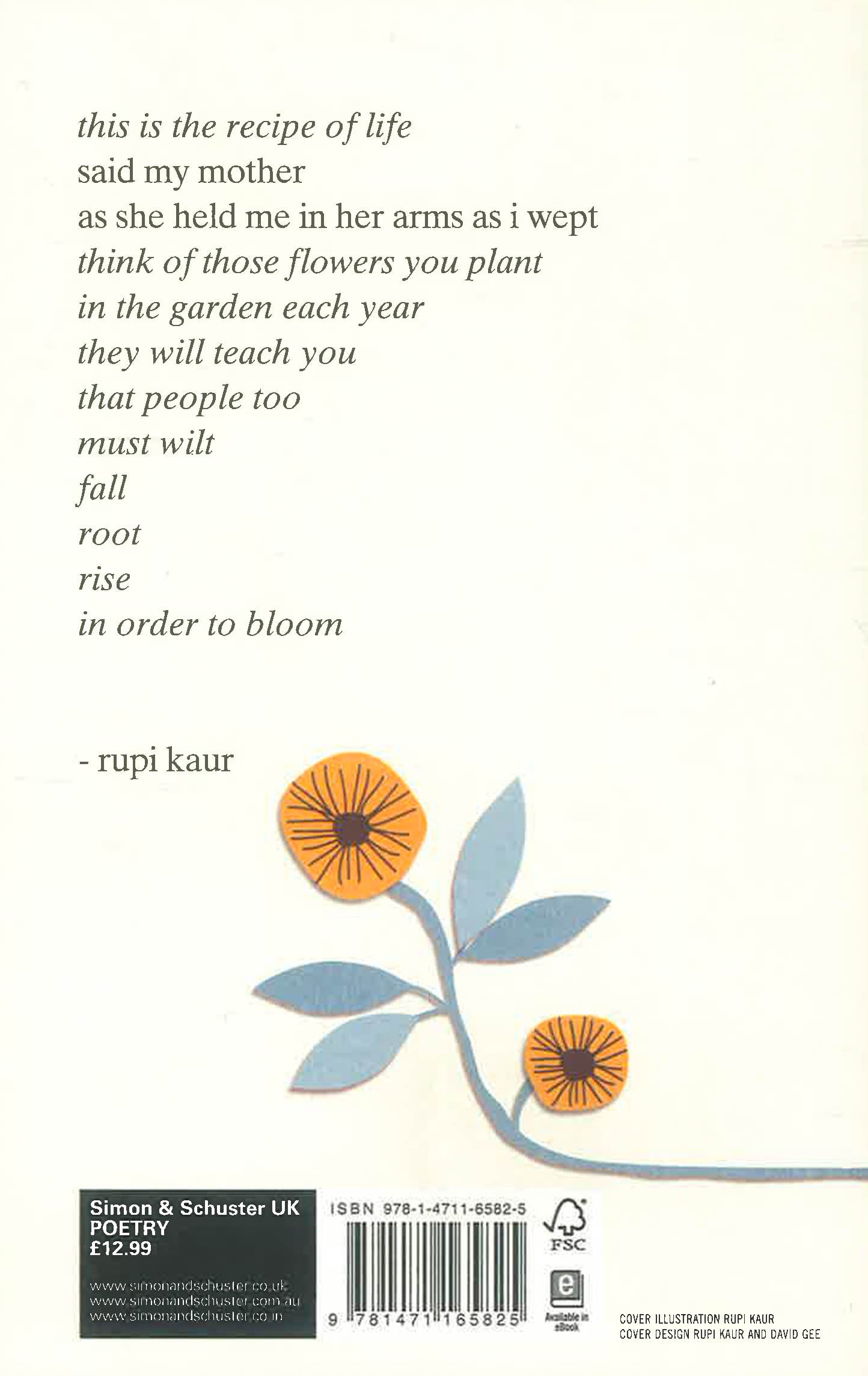 From Rupi Kaur, the top ten Sunday Times bestselling author of milk and honey, comes her long-awaited second collection of poetry. Illustrated by Kaur, the sun and her flowers is a journey of wilting, falling, rooting, rising and blooming. It is a celebration of love in all its forms.