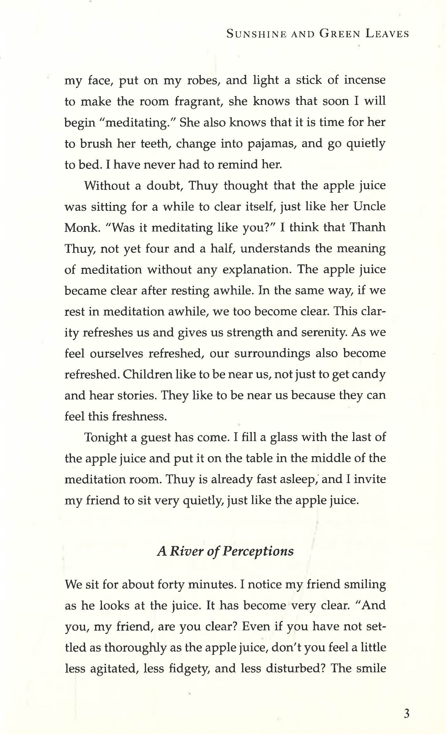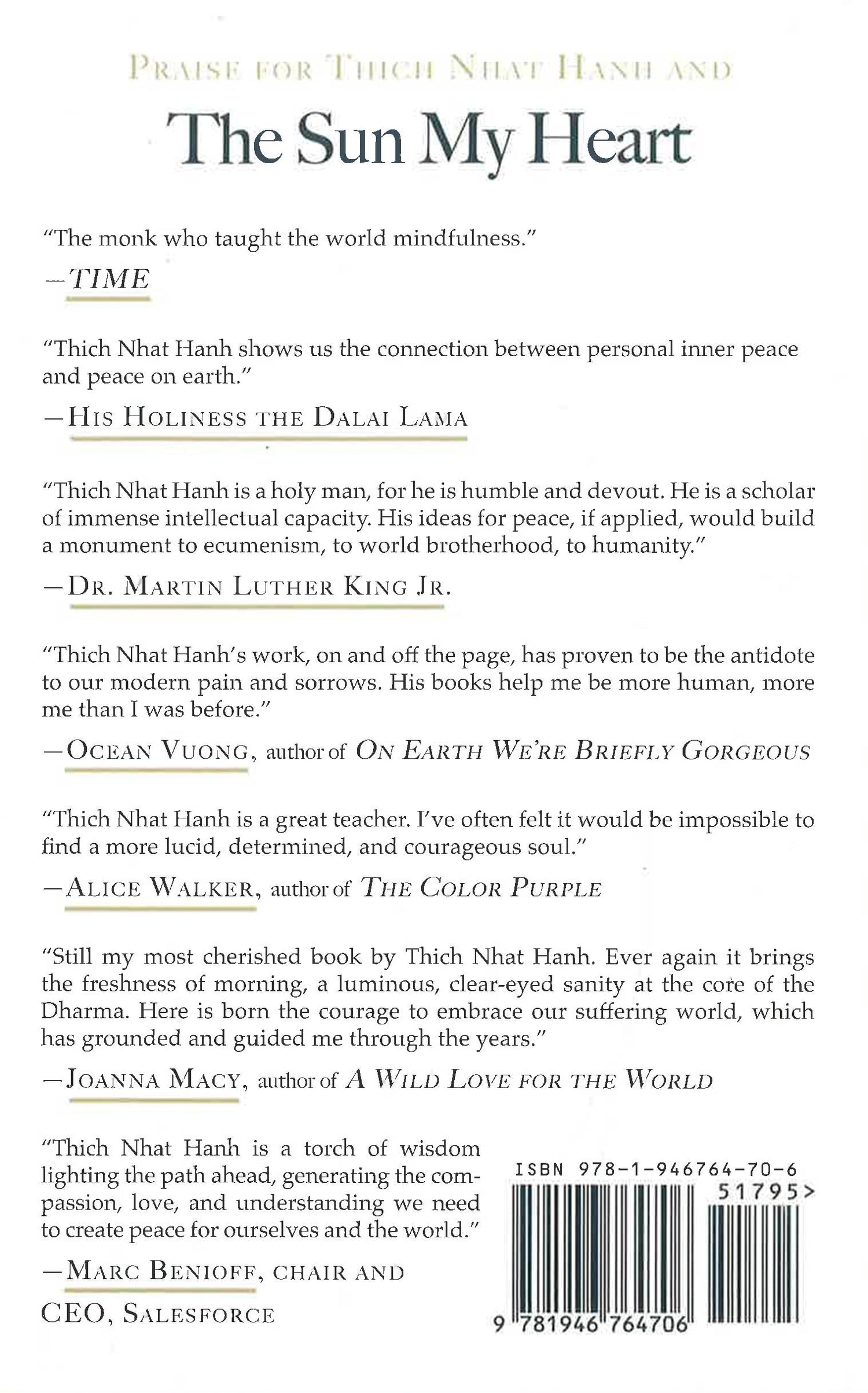 A companion guide for meditators, The Sun My Heart contains many of Thich Nhat Hanh's core teachings, and encourages readers to use their practice to discover their own insights. As he writes: "Wisdom is a living stream, not an icon to be preserved in a museum."