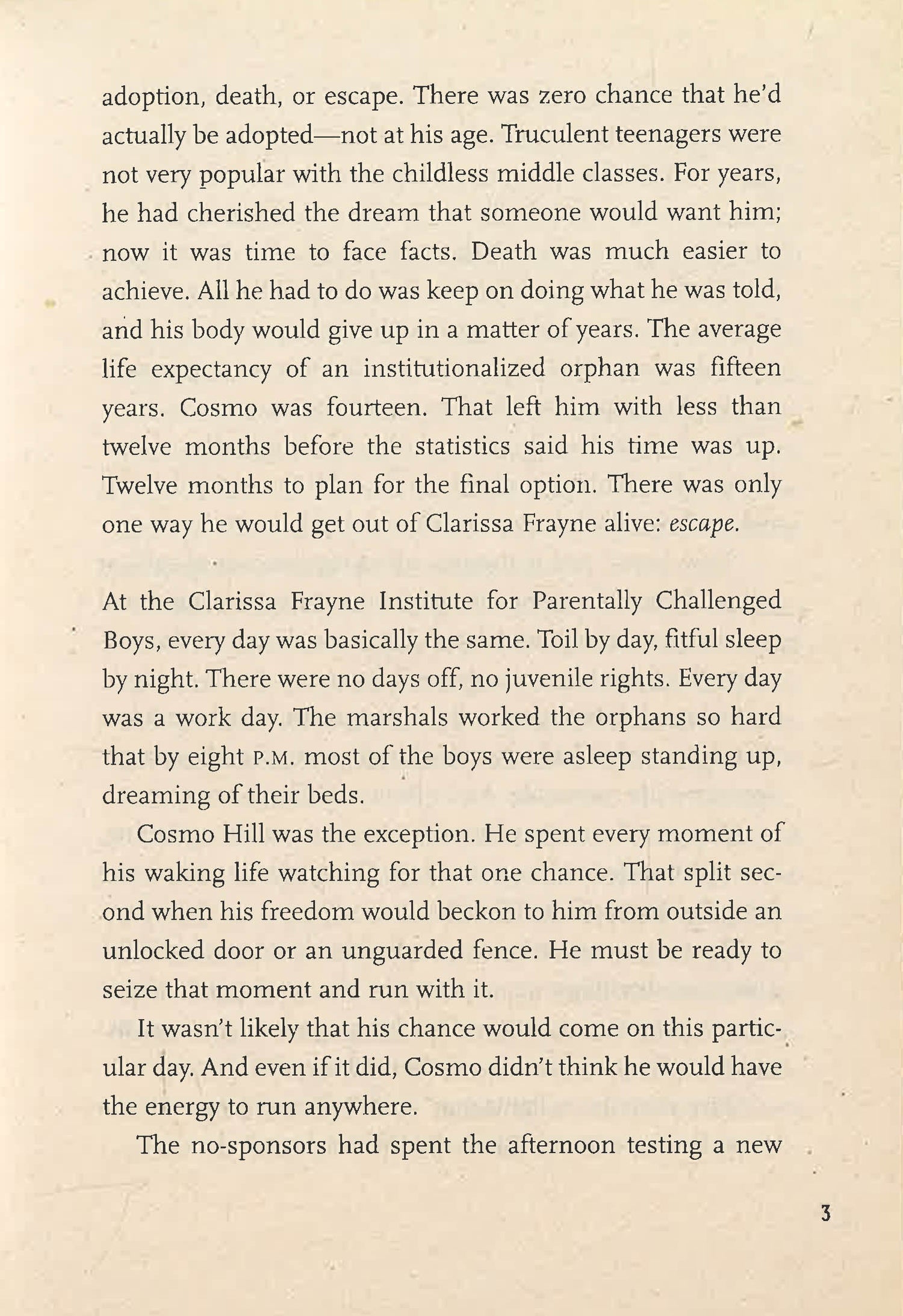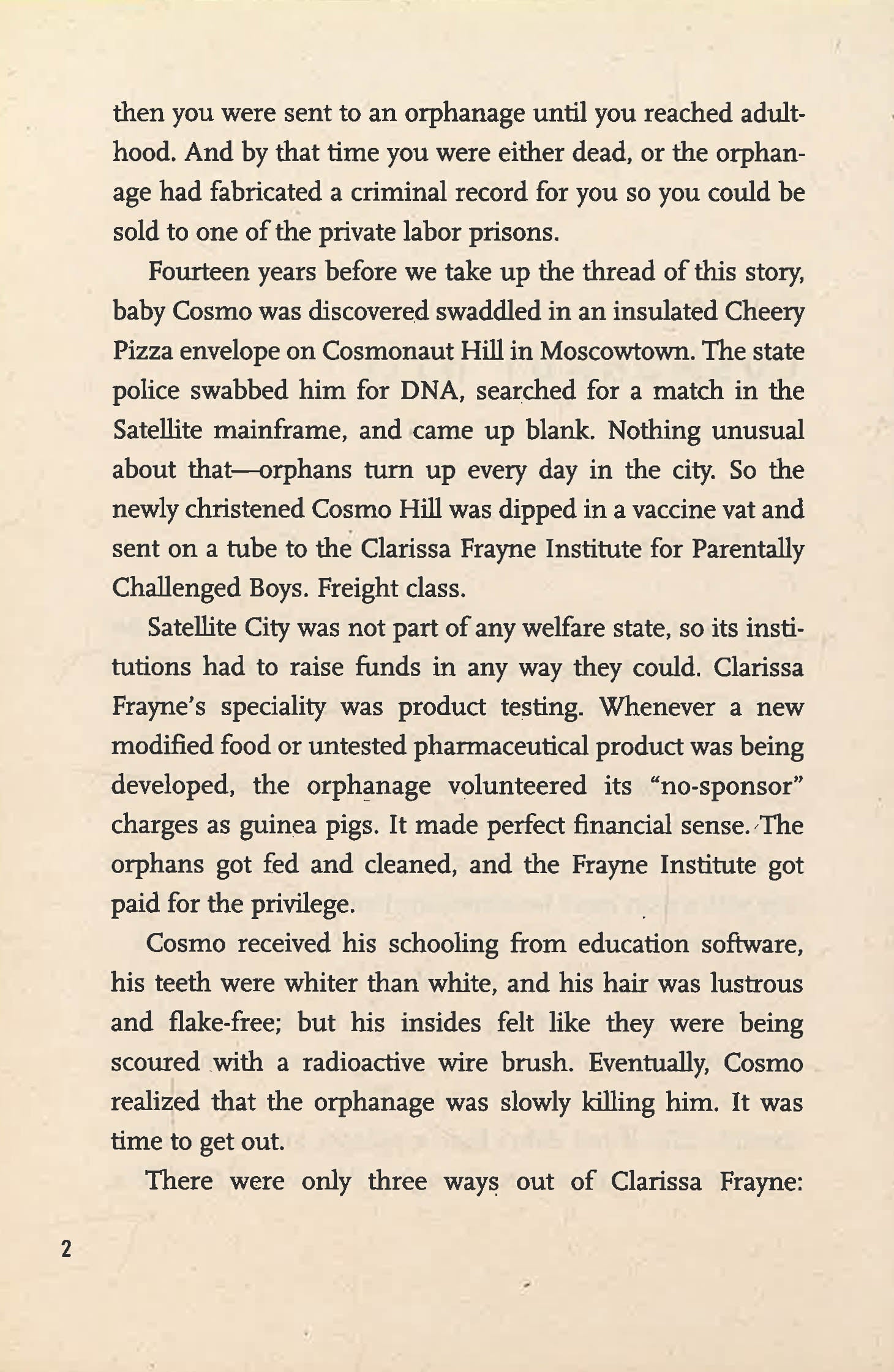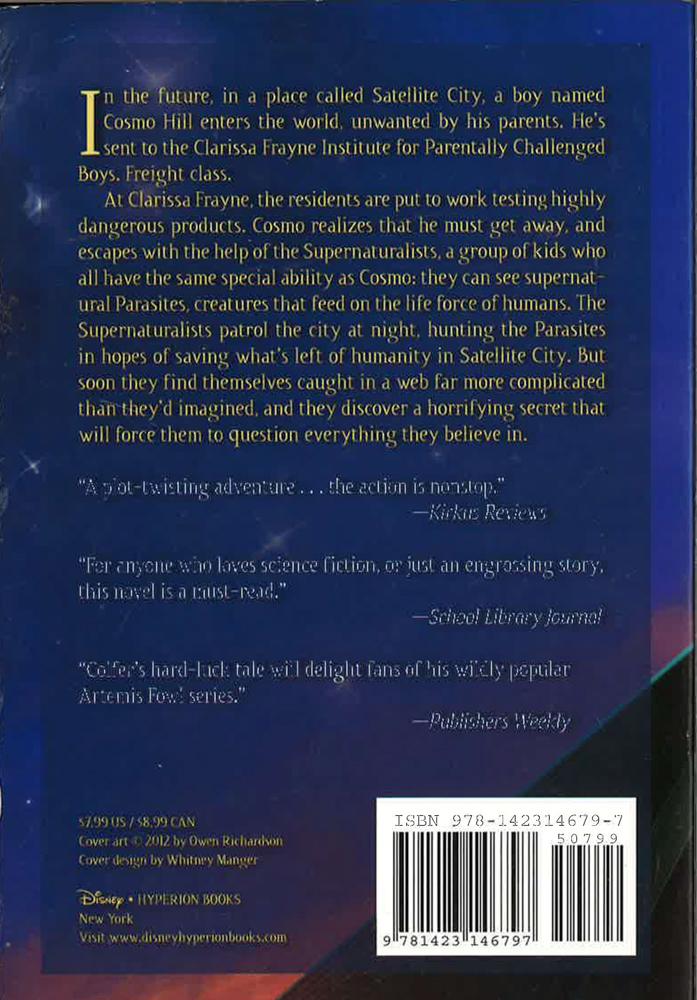 Unwanted by his parents, Cosmo Hill is put to work by the state, testing highly dangerous products. Cosmo realizes he must get away, and escapes with the help of the Supernaturalists, a group of kids who have the same special abilities as Cosmo--they can see supernatural Parasites, creatures that feed on the life force of humans. The Supernaturalists patrol the city at night, hunting the Parasites in hopes of saving what is left of humanity in Satellite City. But soon they find themselves caught in a web far more complicated than they'd imagined, and they discover a horrifying secret that will force them to question everything they believe in.