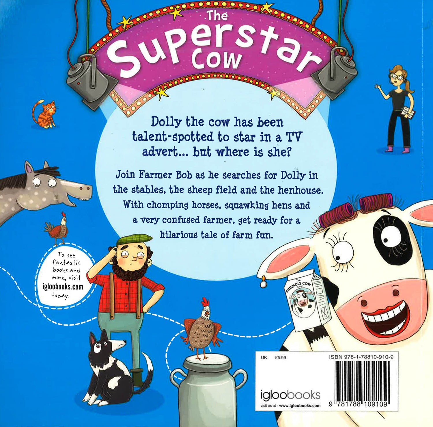 Dolly the cow has been talent-spotted to star in a TV advert... but where is she? Join Farmer Bob as he searches for Dolly in the stables, the sheep field and the henhouse. With chomping horses, squawking hens and a very confused farmer, get ready for a hilarious tale of farm fun.