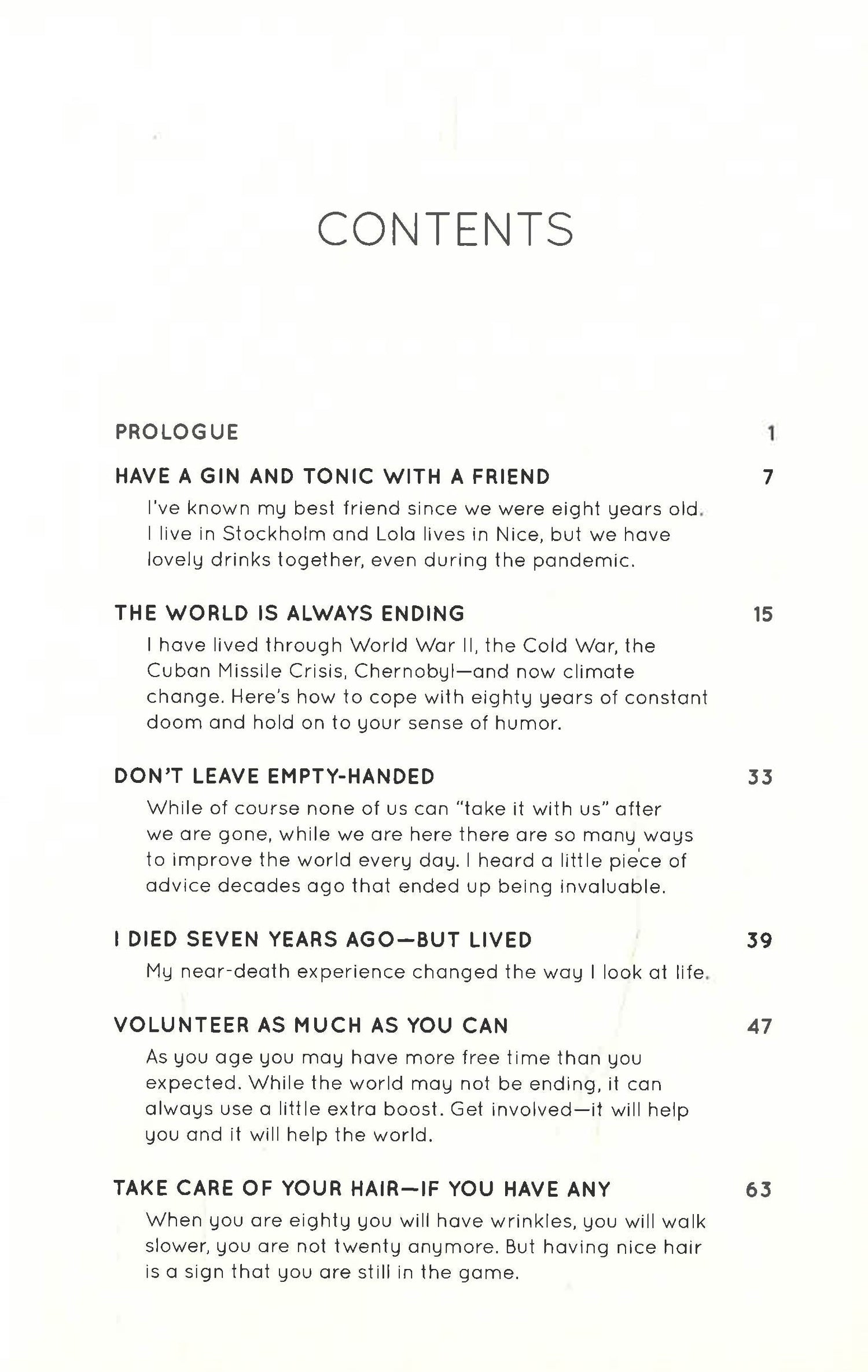 Margareta Magnusson shared with the world her practical Swedish tradition of döstädning, or “death cleaning”—clearing out unnecessary belongings before others must do it for you—in her international bestseller The Gentle Art of Swedish Death Cleaning. Now, unburdened by baggage (emotional and actual) she is able to focus on what makes each day worth living, and reveals her discoveries about growing older—some difficult to accept, many rather wondrous. She reflects on her early days growing up in Sweden and raising her family around the world, offering tips and wisdom on how to age gracefully, such as: don’t be afraid to wear stripes, don’t resist new technology, let go of what doesn’t matter, and much more.