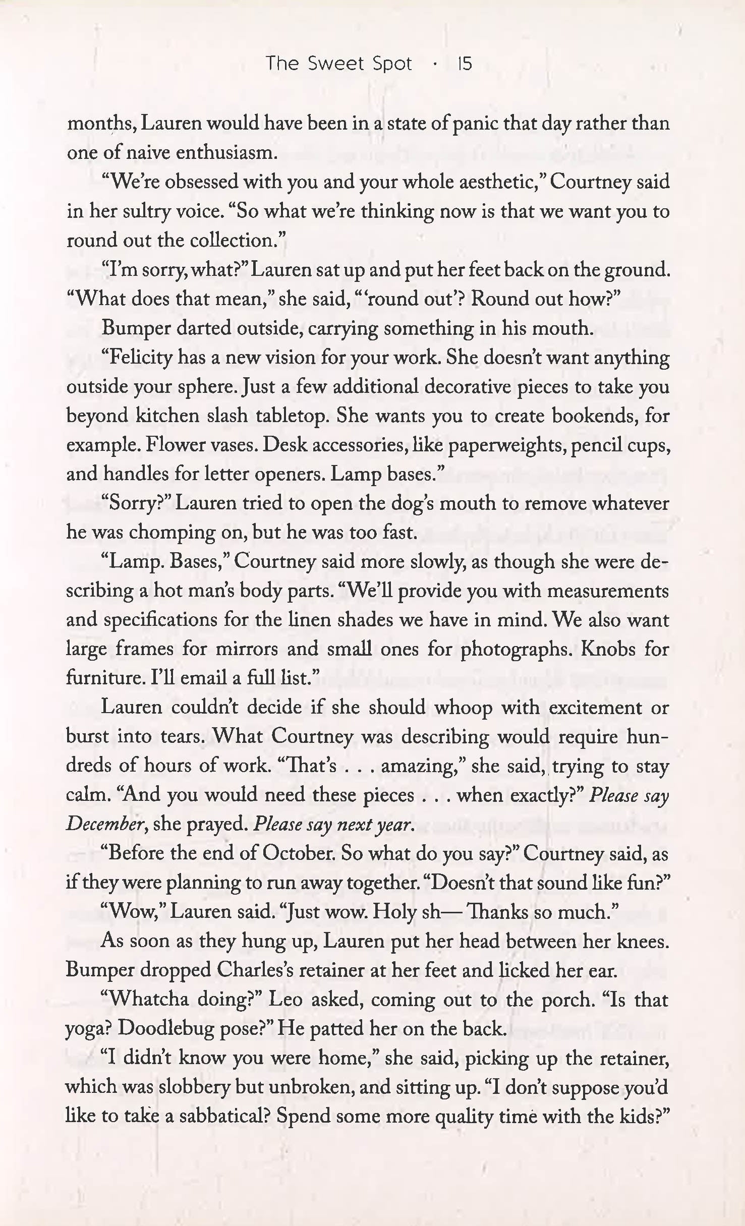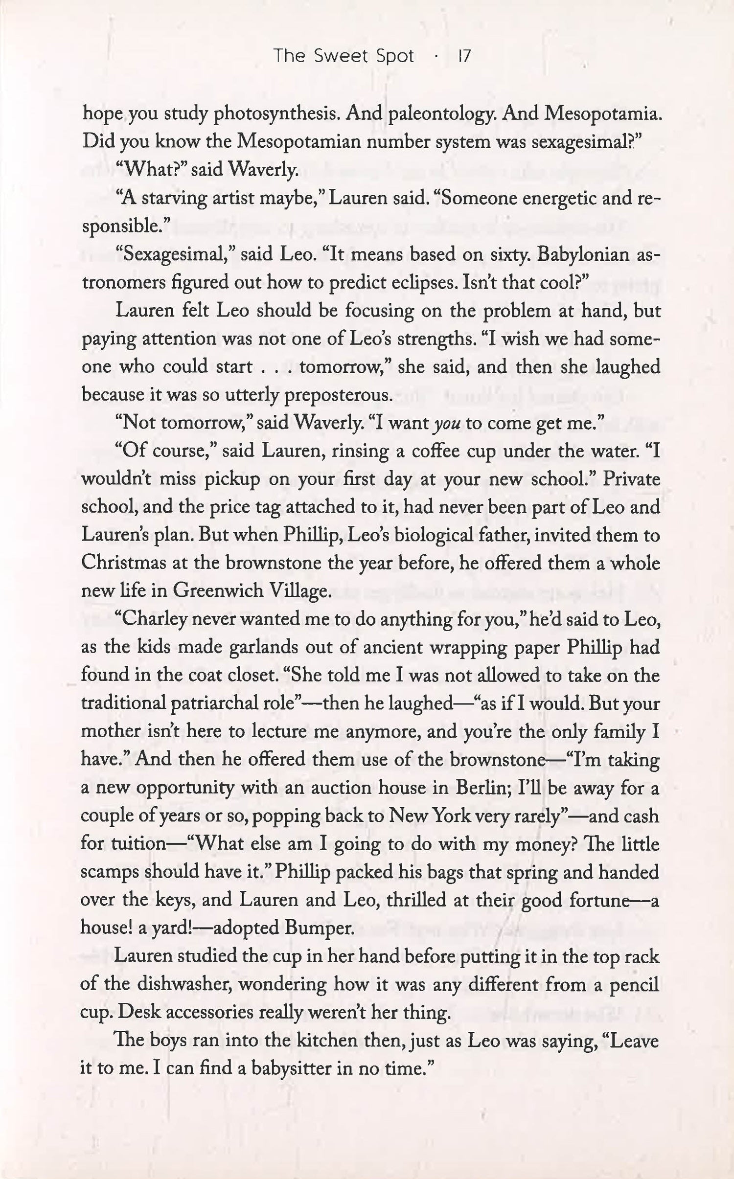 Lauren and her family—lucky bastards—have been granted the use of a spectacular brownstone, teeming with history and dizzyingly unattractive 70s wallpaper. Adding to the home’s bohemian, grungy splendor is the bar occupying the basement, a (mostly) beloved dive called The Sweet Spot. Within days of moving in, Lauren discovers that she has already made an enemy in the neighborhood by inadvertently sparking the divorce of a couple she has never actually met.