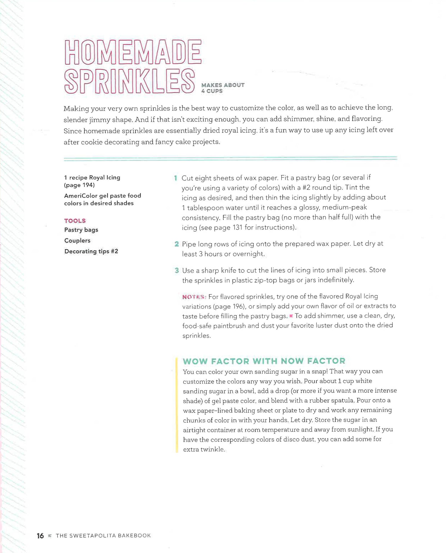 Rosie Alyea, the creator of the Sweetapolita blog, frolics in flour and frosting, and she loves to get her two young daughters involved, too. The pages of her debut book are full of playful ideas that will inspire creativity in bakers of all levels—including a recipe for making sprinkles at home and numerous ways to showcase them, such as the Sprinkle-Me-Silly Pizza with rainbow jimmies and nonpareils galore.