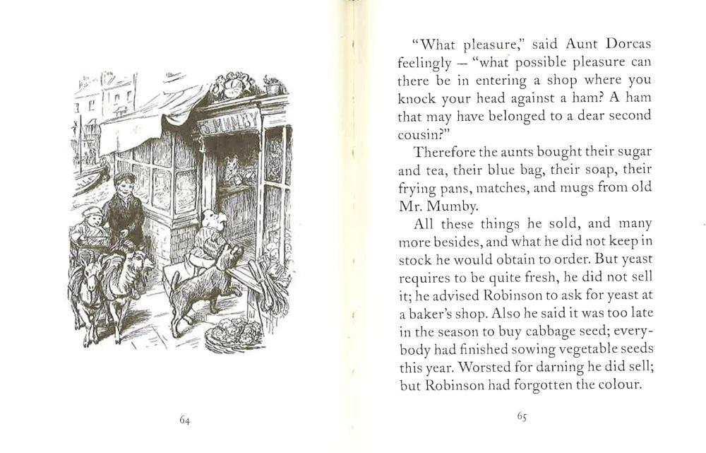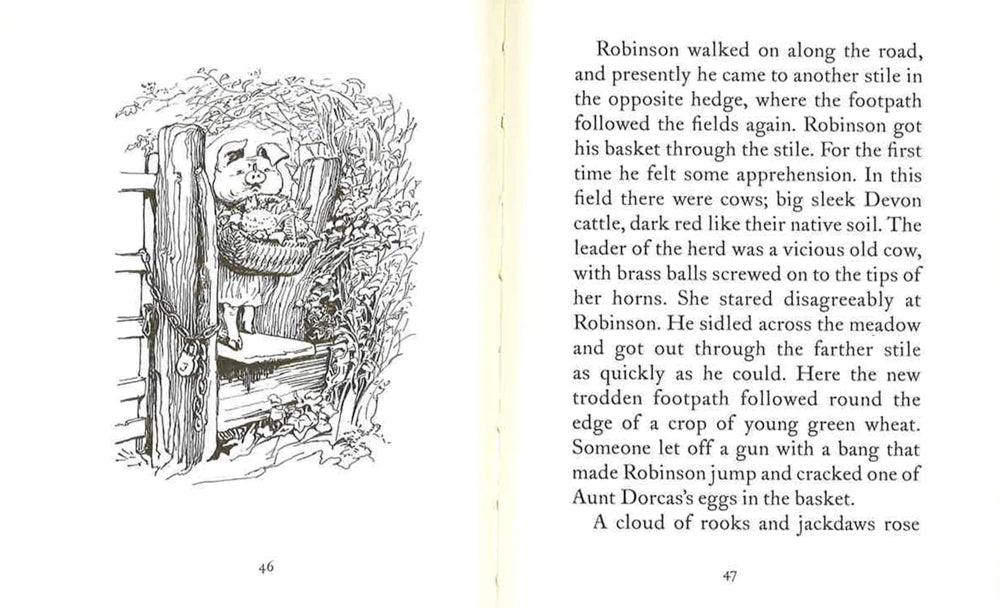 Little Pig Robinson goes to market for his aunts and, after a series of unexpected and amazing adventures, including an unexpected sea voyage, settles to a pleasant life on an island in the South Seas.
