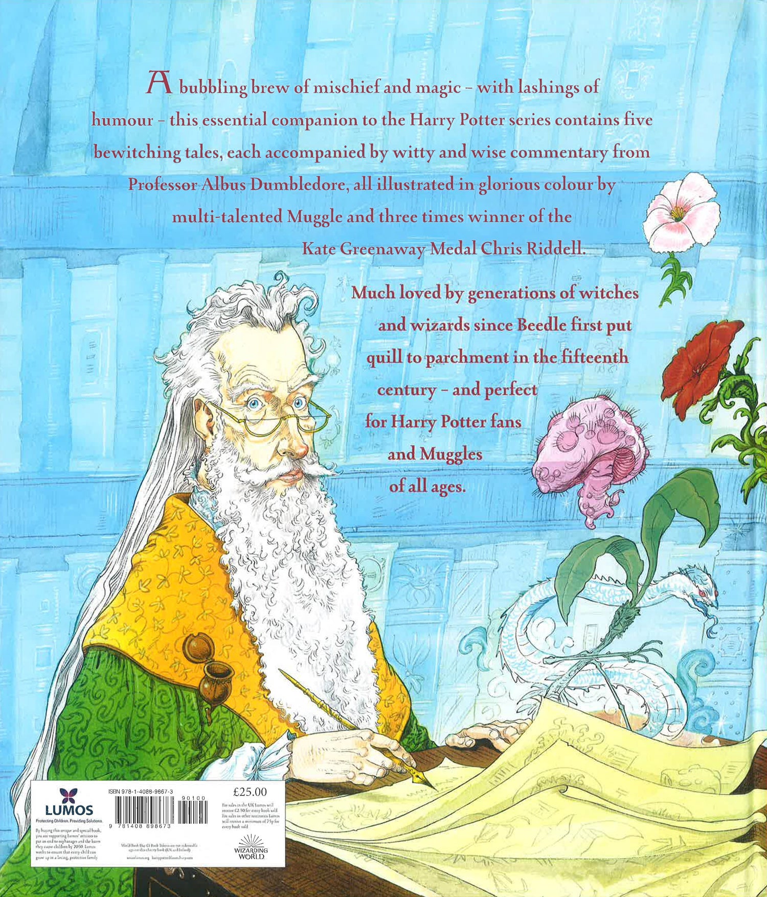 Mischievous and witty, the five rollicking tales are a deeply satisfying read in the tradition of all great fables and fairy tales. Kindnesses are rewarded and selfishness shown to be the ruin of many a wizard. Burping cauldrons, hairy hearts and cackling stumps are met along the way. Each tale is brought vividly to life with Riddell's trademark humour and elegance, including 'The Tale of the Three Brothers', familiar to readers of Harry Potter from the crucial role it played in Harry Potter and the Deathly Hallows.