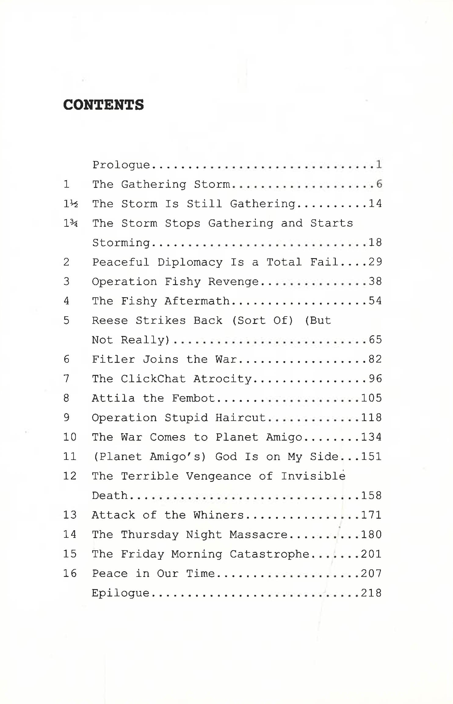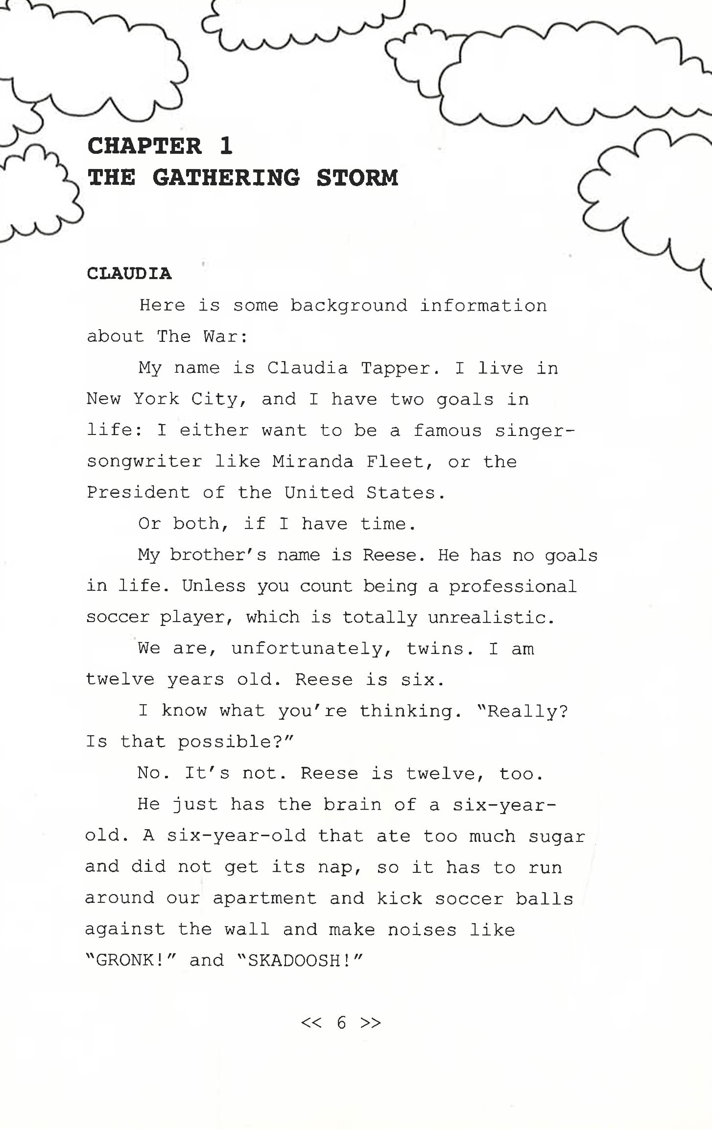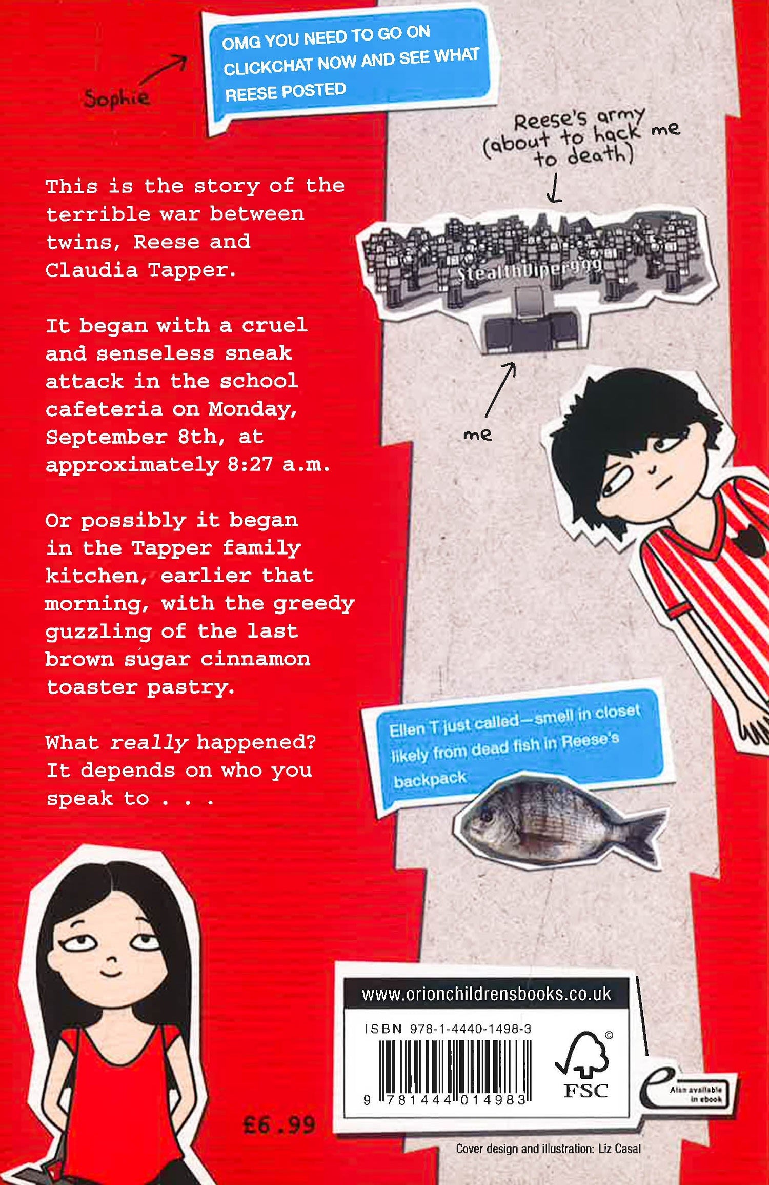 Wars are terrible things. I know this because I've read about a lot of them on Wikipedia. And also because I was just in one. It was me against my brother, Reese. That might not sound like a war to you. Trust me. It was.This is the story of the terrible war between twins, Reese and Claudia Tapper. It began with a cruel and senseless sneak attack in the school cafeteria on Monday, September 8th, at approximately 8:27 a.m. Or possibly it began in the Tapper family kitchen, earlier that morning, with the greedy guzzling of the last brown sugar cinnamon toaster pastry. What really happened? It depends on who you speak to . . .