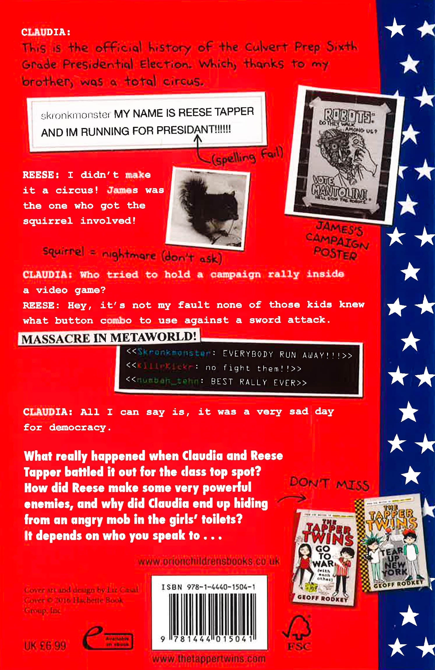 Two kids. One spot for class president. It's election time. The third hilarious Tapper Twins tale from author and scriptwriter, Geoff Rodkey.This is the official account of Claudia and Reese Tapper's battle to be elected president of Culvert Prep Middle School's sixth grade class. Or, more specifically, how Reese made some very powerful enemies and Claudia ended up hiding from an angry mob in the girls' toilets.Nobody said politics was pretty.What really happened when the votes were counted? It depends on who you speak to . . .An up-to-the-minute middle-grade comedy with integrated illustrations, perfect for fans of Diary of a Wimpy Kid.