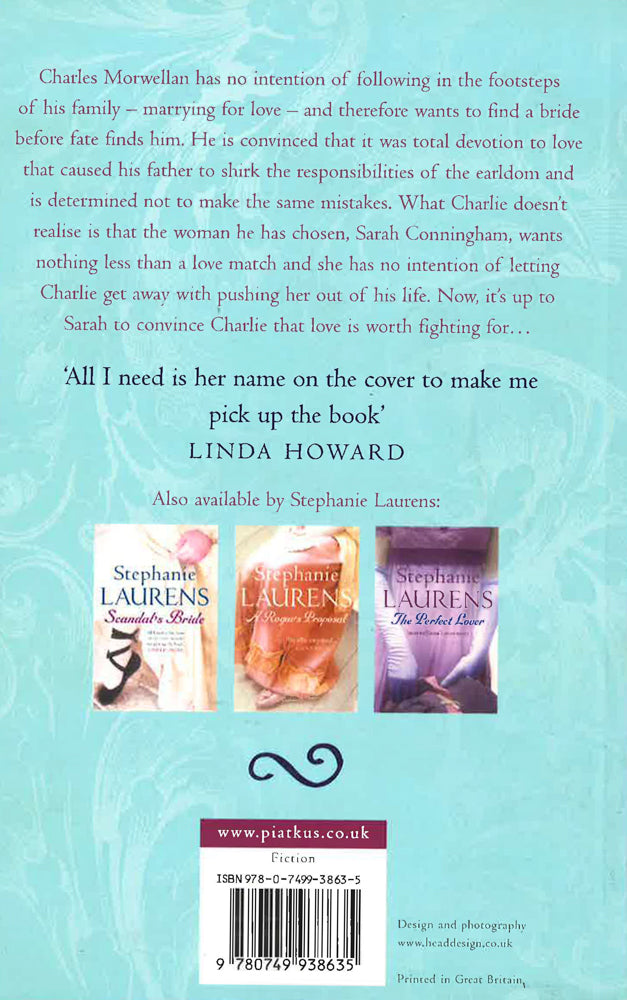 Charles Morwellan has no intention of following in footsteps of his family - marrying for love. He is convinced that it was devotion to love that caused his father to shirk responsibilities of earldom and is determined not to make same mistakes. What he doesn't realise is the woman he chose, Sarah Conningham, wants nothing less than a love match. Welcome to the Regency world of Stephanie Laurens - and to the Cynsters and their ever-expanding clan! Now, Charles Morwellan, who we first meet in A SECRET LOVE (0749937203), one of her most beloved Cynster novels, meets his match in this exciting, and utterly sensuous, story.Charles Morwellan has no intention of following in the footsteps of his family - marrying for love - and therefore wants to find a bride before fate finds him. He is convinced that it was total devotion to love that caused his father to shirk the responsibilities of the earldom and is determined not to make the same mistakes. What Charlie doesn't realise is the woman he chose, Sarah Conningham, wants nothing less than a love match and she has no intention of letting Charlie get away with pushing her out of his life. Now, it's up to Sarah to convince Charlie that you really can have it all.