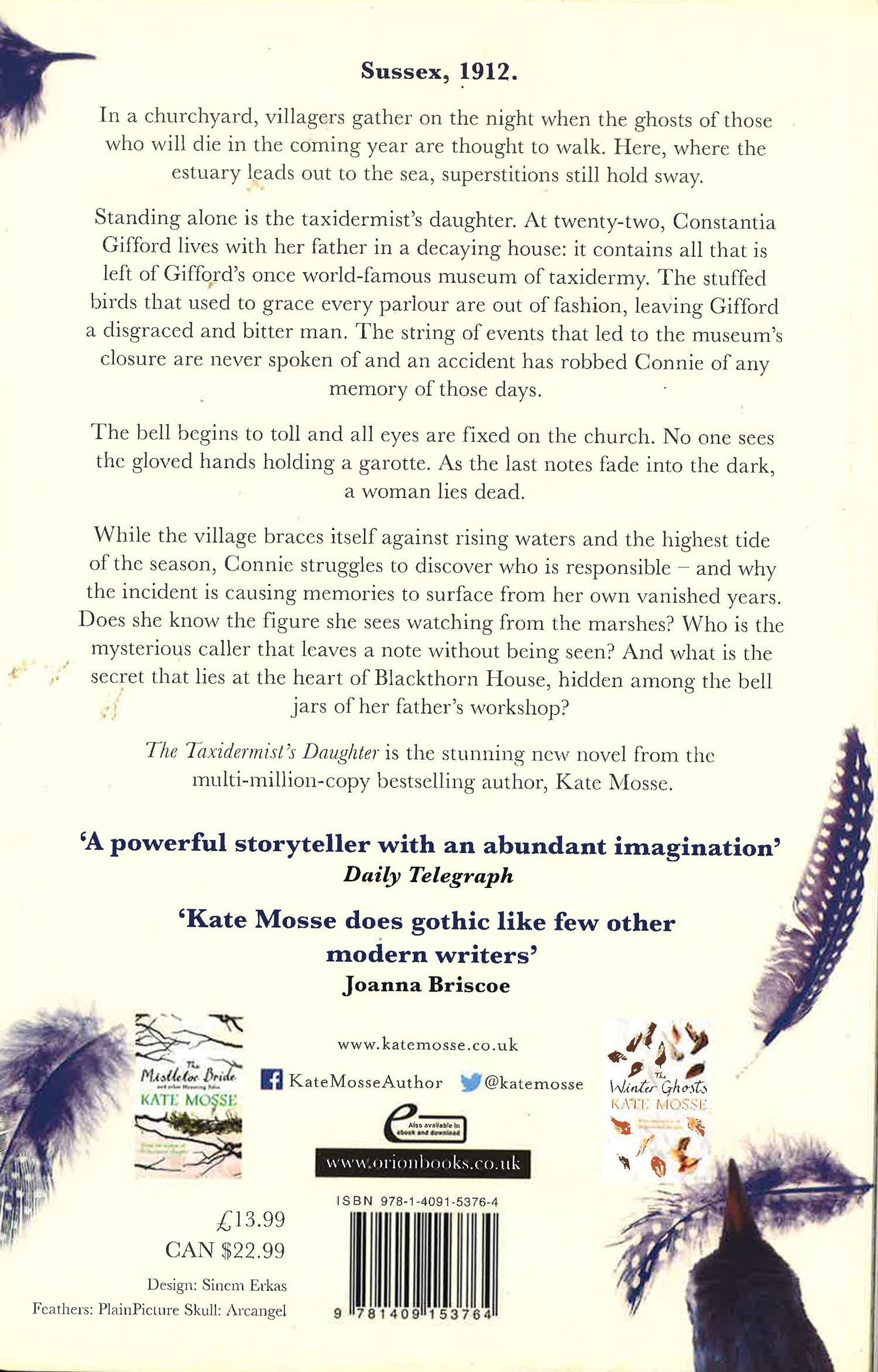 Sussex, 1912. In a churchyard, villagers gather on the night when the ghosts of those who will die in the coming year are thought to walk. Here, where the estuary leads out to the sea, superstitions still hold sway. Standing alone is the taxidermist's daughter. At twenty-two, Constantia Gifford lives with her father in a decaying house: it contains all that is left of Gifford's once world-famous museum of taxidermy. The stuffed birds that used to grace every parlour are out of fashion, leaving Gifford a disgraced and bitter man. The string of events that led to the museum's closure are never spoken of and an accident has robbed Connie of any memory of those days. The bell begins to toll and all eyes are fixed on the church. No one sees the gloved hands holding a garotte. As the last notes fade into the dark, a woman lies dead. While the village braces itself against rising waters and the highest tide of the season, Connie struggles to discover who is responsible - and why the incident is causing memories to surface from her own vanished years. Does she know the figure she sees watching from the marshes? Who is the mysterious caller that leaves a note without being seen? And what is the secret that lies at the heart of Blackthorn House, hidden among the bell jars of her father's workshop? The Taxidermist's Daughter is the stunning new novel from the multi-million copy bestselling author, Kate Mosse.