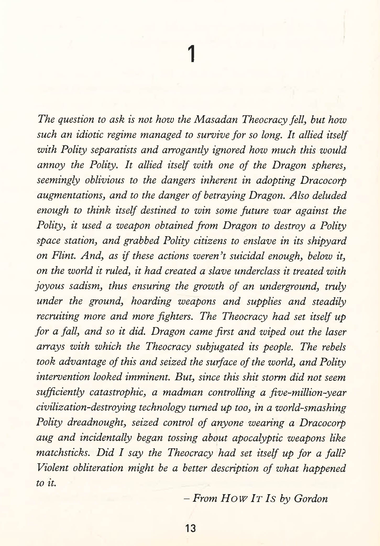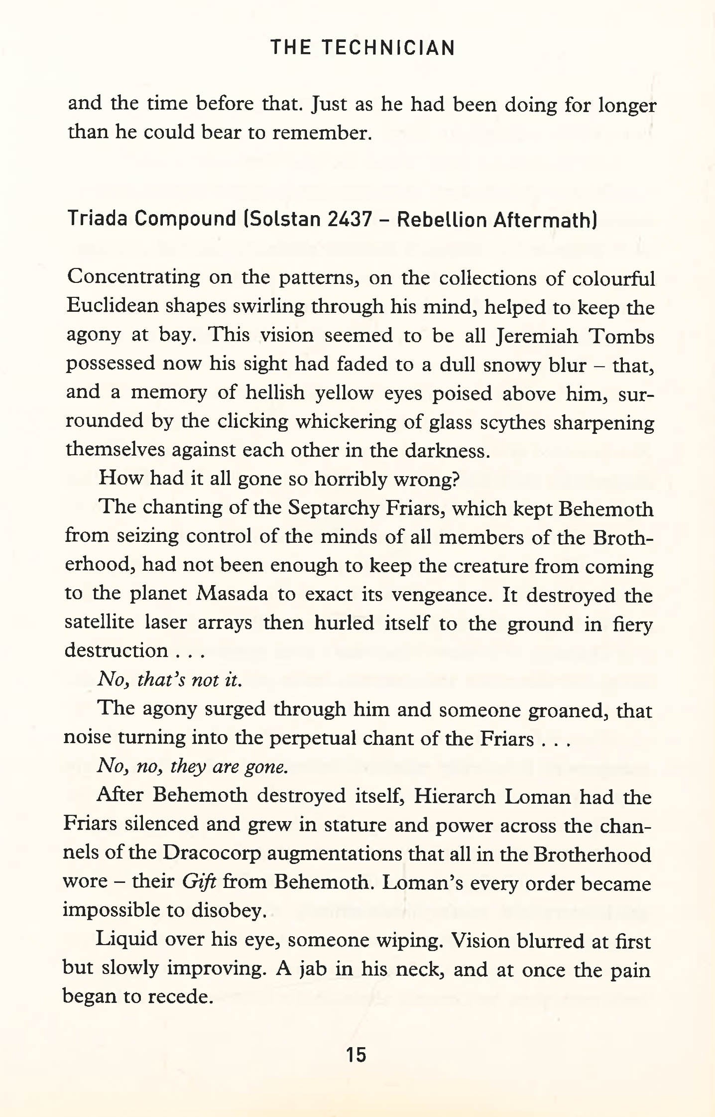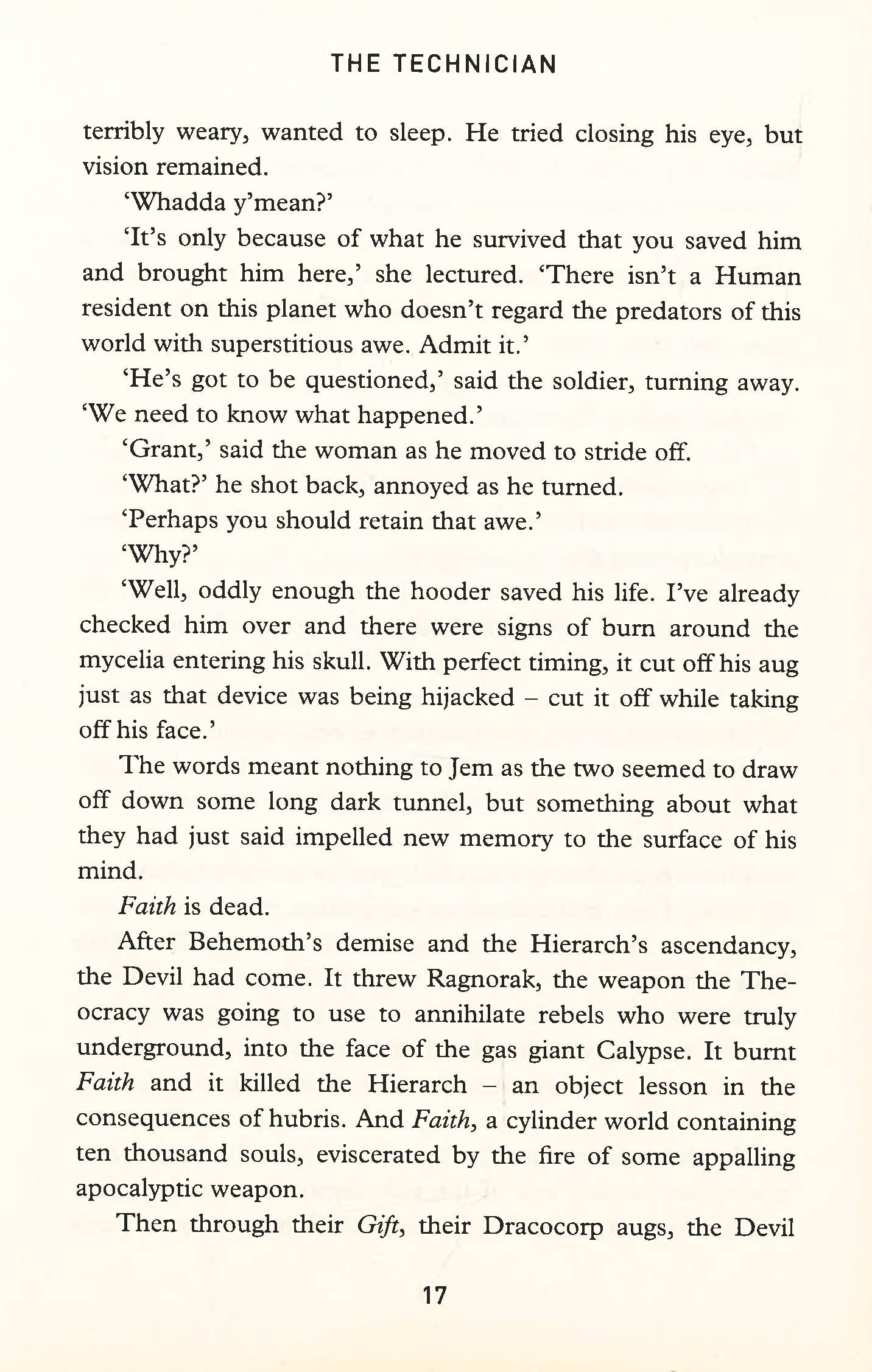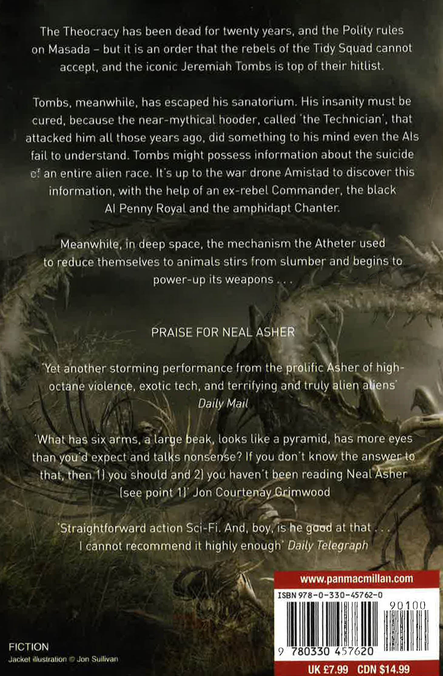 The Theocracy has been dead for twenty years, and the Polity rules on Masada -- but it is an order that the rebels of the Tidy Squad cannot accept, and the iconic Jeremiah Tombs is top of their hitlist. Tombs, meanwhile, has escaped his sanatorium. His insanity must be cured, because the near-mythical hooder, called 'the Technician', that attacked him all those years ago, did something to his mind even the AIs fail to understand. Tombs might possess information about the suicide of an entire alien race. It's up to the war drone Amistad to discover this information, with the help of an ex-rebel Commander, the black AI Penny Royal and the amphidapt Chanter. Meanwhile, in deep space, the mechanism the Atheter used to reduce themselves to animals stirs from slumber and begins to power-up its weapons ...
