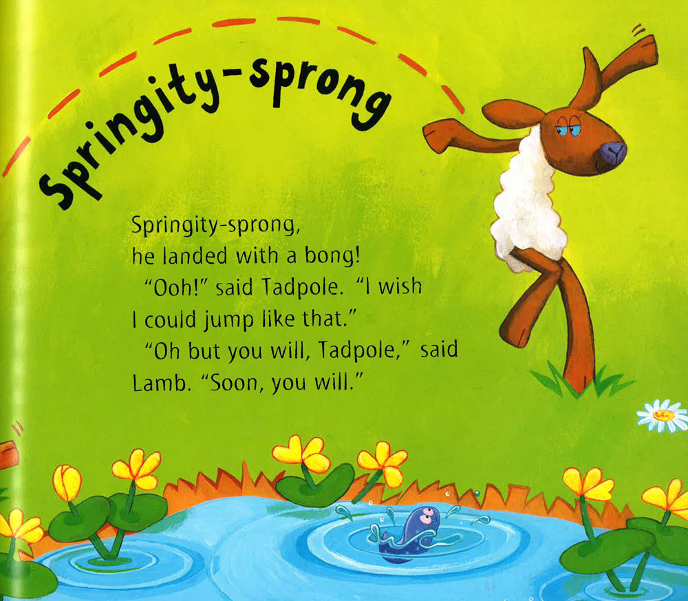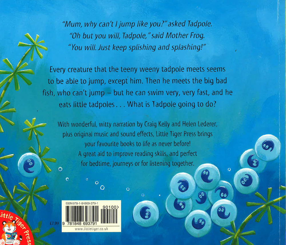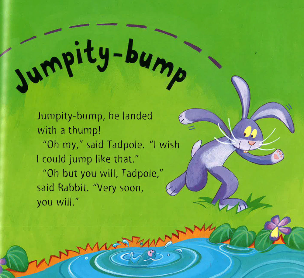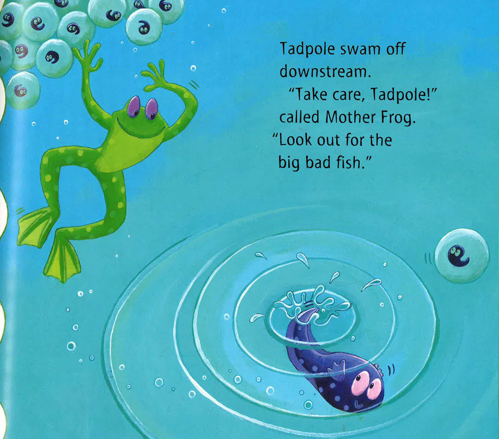Every creature that the teeny weeny tadpole meets seems to be able to jump, except him. Then he meets the big bad fish, who can't jump - but he can swim very fast, and he eats little tadpoles. What is tadpole going to do?
