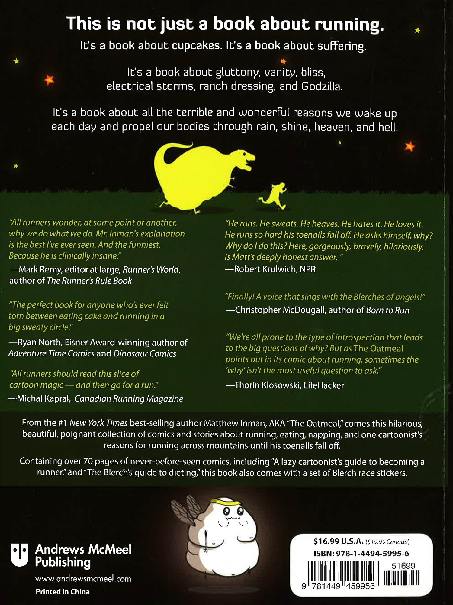 From #1 New York Times best-selling author, Matthew Inman, AKA The Oatmeal, comes this hilarious, beautiful, poignant collection of comics and stories about running, eating, and one cartoonist's reasons for jogging across mountains until his toenails fall off.