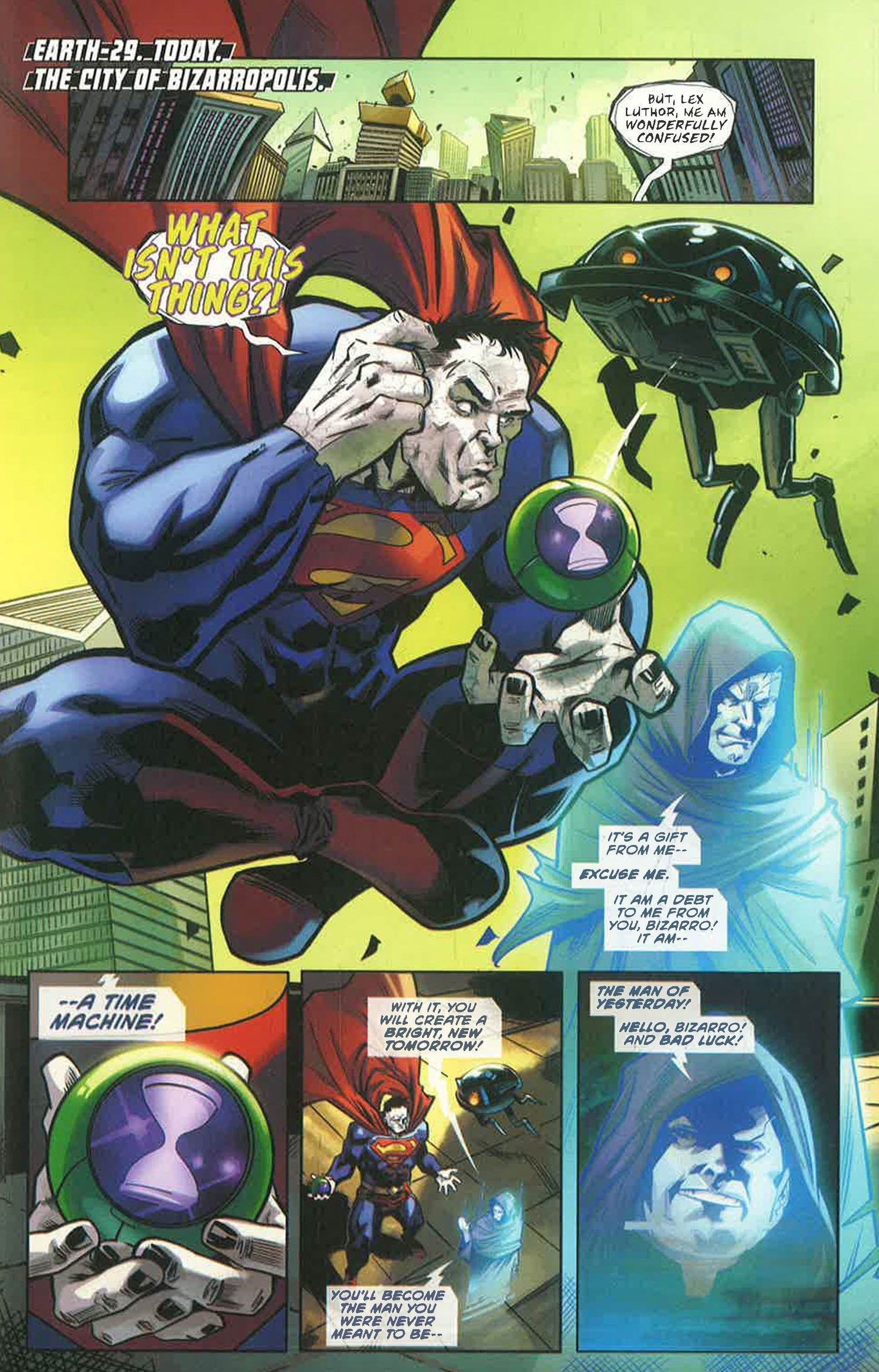 Bizarro, frustrated with the technological progress that never seems to end, has decided that he has had enough. And with the help from a time machine gifted to him by Lex Luthor... he might just get to turn back time.