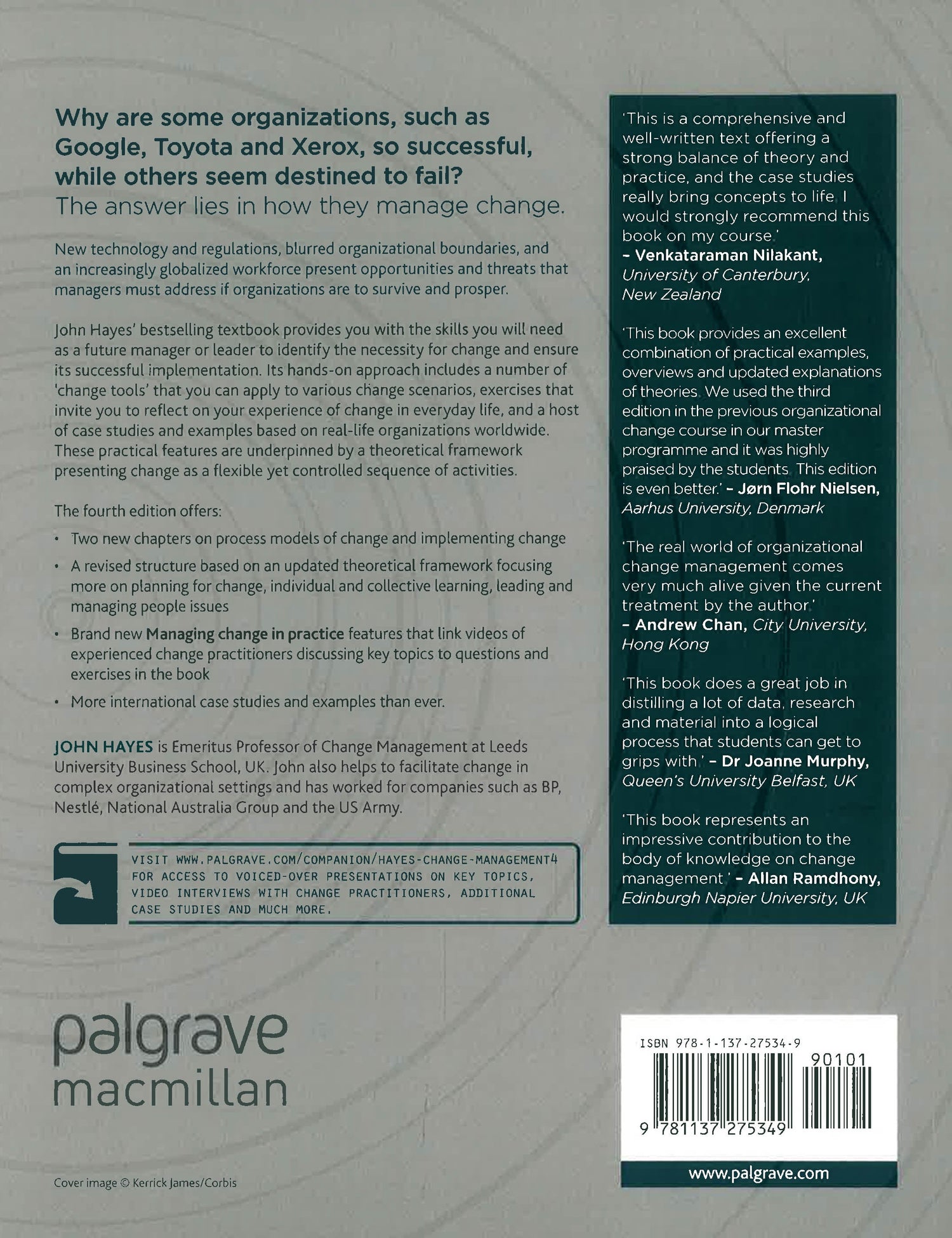 John Hayes’s bestselling textbook equips students with all the skills they will need as future managers to successfully diagnose the need for and implement change. It offers unrivalled breadth, covering all of the key theories, tools and techniques on organisational change. The book is underpinned by a theoretical framework based on a process model of change, which views change as a flexible, yet controlled sequence of events. Offering a strong practical orientation, the book is supported by a comprehensive selection of real-world examples and case studies, as well as `Change Tools’ that invite students to apply theories to real change scenarios.