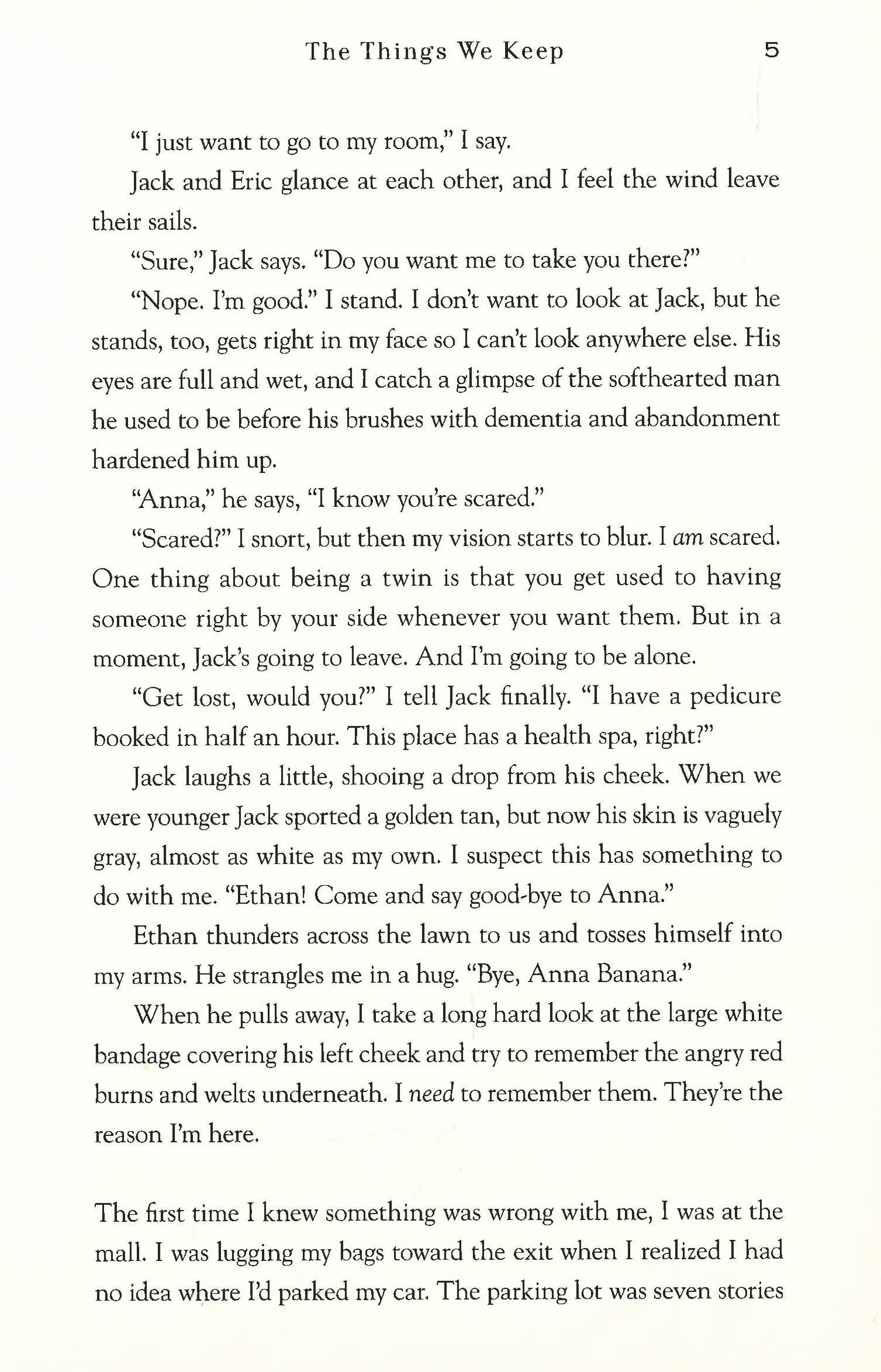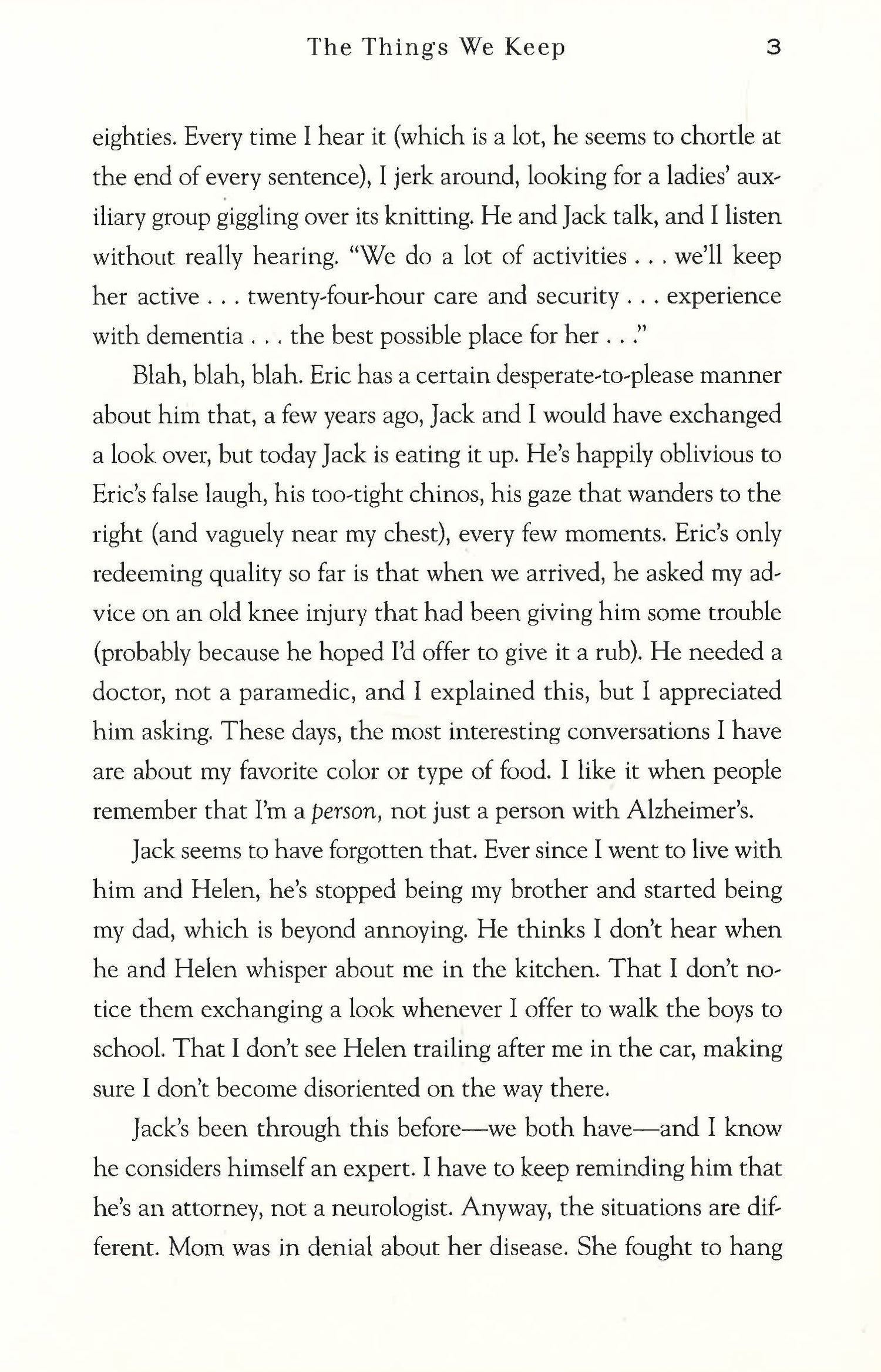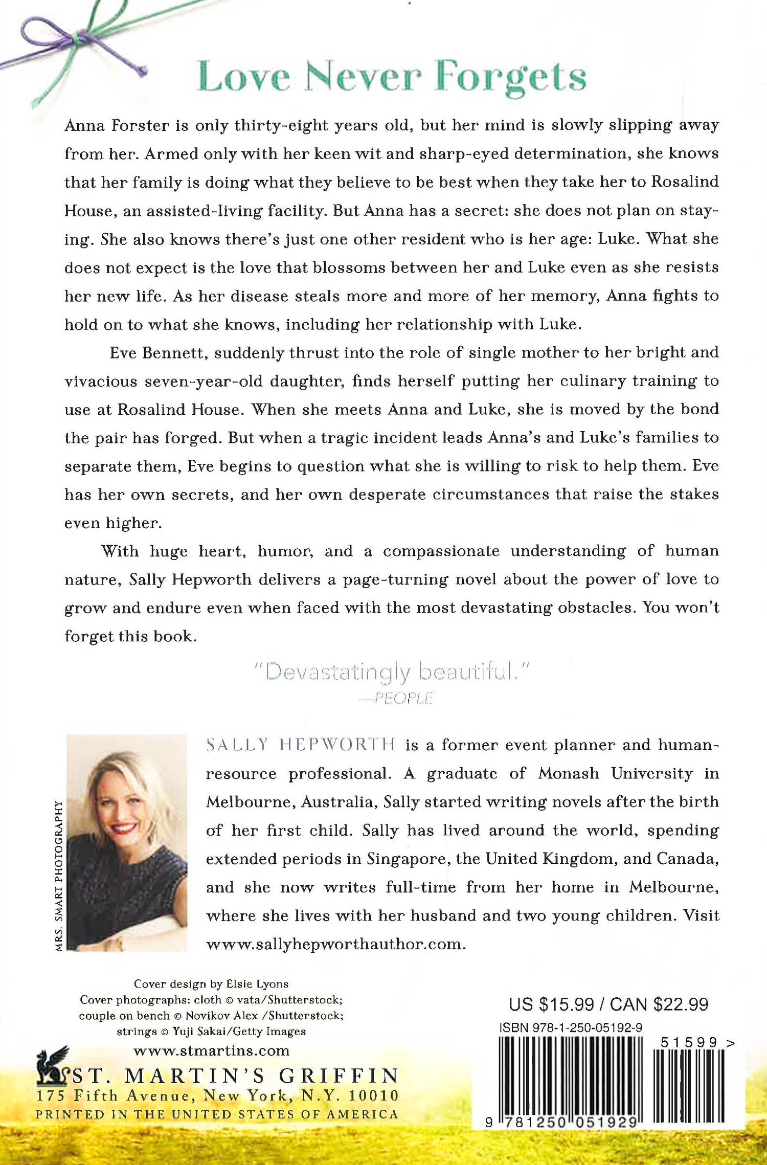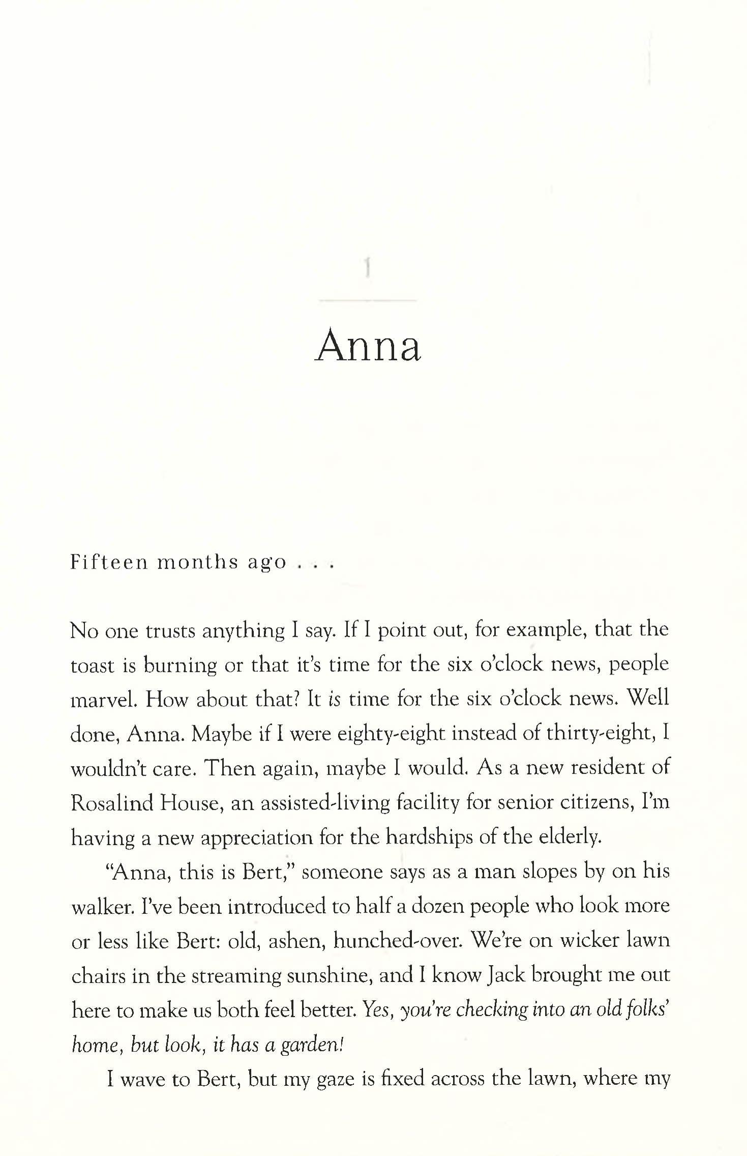 Anna Forster is only thirty-eight years old, but her mind is slowly slipping away from her. Armed only with her keen wit and sharp-eyed determination, she knows that her family is doing what they believe to be best when they take her to Rosalind House, an assisted living facility. But Anna has a secret: she does not plan on staying. She also knows there's just one another resident who is her age, Luke. What she does not expect is the love that blossoms between her and Luke even as she resists her new life. As her disease steals more and more of her memory, Anna fights to hold on to what she knows, including her relationship with Luke.