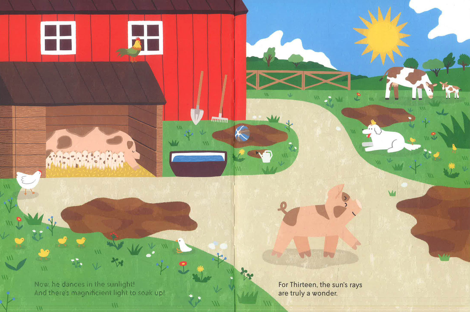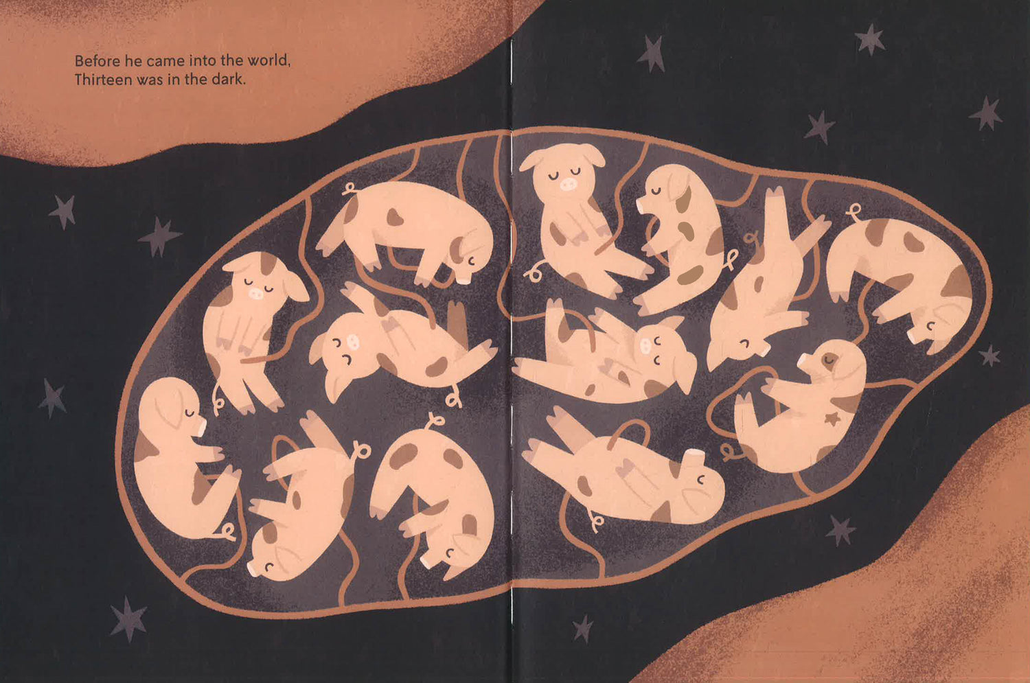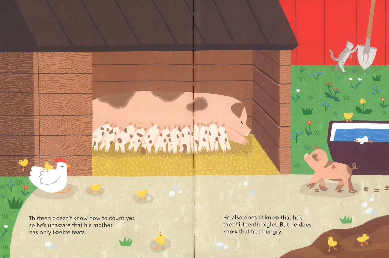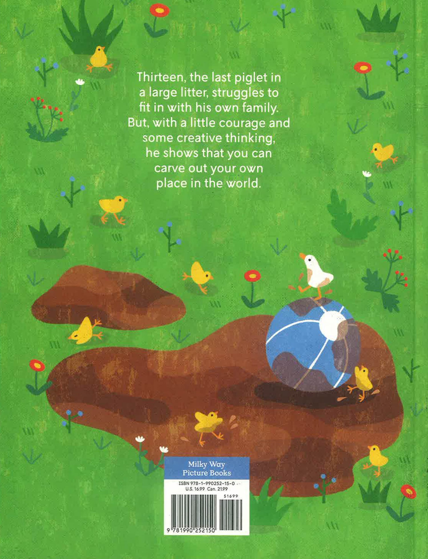 The last piglet of a large litter courageously finds his own sense of belonging Thirteen, the last piglet of a litter of 13, loves to play and help out around the farm. But he soon realizes that his mother can only feed 12 of her piglets at the same time, which, unfortunately, leaves no room for him. Suddenly, life seems very unfair! Gripped by his literal hunger, Thirteen discovers that a different kind of hunger will drive him to find the solution to take his place among his family.
