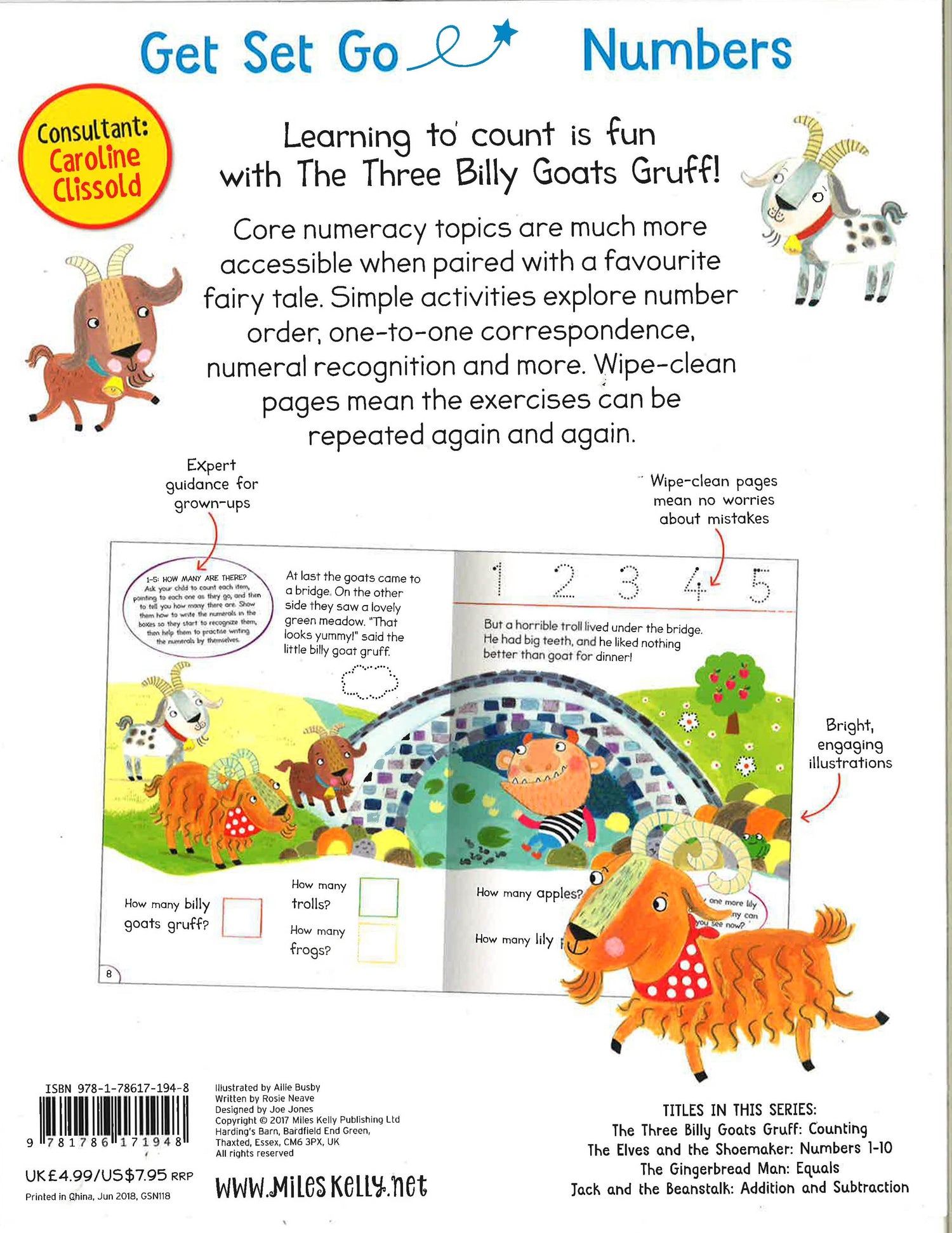 Learning to count is fun with The Three Billy Goats Gruff!Core numeracy topics are much more accessible when paired with a favourite fairy tale. Simple activities explore number order, one-to-one correspondence, numeral recognition and more. Wipe-clean pages mean the exercises can be repeated again and again.