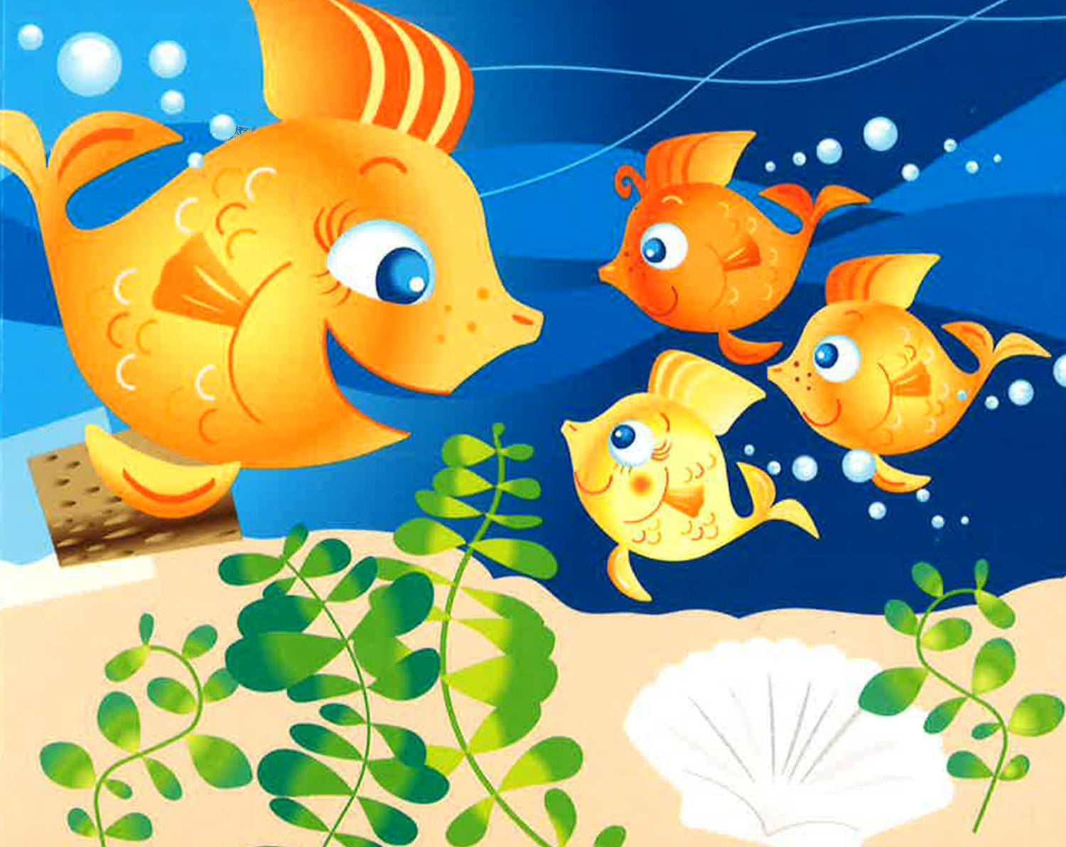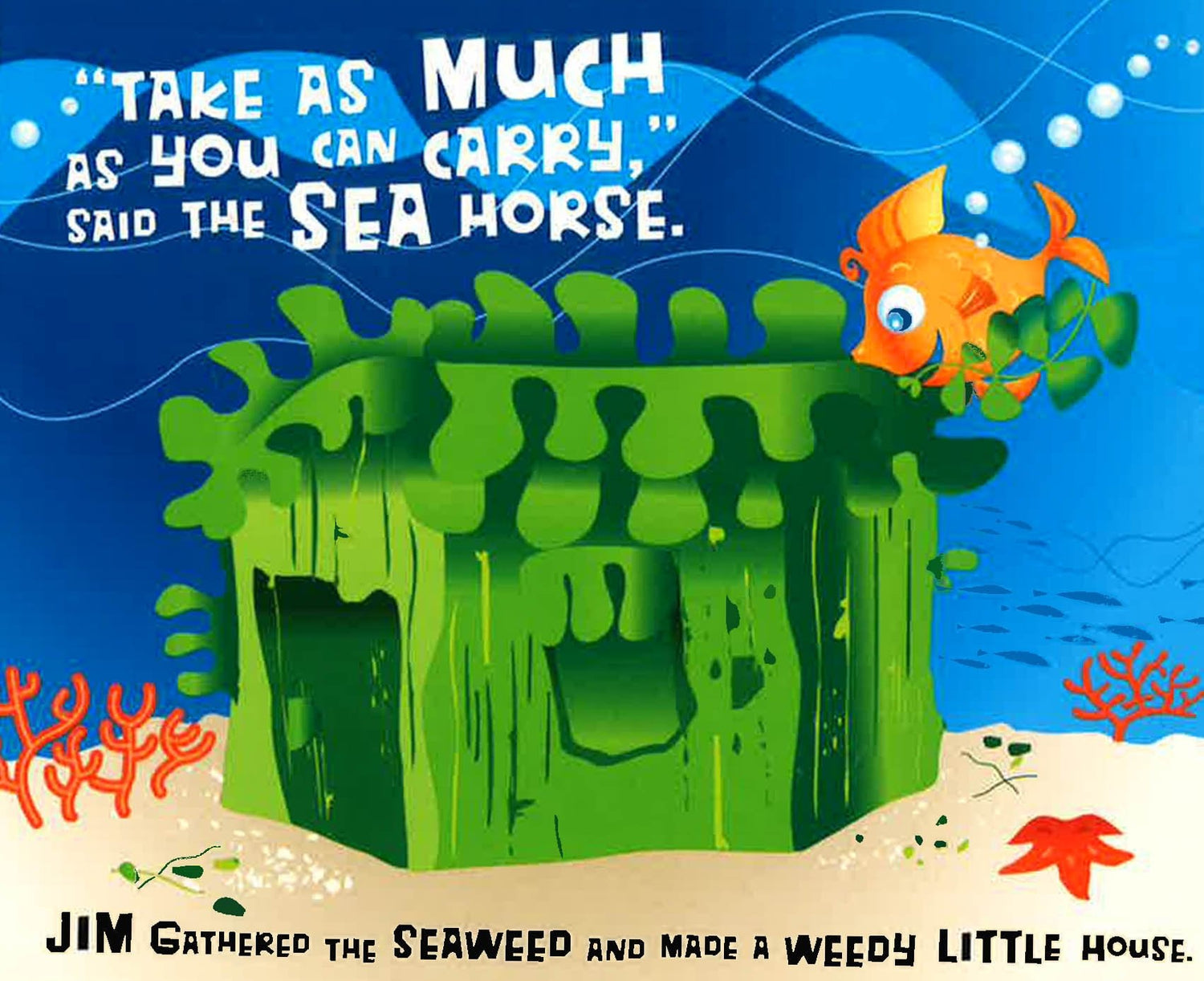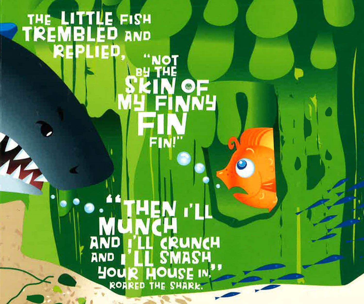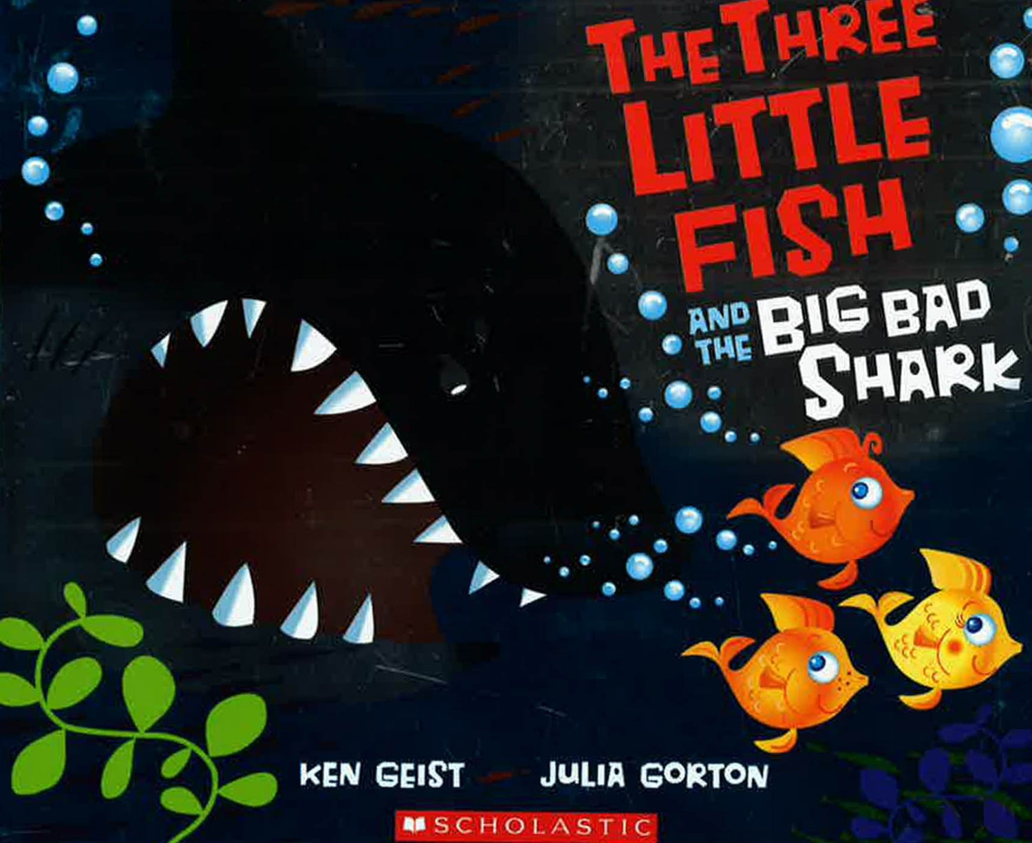 Mama tells her three little fish that it's time to make their own homes. Jim builds his house of seaweed, but the big bad shark munches it up. Tim builds his house of sand, but the shark crunches it up. It's smart Kim who sets up house in an old sunken ship!