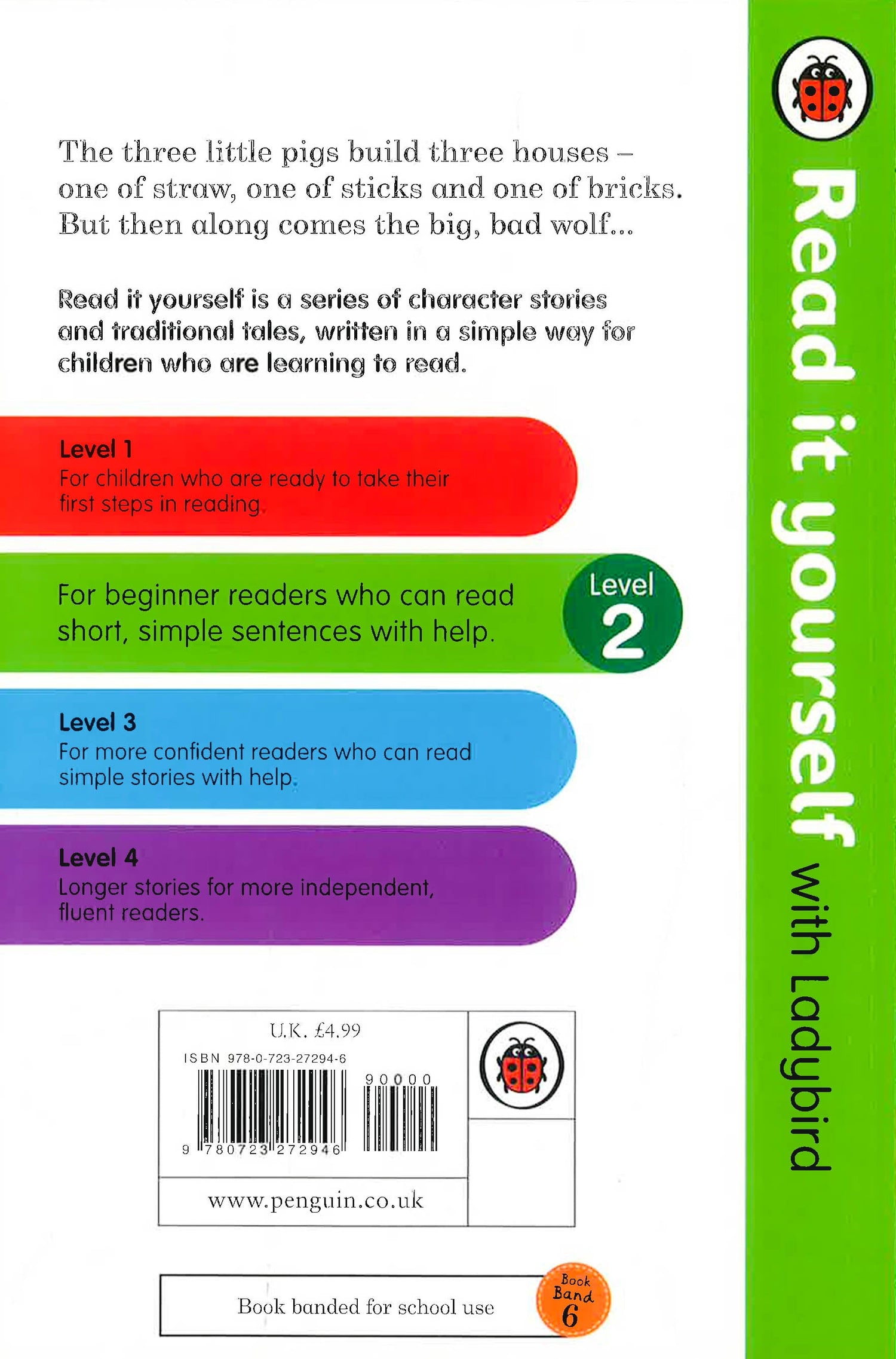 In this classic fairy tale, the three little pigs leave home and build their own houses - one of straw, one of sticks and one of bricks. But what will happen when the big, bad wolf comes calling? Read it yourself with Ladybird is one of Ladybird's best-selling series. For over thirty-five years it has helped young children who are learning to read develop and improve their reading skills. Each Read it yourself book is very carefully written to include many key, high-frequency words that are vital for learning to read, as well as a limited number of story words that are introduced and practised throughout. Simple sentences and frequently repeated words help to build the confidence of beginner readers and the four different levels of books support children all the way from very first reading practice through to independent, fluent reading. Each book has been carefully checked by educational consultants and can be read independently at home or used in a guided reading session at school. Further content includes comprehension puzzles, helpful notes for parents, carers and teachers, and book band information for use in schools. The Three Little Pigs is a Level 2 Read it yourself title, ideal for children who have received some initial reading instruction and can read short, simple sentences with help.