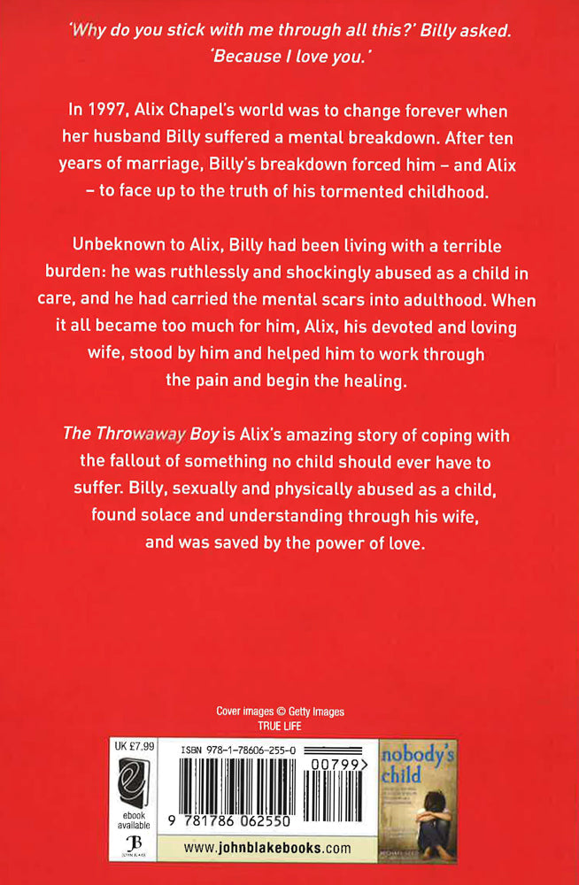 The Throwaway Boy is Alix's amazing story of coping with the fallout of something no child should ever have to suffer. Billy, sexually and physically abused as a child, found solace and understanding through his wife, and was saved by the power of love.'Why do you stick with me through all this?' Billy asked. 'Because I love you.' In 1997, Alix Chapel's world was to change forever when her husband Billy suffered a mental breakdown. After ten years of marriage, Billy's breakdown forced him - and Alix - to face up to the truth of his tormented childhood. Unbeknown to Alix, Billy had been living with a terrible burden: he was ruthlessly and shockingly abused as a child in care, and he had carried the mental scars into adulthood. When it all became too much for him, Alix, his devoted and loving wife, stood by him and helped him to work through the pain and begin the healing.