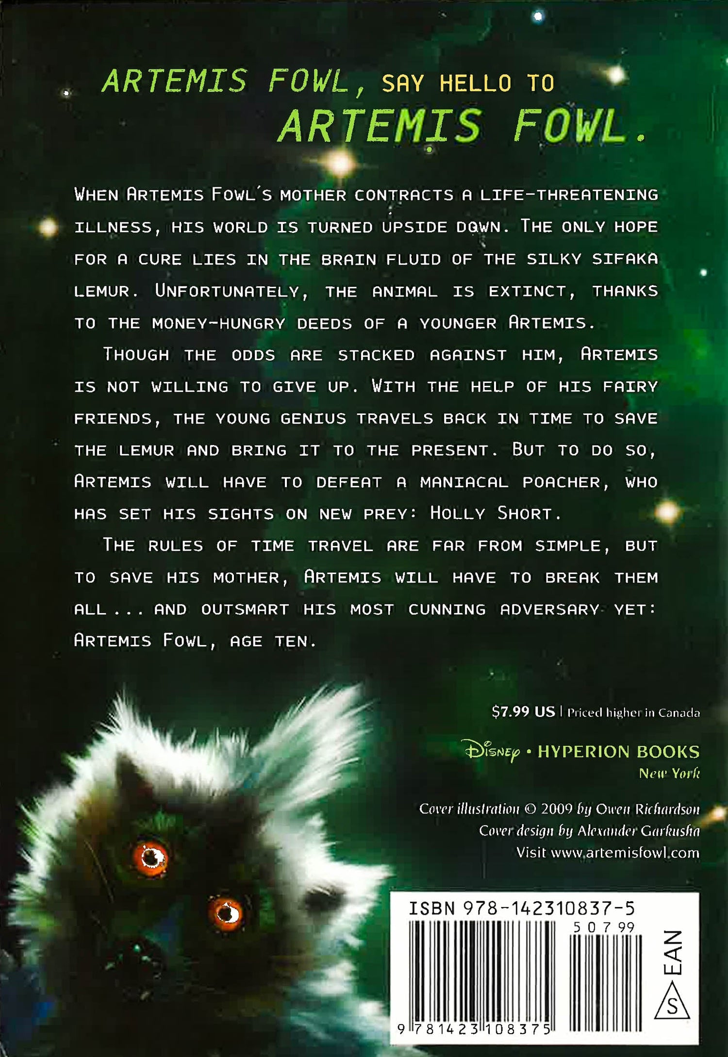 When Artemis Fowl's mother contracts a life-threatening illness, his world is turned upside down. The only hope for a cure lies in the brain fluid of the silky sifaka lemur. Unfortunately, the animal is extinct due to a heartless bargain Artemis himself made as a younger boy. Though the odds are stacked against him, Artemis is not willing to give up. With the help of his fairy friends, the young genius travels back in time to save the lemur and bring it back to the present. But to do so, Artemis will have to defeat a maniacal poacher, who has set his sights on new prey: Holly Short. The rules of time travel are far from simple, but to save his mother, Artemis will have to break them all.and outsmart his most cunning adversary yet: Artemis Fowl, age ten.