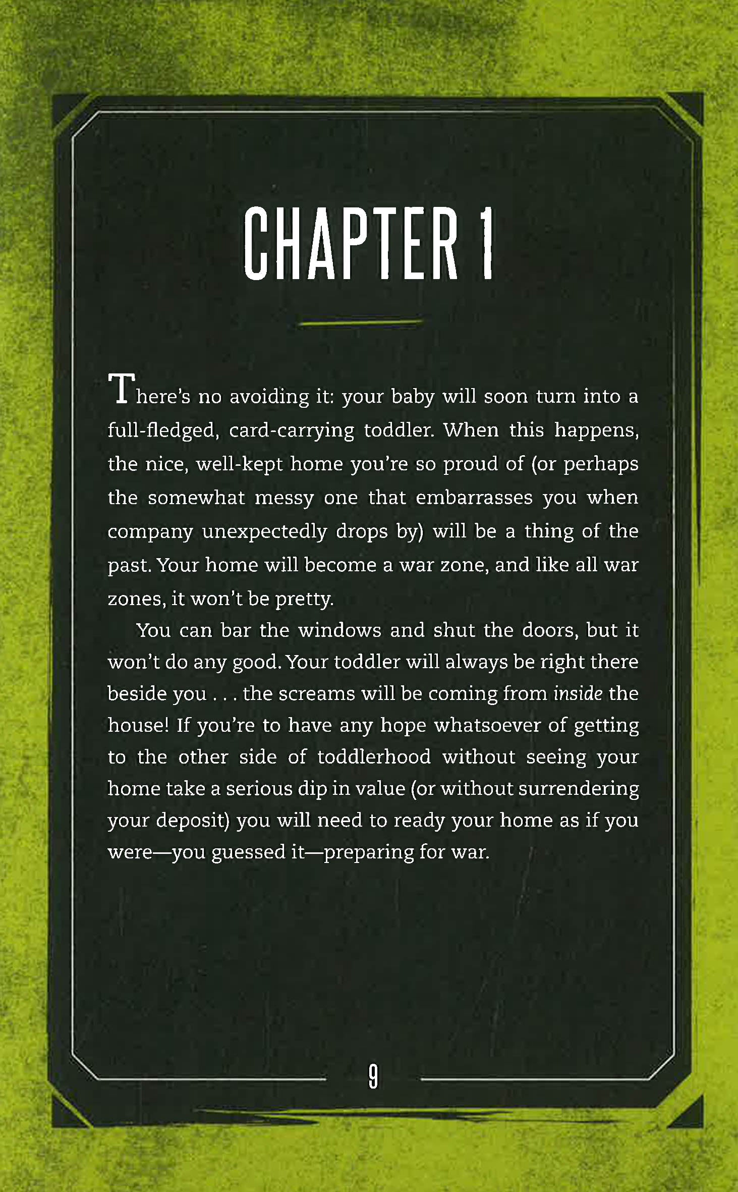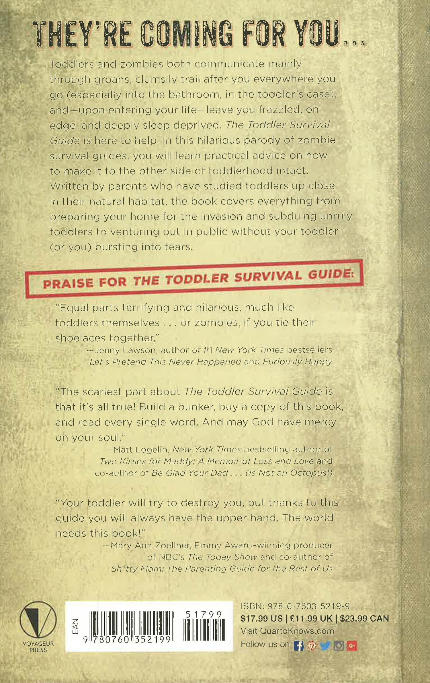 The Toddler Survival Guide is a hilarious parody of Max Brooks's The Zombie Survival Guide (and survival guides in general) that will leave parents laughing out loud even as it provides practical advice on how they can make it to the other side of toddlerhood intact. Written by parents who have studied toddlers up-close in their natural habitat, the book will cover survival skills including how you can outfit your home to outlast a toddler occupation (baby gate, cabinet locks, wine), how you can subdue an angry toddler ("Elmo's Song," mac