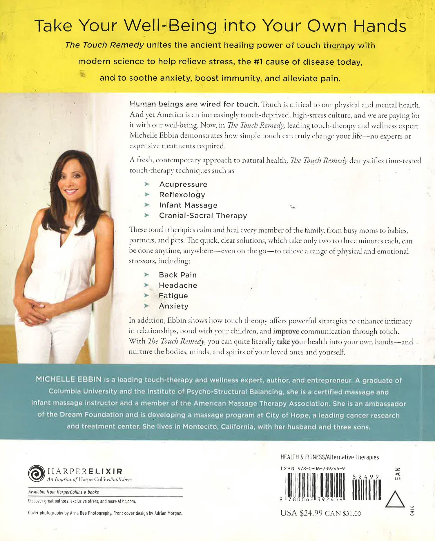 An empowering guide that unites the ancient healing power of touch therapy-from acupressure to reflexology-with modern science to help relieve the number one cause of disease today: stress-and to soothe anxiety, boost immunity, and alleviate pain. Human beings are wired for touch. Touch is critical to our physical and mental health. And for centuries, cultures around the globe have employed touch as a powerful force for healing. And yet America is an increasingly touch-deprived, high-stress culture, and we are paying for it with our wellbeing. Now, in The Touch Remedy, leading touch therapy expert Michelle Ebbin, who appears regularly on The Dr. Oz Show and has been featured on The Doctors, The View, and Live with Kelly & Michael, demonstrates how the ancient wisdom of touch can truly change your life. A fresh, contemporary approach to natural health, which draws on a unique combination of ancient wisdom and cutting edge research, The Touch Remedy is a collection of proven touch therapy solutions to calm and heal every member of the family, from babies to grandparents to pets. Demystifying time-tested touch therapy techniques such as Acupressure, Reflexology, Cranial Sacral Therapy, among others, Ebbin shares her invaluable insight and provides clear, step-by-step remedies, accompanied by beautiful full-color photos, to relieve a range of physical and emotional stressors, from back pain and headache to anxiety. Her solutions are quick, taking only two-to-three minutes each, and easy, requiring only three steps, and most of the remedies can be done anytime, anywhere, even on the go. In addition, Ebbin shows how touch therapy offers powerful strategies to improve intimacy in relationships, bond with your children, and improve communication through touch. With The Touch Remedy, we can quite literally take our health into our own hands-and nurture the bodies, minds, and spirit of our loved ones and ourselves. *This book may have remainder mark*