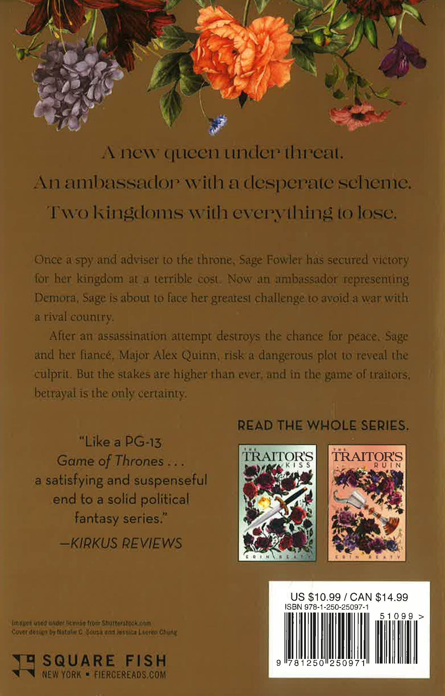 Once a spy and counselor to the throne, Sage Fowler has secured victory for her kingdom at a terrible cost. Now an ambassador representing Demora, Sage faces her greatest challenge to avoid a war with a rival nation. After an assassination attempt destroys the possibility of peace, Sage and her fiancé, Major Alex Quinn, make a dangerous gamble to reveal the culprit. But the stakes are higher than ever, and in the game of traitors, betrayal is the only certainty. Unlikely alliances are forged and loyalties are stretched to the breaking point in the stunning conclusion to the Traitor’s Trilogy.