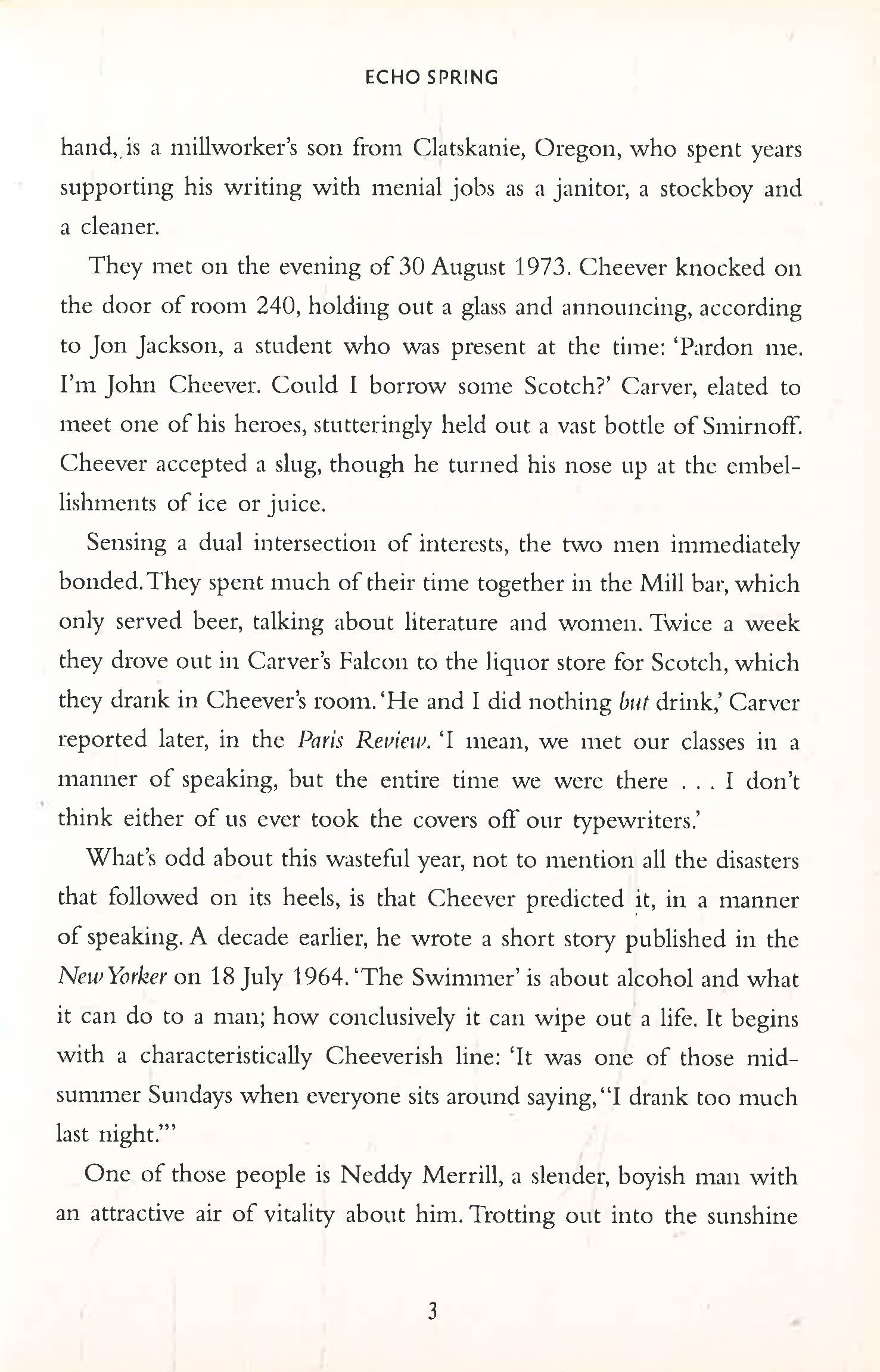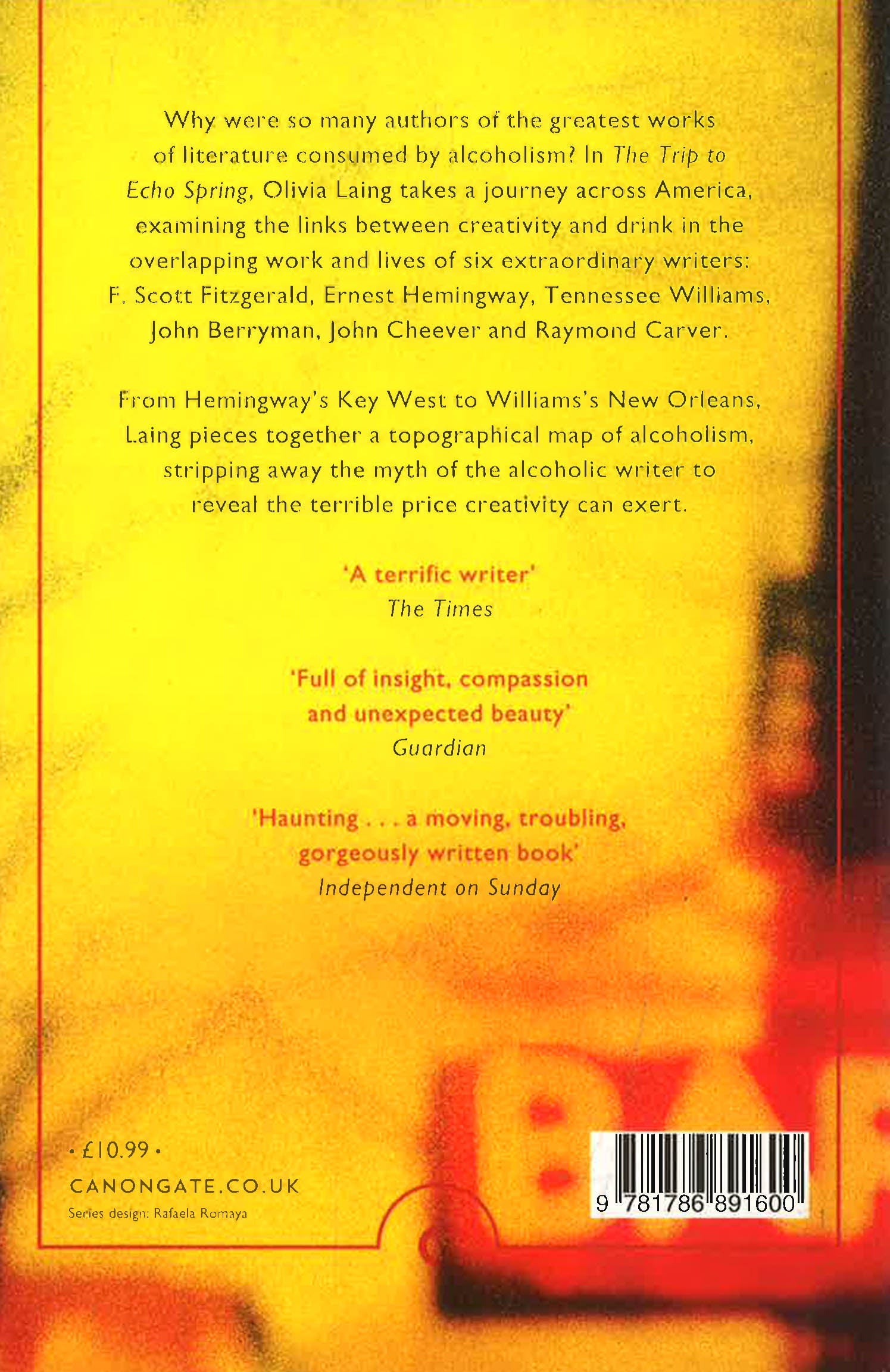 Why were so many authors of the greatest works of literature consumed by alcoholism? In The Trip to Echo Spring, Olivia Laing takes a journey across America, examining the links between creativity and drink in the overlapping work and lives of six extraordinary men: F. Scott Fitzgerald, Ernest Hemingway, Tennessee Williams, John Berryman, John Cheever and Raymond Carver. From Hemingway's Key West to Williams's New Orleans, Laing pieces together a topographical map of alcoholism, and strips away the tangle of mythology to reveal the terrible price creativity can exert.