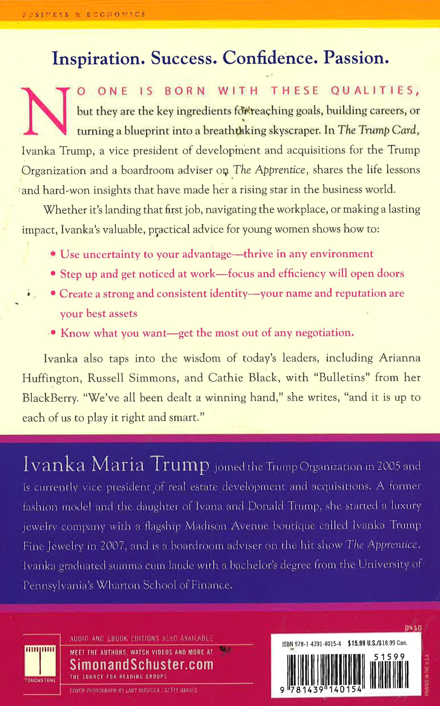 From the daughter of business mogul Donald Trump and a rising star in the Trump organization, this New York Times bestseller is a business book for young women on how to achieve success in any field, based upon what Ivanka Trump has learned from her father and from her own experiences. Inspiration. Success. Confidence. Passion. No one is born with these qualities, but they are the key ingredients for reaching goals, building careers, or taking a blueprint and turning it into a breathtaking skyscraper. In "The Trump Card", Ivanka Trump recounts the compelling story of her upbringing as the ultimate Apprentice, the daughter of Donald and Ivana Trump, and shares the life lessons and hard-won insights that have made her a rising star in the business world. Whether it's landing that first job, navigating the workplace, or making a lasting impact, Ivanka's valuable, practical advice for young women shows how to: - Use uncertainty to your advantag thrive in any environment - Step up and get noticed at work focus and efficiency will open doors - Create a strong and consistent identity your name and reputation are your best assets - Know what you want--get the most out of any negotiation. Ivanka also taps into the wisdom of today's leaders, including Arianna Huffington, Russell Simmons, and Cathie Black, with "Bulletins" from her BlackBerry. "We've all been dealt a winning hand," she writes, "and it is up to each of us to play it right and smart. *This book may have remainder mark*