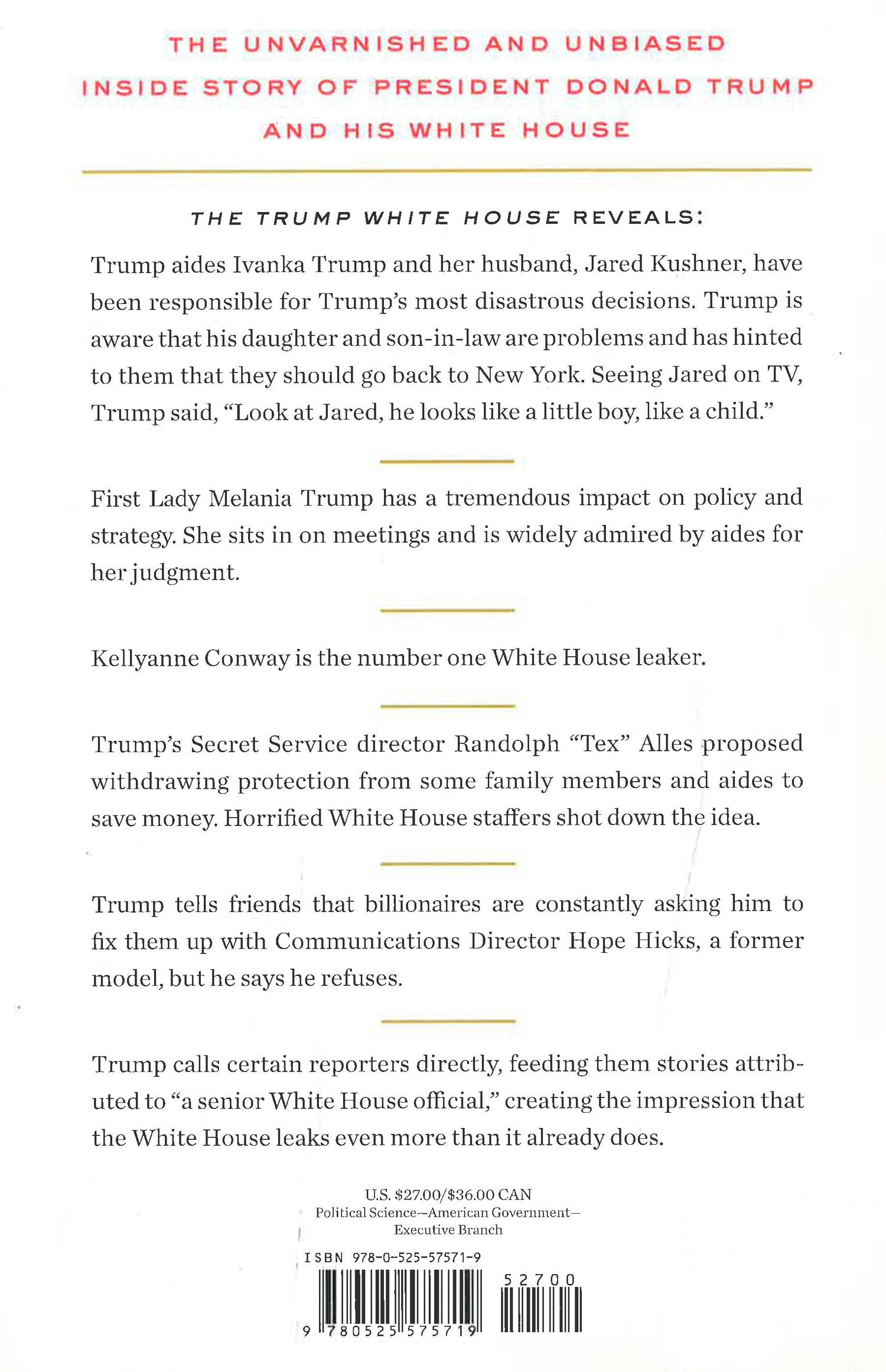 • Trump aides Ivanka Trump and her husband Jared Kushner have been responsible for Trump’s most disastrous decisions. Trump is aware that his daughter and son-in-law are problems and has hinted to them that they should go back to New York. Seeing Jared on TV, Trump said, “Look at Jared, he looks like a little boy, like a child.”