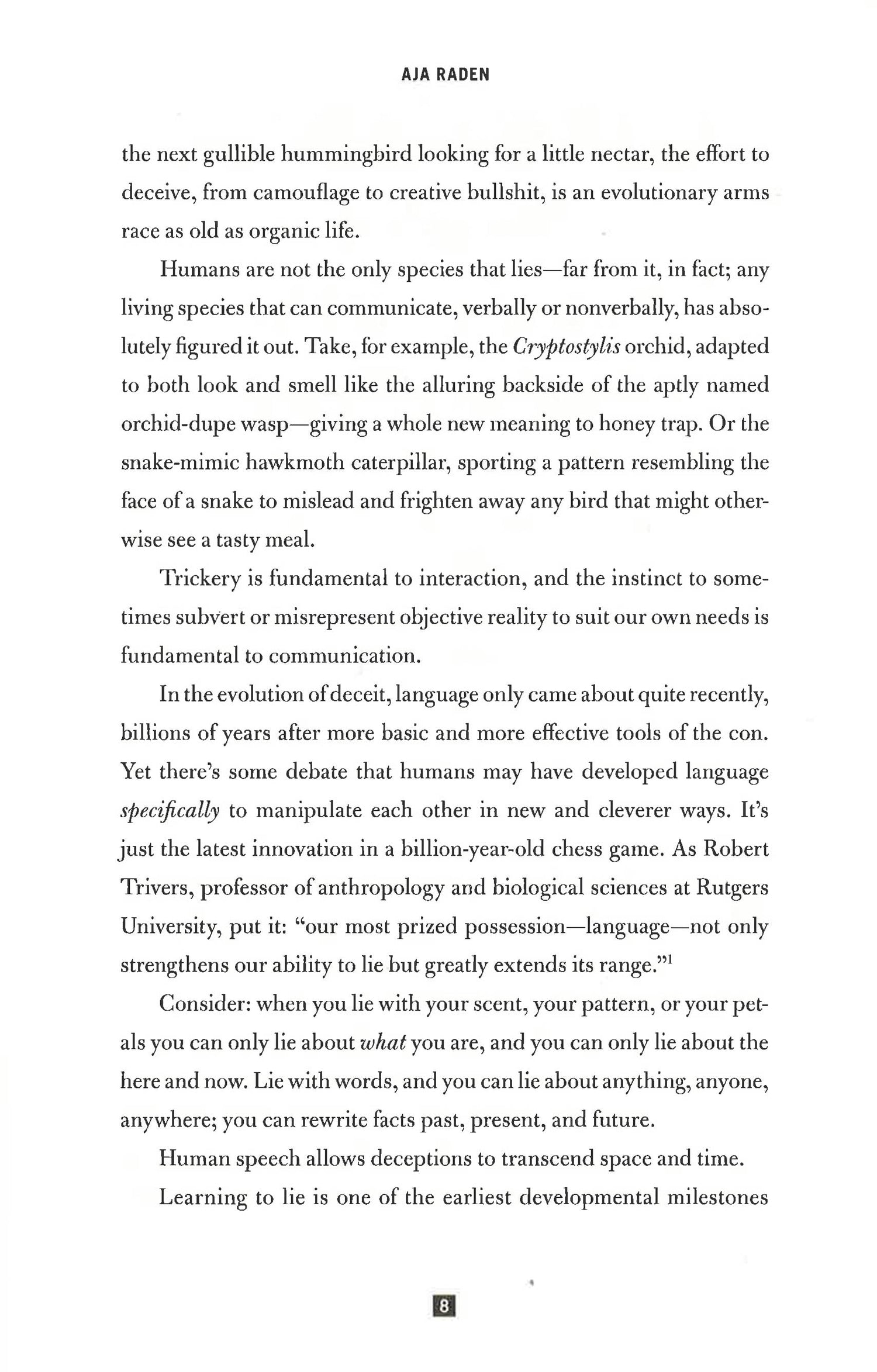 Lying is pervasive. So pervasive that we have almost as many words for it as the Aleutians have for snow: prevaricating, fibbing, stretching the truth, of omission, of commission. Dividing her large topic into three sections - The Lies We Tell Each Other, The Lies We Tell Ourselves, and The Lies We All Agree to Believe - Raden's book is as much about belief as about deceit. Buttressed by a winning mixture of history, psychology and science, Raden explores everything from swindles to cons to the long game to the big lie, including: -Why anyone still plays a shell game and gambles when they know the house is stacked against them -Goldbricking and the misleading nature of "facts" -Why faith and fraud are so closely connected -Hoaxes, hysteria and the madness of crowds -Why we're all probably part of a pyramid scheme -How the truth can sometimes sound like a lie A zippy, funny, and informed history that adds fresh detail even to well-known stories (we all remember what Orson Welles' "War of the Worlds" radio broadcast hoax was, but did you know that a number people committed suicide when they heard the aliens were upon us?), Raden's book is more primer than morality play. As she writes in her introduction: "Not that you're gonna do it, but if you were gonna do it, here's how you'd do it."