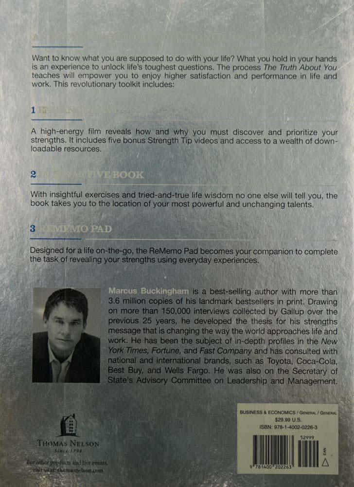 An Experience to Revolutionize Your Life from Marcus Buckingham - the World's Leading Expert on Career Success!" Want to know what you are supposed to do with your life? "The Truth About You" is an experience to unlock life's toughest questions. The process this revolutionary toolkit teaches will create higher satisfaction and performance in life and work. This cutting-edge product includes: Enhanced DVD. A high-energy film reveals how and why you must discover and prioritize your strengths and includes access to a wealth of downloadable resources, including five bonus Strength Tip videos. Interactive Book. With insightful exercises and tried-and-true life wisdom no one else will tell you, the book takes you to the location of your most powerful and unchanging talents. ReMemo Pad. Designed for a life on-the-go, the ReMemo Pad becomes your companion to complete the task of revealing your strengths using your everyday experiences. Perfect for high school and college students, young professionals, and people simply wanting to revitalize their career, "The Truth About You" helps you develop the kind of clarity and passion that drives a successful and satisfying future. Marcus Buckingham will help you discover the real truth, the truth about you . . . it will be your secret to success.