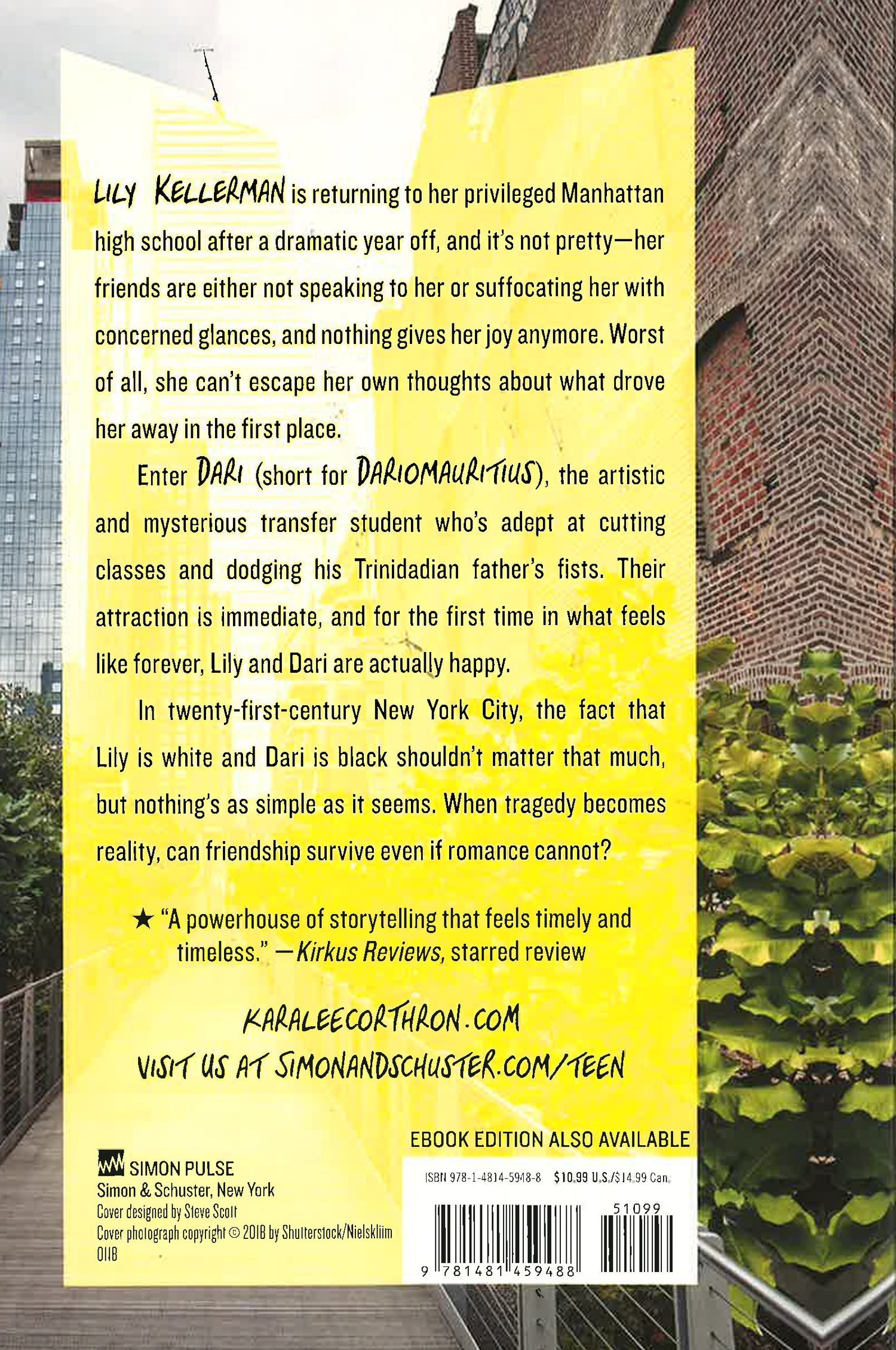 Lily is returning to her privileged Manhattan high school after a harrowing end to her sophomore year and it’s not pretty. She hates chemistry and her spiteful lab partner, her friends are either not speaking to her or suffocating her with concerned glances, and nothing seems to give her joy anymore. Worst of all, she can’t escape her own thoughts about what drove her away from everyone in the first place.Enter Dari (short for Dariomauritius), the artistic and mysterious transfer student, adept at cutting class. Not that he’d rather be at home with his domineering Trinidadian father. Dari is everything that Lily needs: bright, creative, honest, and unpredictable. And in a school where no one really stands out, Dari finds Lily’s sensitivity and openness magnetic. Their attraction ignites immediately, and for the first time in what feels like forever, Lily and Dari find happiness in each other.In twenty-first-century New York City, the fact that Lily is white and Dari is black shouldn’t matter that much, but nothing’s as simple as it seems. When tragedy becomes reality, can friendship survive even if romance cannot?