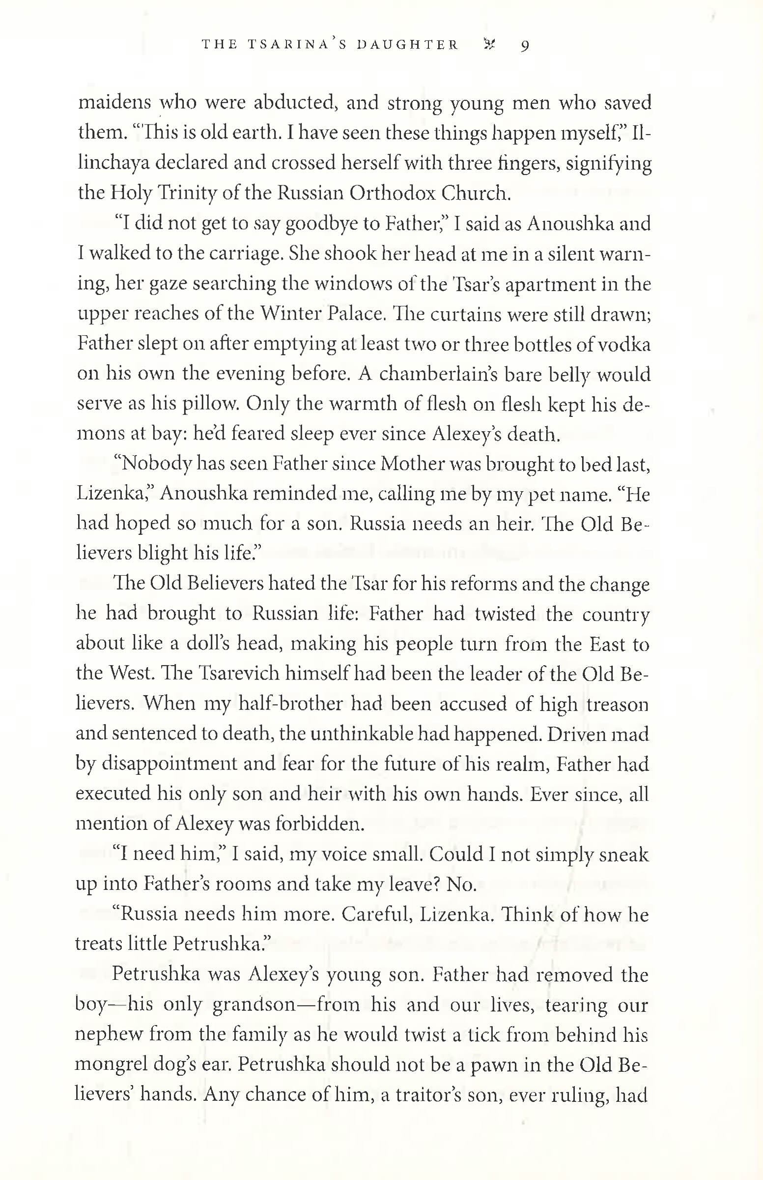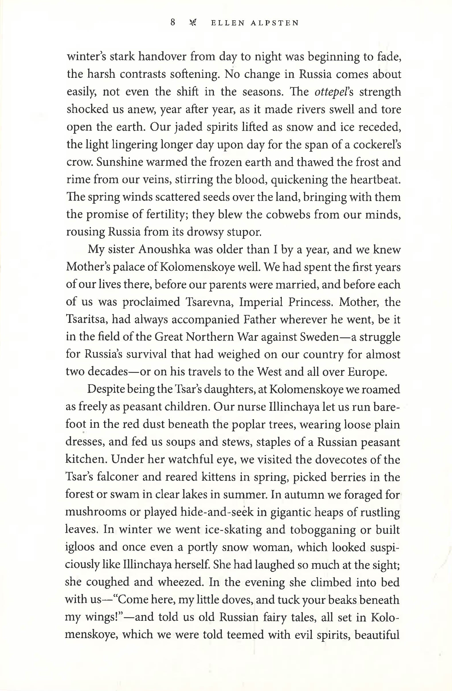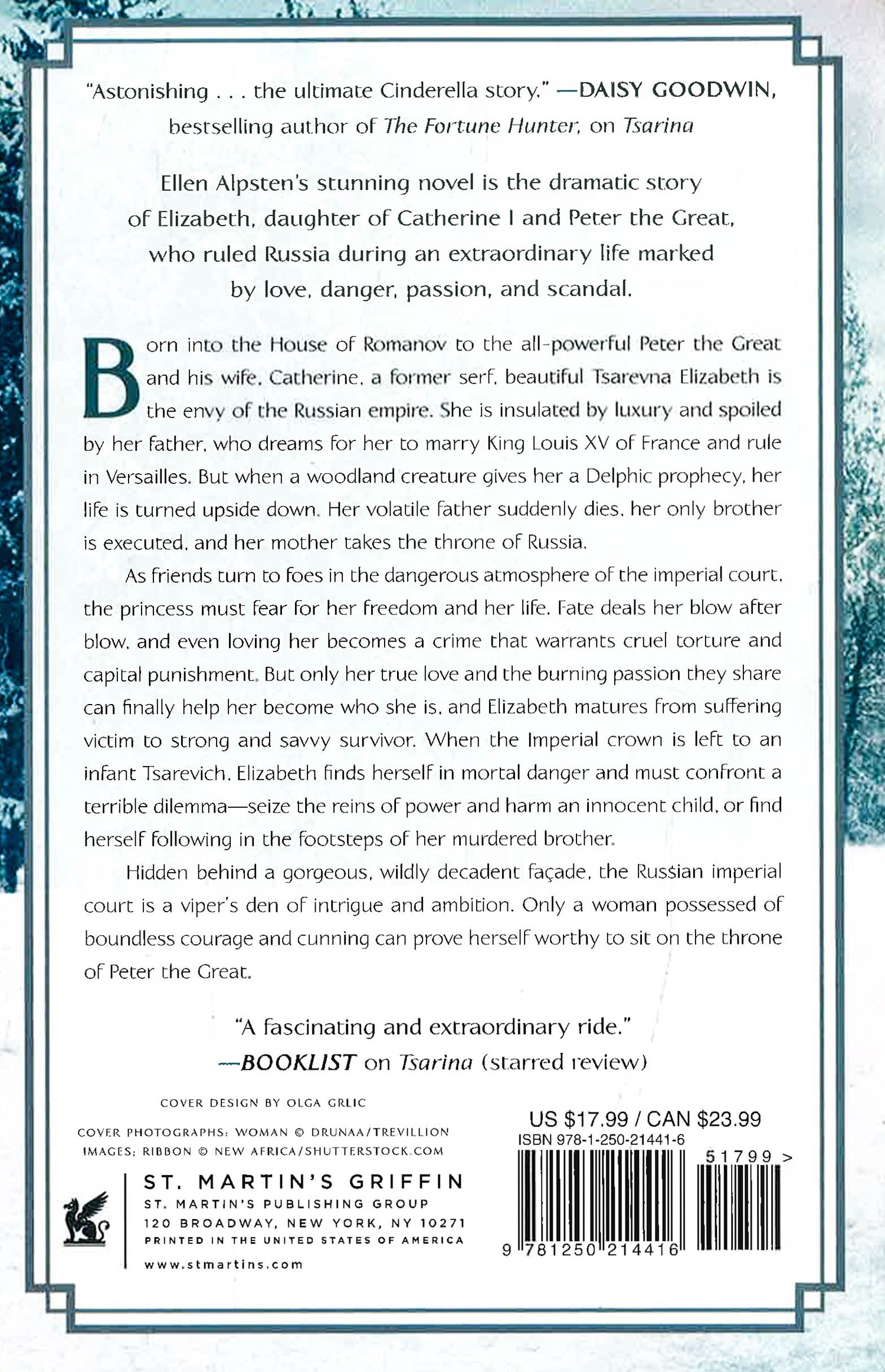 Ellen Alpsten's stunning novel, The Tsarina's Daughter, is the dramatic story of Elizabeth, daughter of Catherine I and Peter the Great, who ruled Russia during an extraordinary life marked by love, danger, passion and scandal.