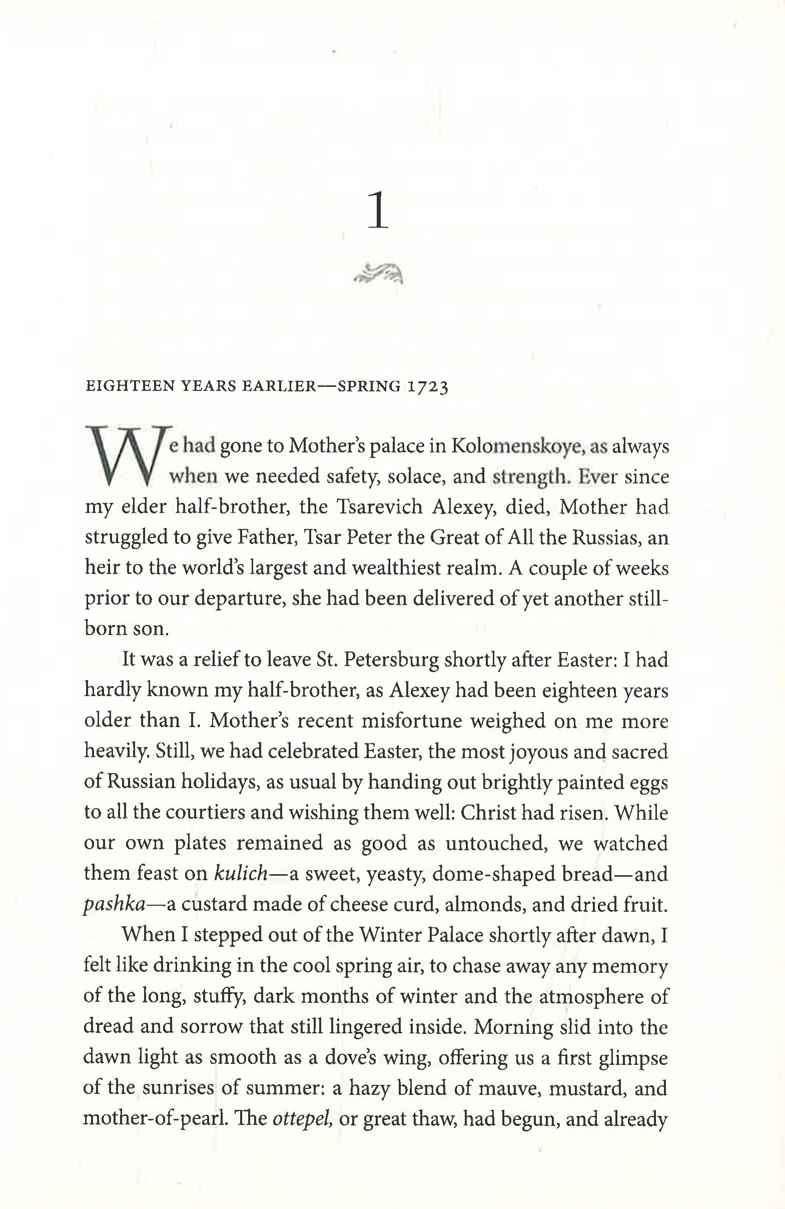 Born into the House of Romanov to the all-powerful Peter the Great and his wife, Catherine, a former serf, beautiful Tsarevna Elizabeth is the envy of the Russian empire. She is insulated by luxury and spoiled by her father, who dreams for her to marry King Louis XV of France and rule in Versailles. But when a woodland creature gives her a Delphic prophecy, her life is turned upside down. Her volatile father suddenly dies, her only brother has been executed and her mother takes the throne of Russia.