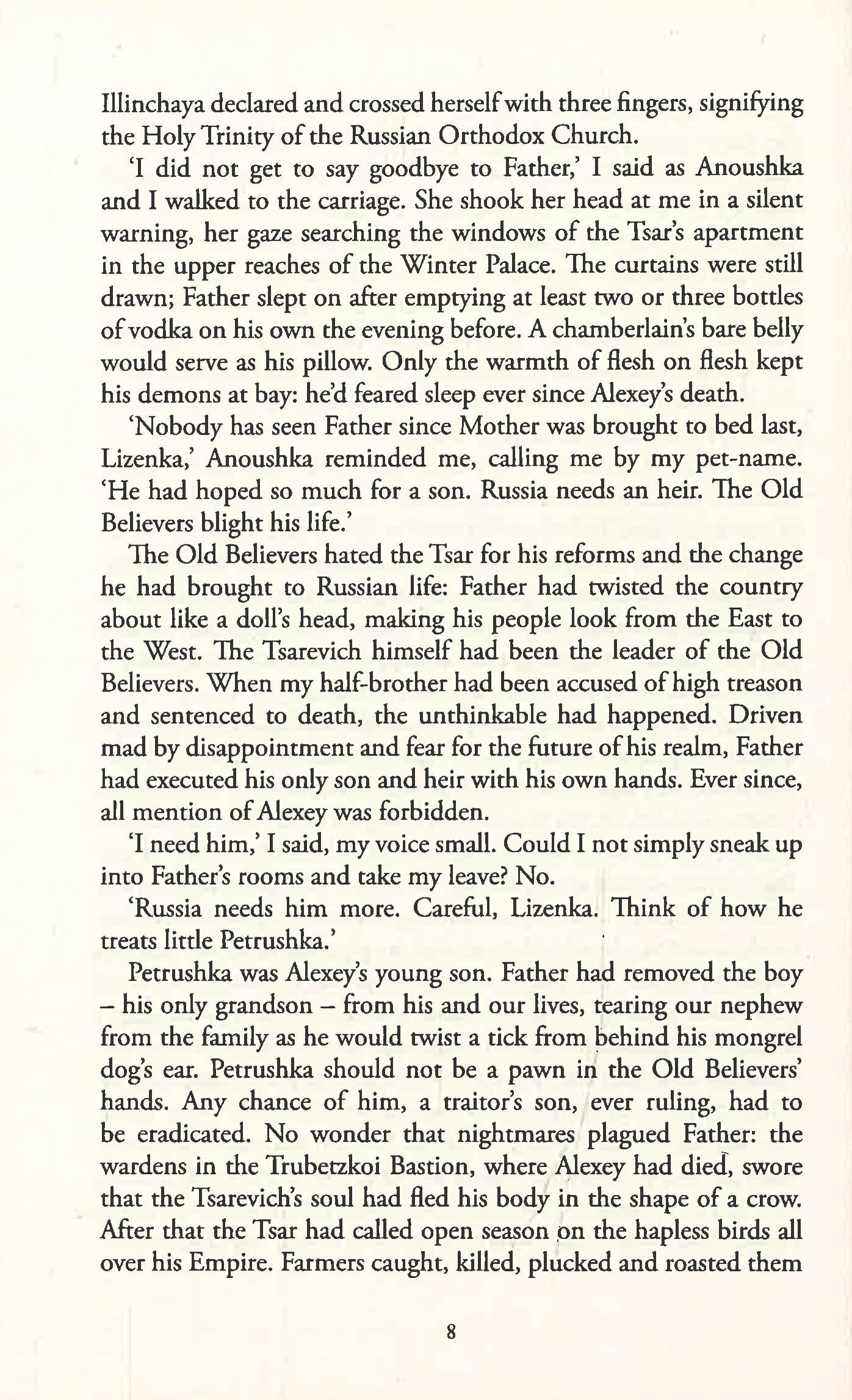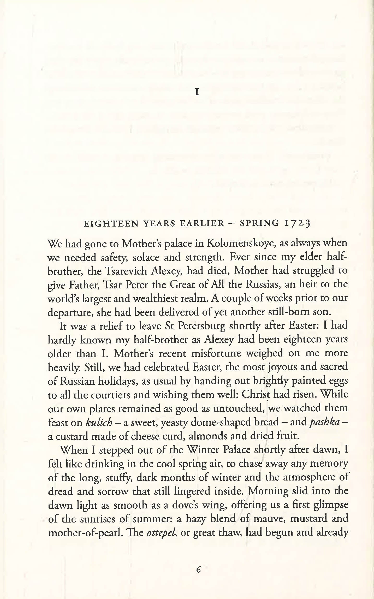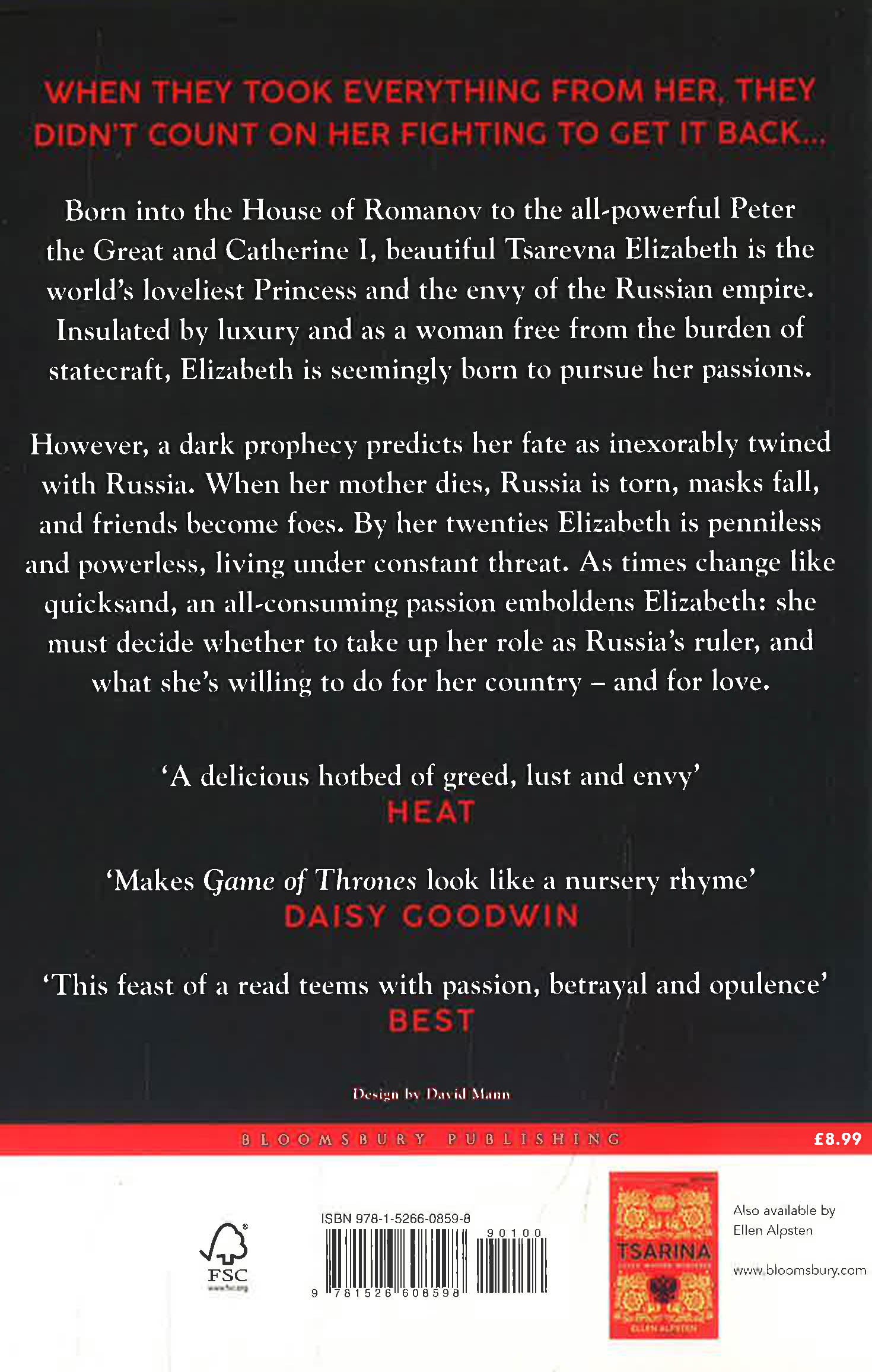 Discover the highly acclaimed historical fiction series set within the glittering and ruthless House of Romanov. ‘Gripping … Who would not want to spend more time in the mad, bad world of the Romanovs?’ The Times ‘A delicious hotbed of greed, lust and envy’ Heat ----------- When they took everything from her, they didn't count on her fighting to get it back... Born into the House of Romanov to the all-powerful Peter the Great and Catherine I, beautiful Tsarevna Elizabeth is the world’s loveliest Princess and the envy of the Russian empire. Insulated by luxury and as a woman free from the burden of statecraft, Elizabeth is seemingly born to pursue her passions. However, a dark prophecy predicts her fate as inexorably twined with Russia. When her mother dies, Russia is torn, masks fall, and friends become foes. Elizabeth’s idyllic world is upended. By her twenties she is penniless and powerless, living under constant threat. As times change like quicksand, an all-consuming passion emboldens Elizabeth: she must decide whether to take up her role as Russia’s ruler, and what she’s willing to do for her country – and for love. ----------- Praise for Tsarina ‘It makes Game of Thrones look like a nursery rhyme’ Daisy Goodwin ‘A vivid page-turner of a debut’ The Times ‘Tsarina should come with a health warning – once you start reading, it’s impossible to stop’ Hannah Rothschild
