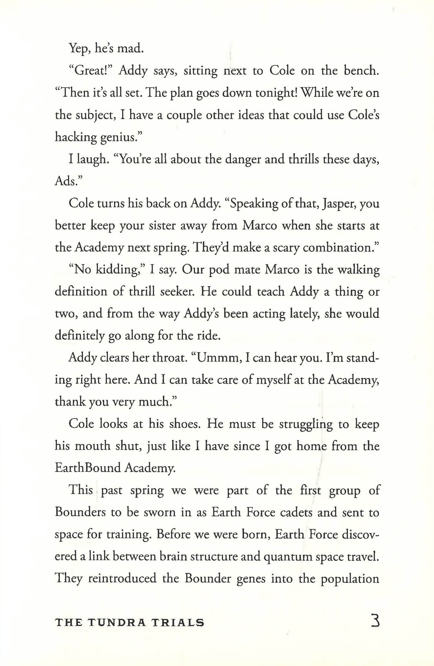Jasper learns that secrets can strain even the strongest bonds as the Bounders adventure continues in The Tundra Trials.After discovering that Earth Force is waging a covert alien war, Jasper and his friends return to space and continue their training. This time, Earth Force brings them to the remote planet of Gulaga, where the cadets compete in the Tundra Trials: a grueling pod race across the planet’s frigid landscape.But when their pod leader asks Jasper and Mira to secretly test a dangerous new technology that will take their Bounder abilities to the next level, the kids begin to suspect that there are rifts within Earth Force. The worst part? Jasper must keep the truth from everyone - even his own pod mates.When Earth Force prepares for an attack against the aliens, the kids are tasked with a treacherous mission. With their loyalties torn, will Jasper and his friends once again fulfill their duty and fight for their planet? And if they do, will the secret tech work as planned or lead their enemies to their doorstep?