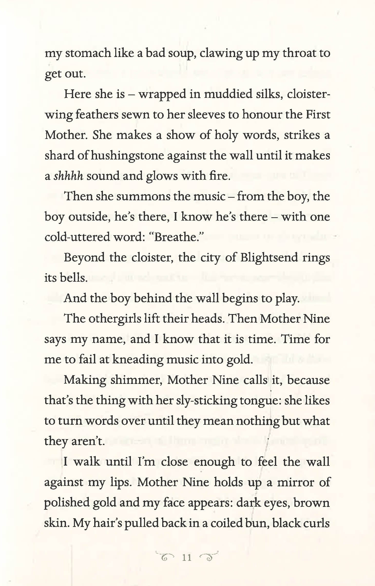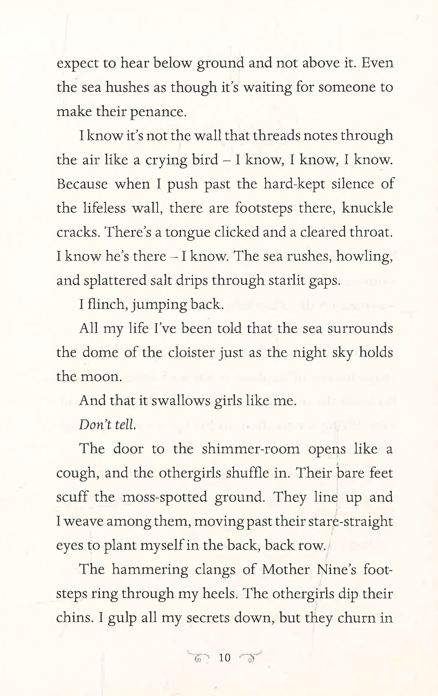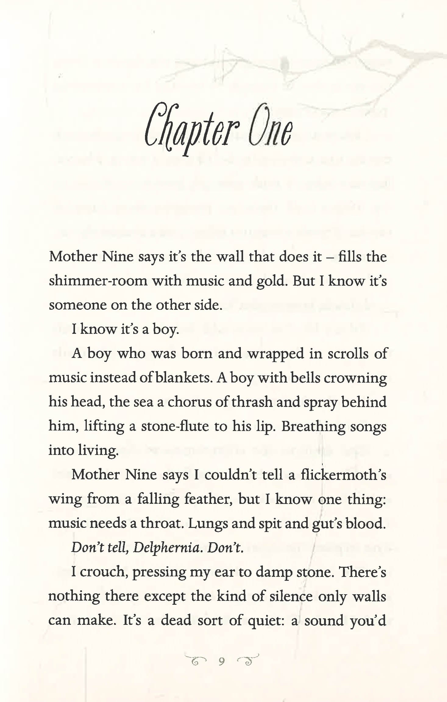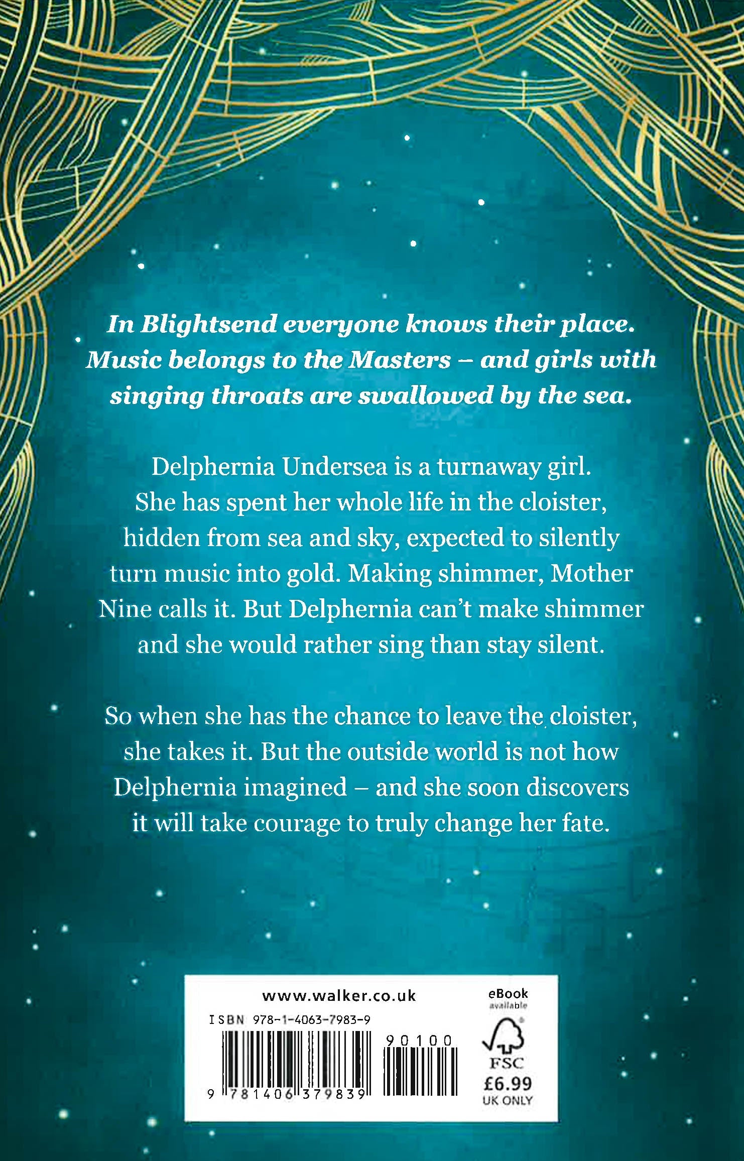 On the strange, stormy island of Blightsend, twelve-year-old Delphernia Undersea has spent her whole life in the cloister of turnaway girls, hidden from sea and sky by a dome of stone and the laws of the island. Outside, the Masters play their music. Inside, the turnaway girls silently make that music into gold. Making shimmer, Mother Nine calls it. But Delphernia can't make shimmer. She would rather sing than stay silent. When a Master who doesn't act like a Master comes to the skydoor, it's a chance for Delphernia to leave the cloister. Outside the stone dome, the sea breathes like a wild beast, the sky watches with stars like eyes, and even the gardens have claws. Outside, secrets fall silent in halls without sound. And outside, Delphernia is caught -between the island's sinister Custodian and its mysterious Childer-Queen. Between a poem-speaking prince and a girl who feels like freedom. And in a debut that glimmers with hope and beauty, freedom - to sing, to change, to live - is precisely what's at stake.