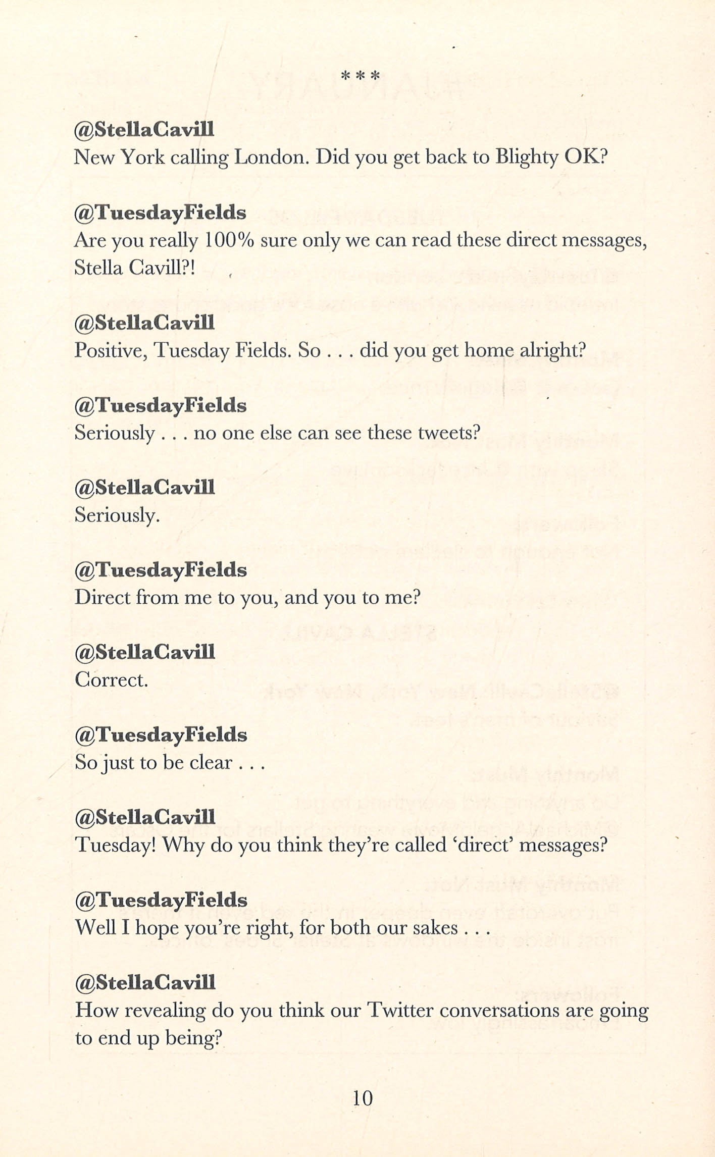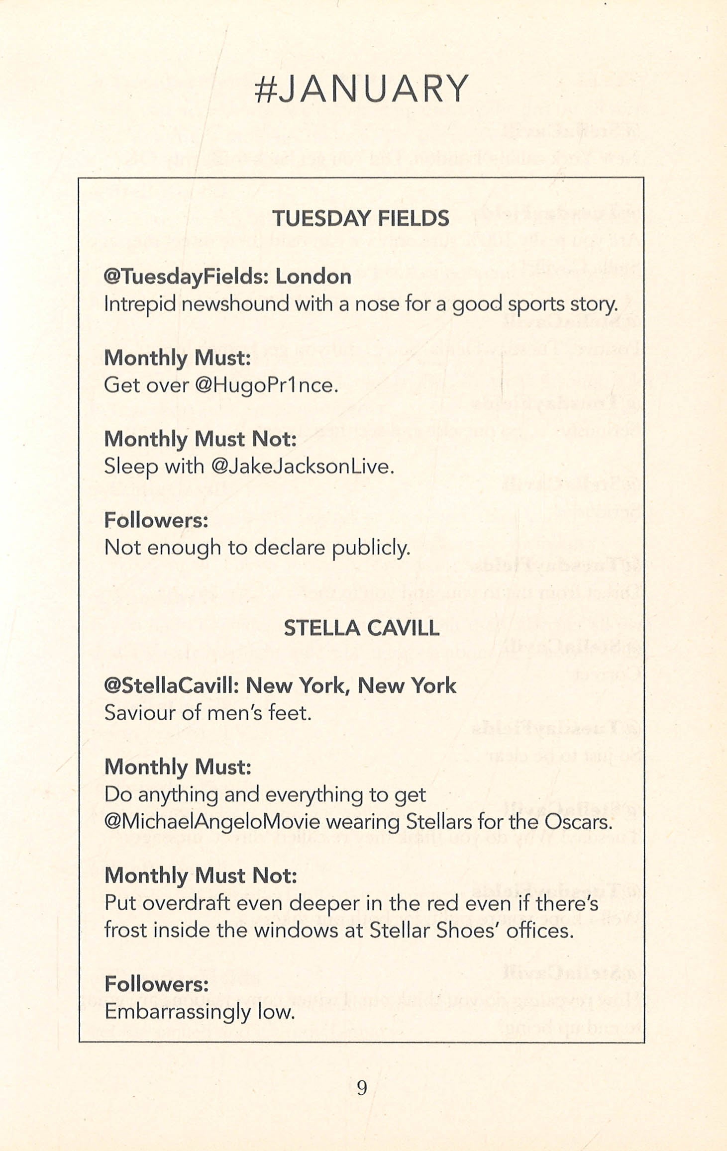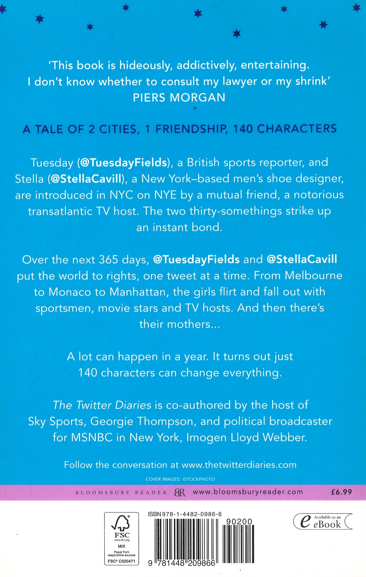 The Twitter Diaries tells the story of pen pals for the 21st century. Two parallel lives separated by an ocean but united over a social network. Tuesday (@Tuesday Fields), a sports reporter and Stella (@StellaCavill), a men's shoe designer, are Brit 30-somethings who are introduced in NYC on NYE by a mutual friend, a notorious transatlantic TV presenter. They strike up an instant bond. Over the next 365 days, @TuesdayFields and @StellaCavill put the world to rights, one tweet at a time. From Melbourne to Monaco to Magaluf, the girls flirt and fall out with sportsmen, movie stars... and TV presenters. And then there's their mothers... December 31st of the same year and @TuesdayFields and @StellaCavill meet again, for the first time since the last time. A lot can happen in a year. It turns out just 140 characters can change everything. The Twitter Diaries is an instantly recognisable yet fictitious tale all generations can relate to, whether they are one of the world's 140 million and counting transfixed Twitter users or not. Accessible, funny and heart-warming, it's this summer's must read.