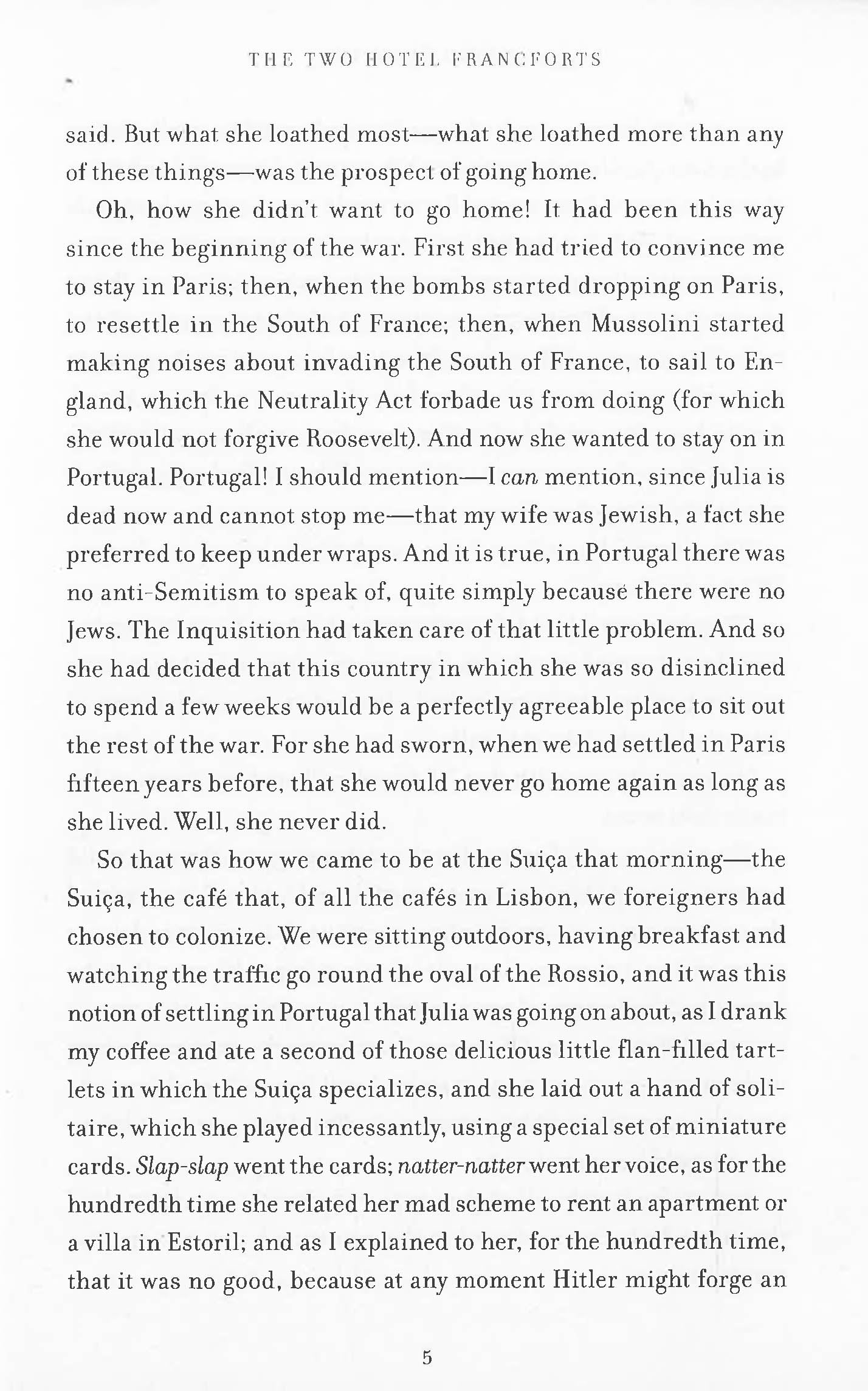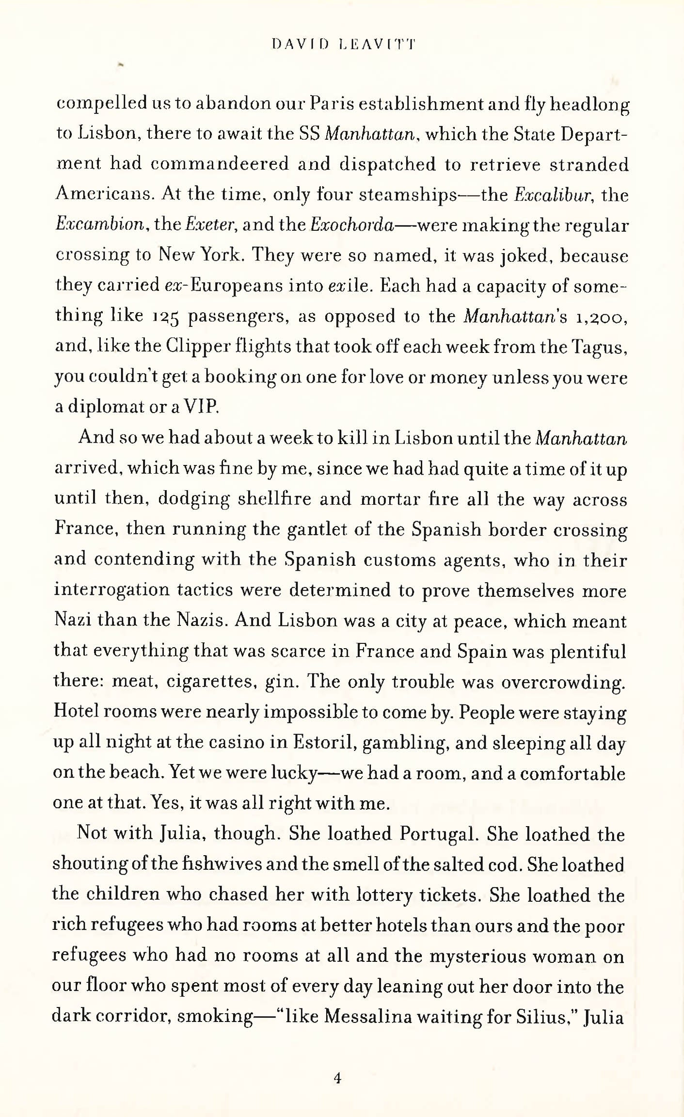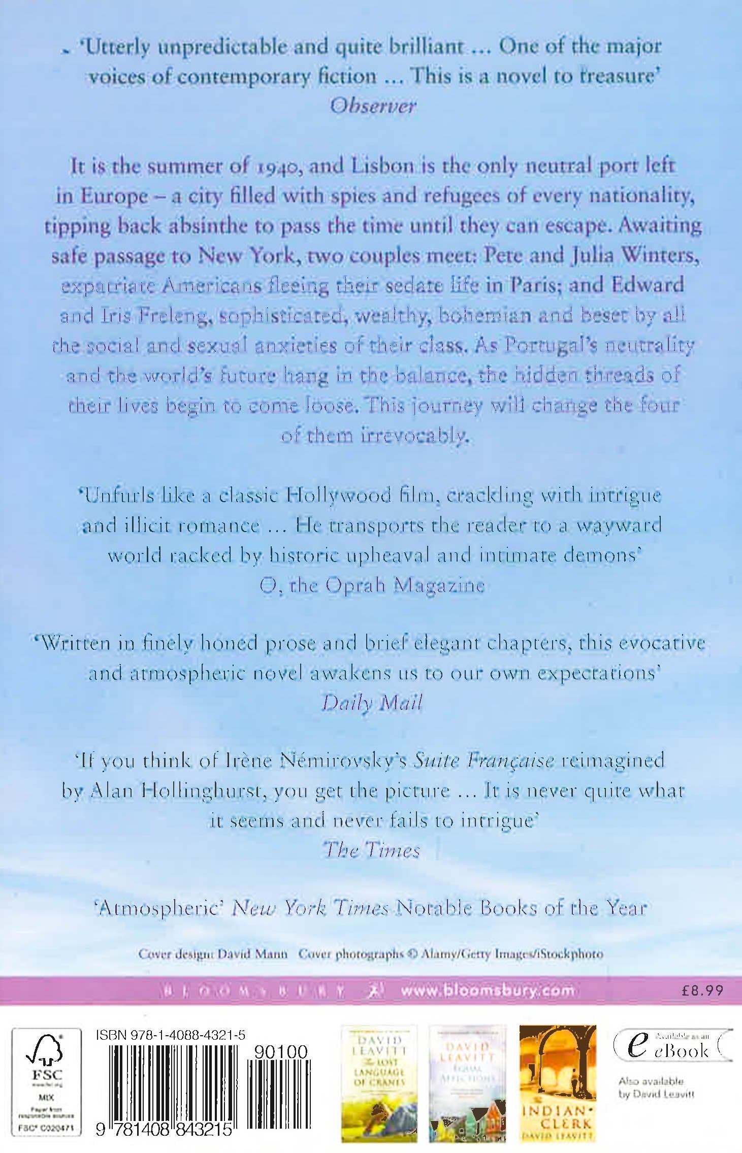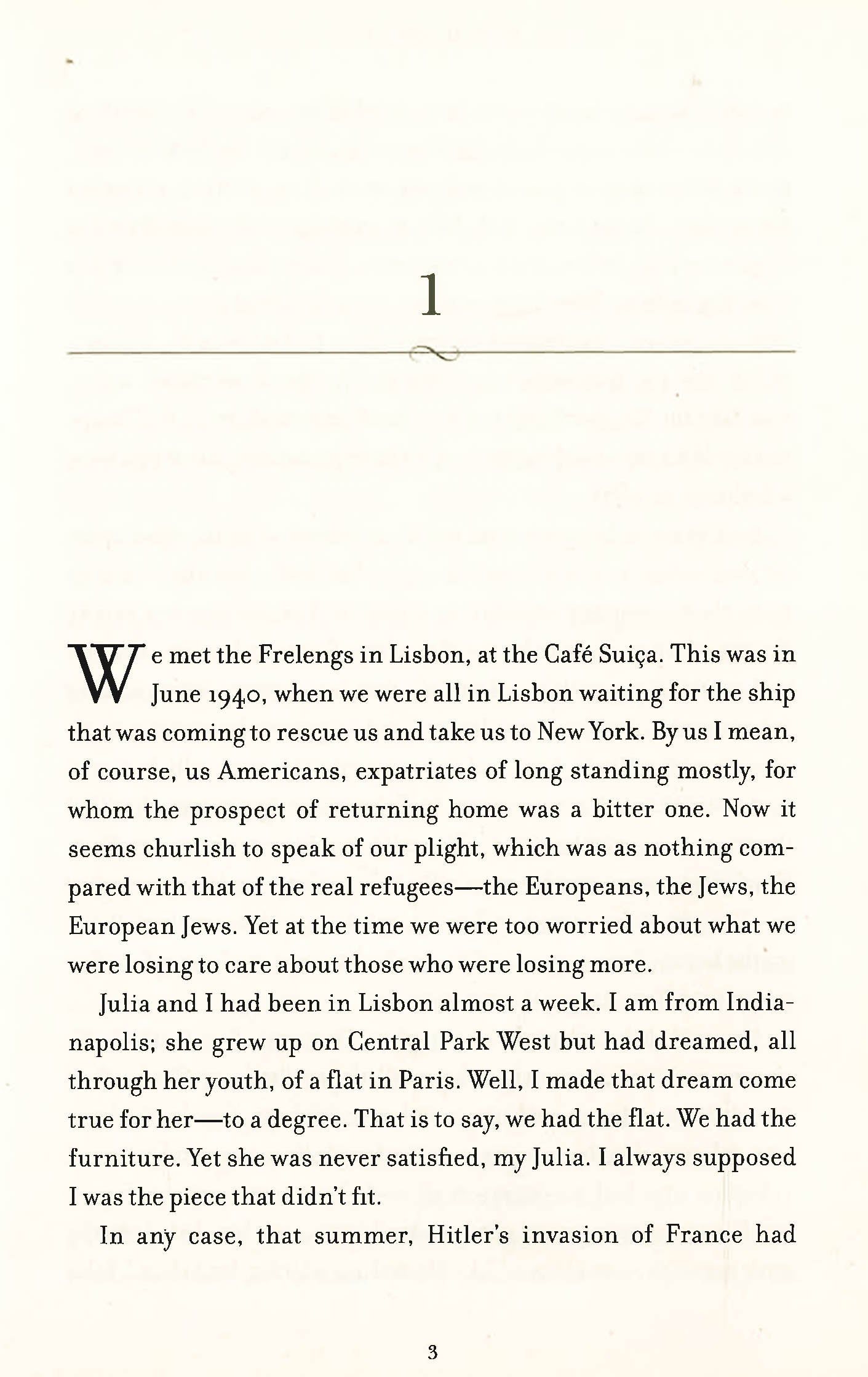 It is the summer of 1940, and Lisbon is one of the only neutral ports left in Europe - a city filled with spies, crowned heads and refugees of every nationality, tipping back absinthe to while away the time until their escape. Awaiting safe passage to New York on the S. S. Manhattan, two couples meet: Pete and Julia Winters, expatriate Americans fleeing their sedate life in Paris; and Edward and Iris Freleng, elegant, independently wealthy, bohemian, and beset by the social and sexual anxieties of their class. Swept up in the tumult, the hidden currents of the lives of these four characters - Julia's status as a Jew, Pete and Edward's affair, Iris's increasingly desperate efforts to save her tenuous marriage - begin to come loose. This journey will change the four of them irrevocably, as Europe sinks into war.
