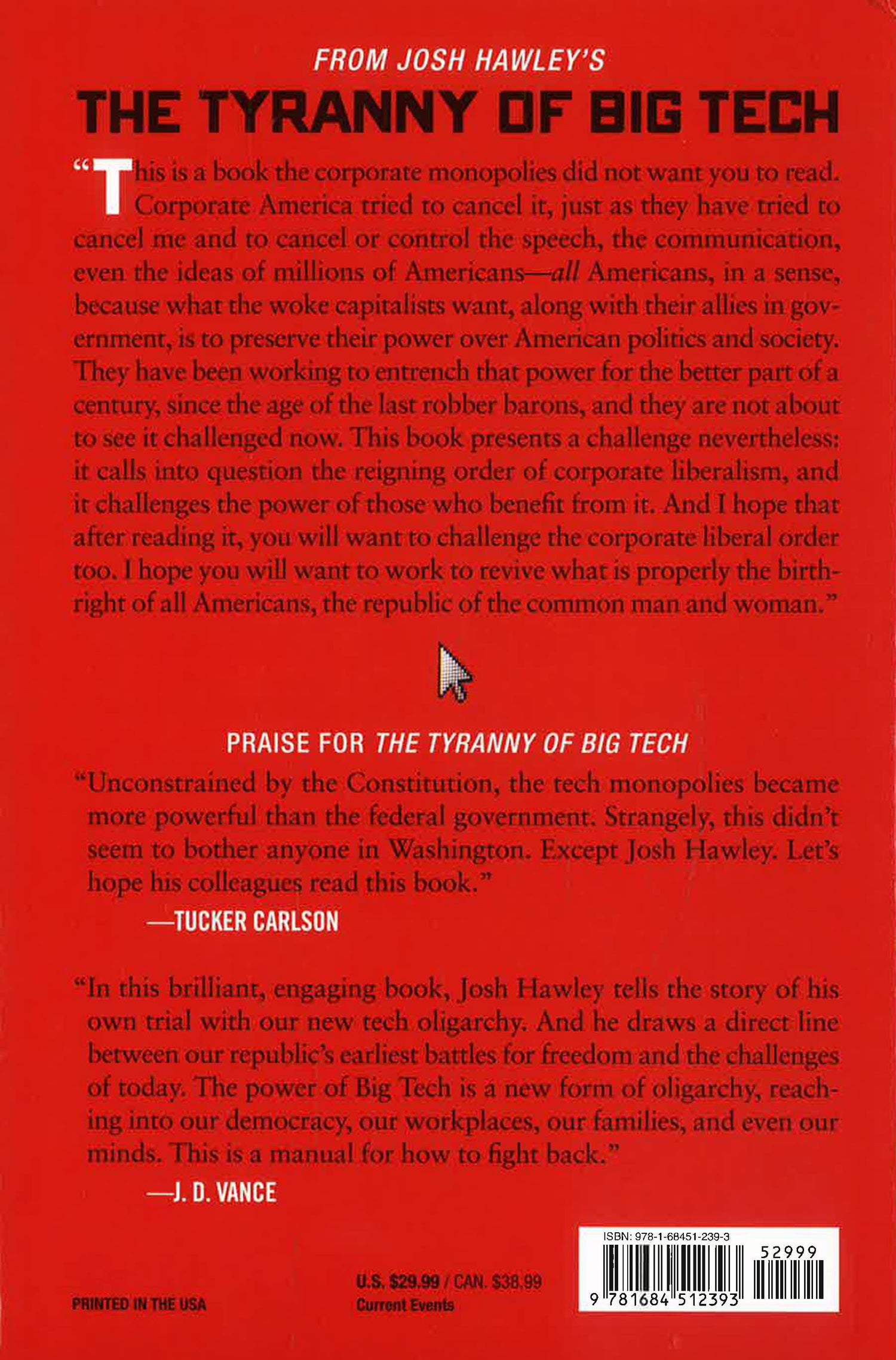 Decades of unchecked data collection have given Big Tech more targeted control over Americans’ daily lives than any company or government in the world. In The Tyranny of Big Tech, Senator Josh Hawley of Missouri argues that these mega-corporations—controlled by the robber barons of the modern era—are the gravest threat to American liberty in decades.