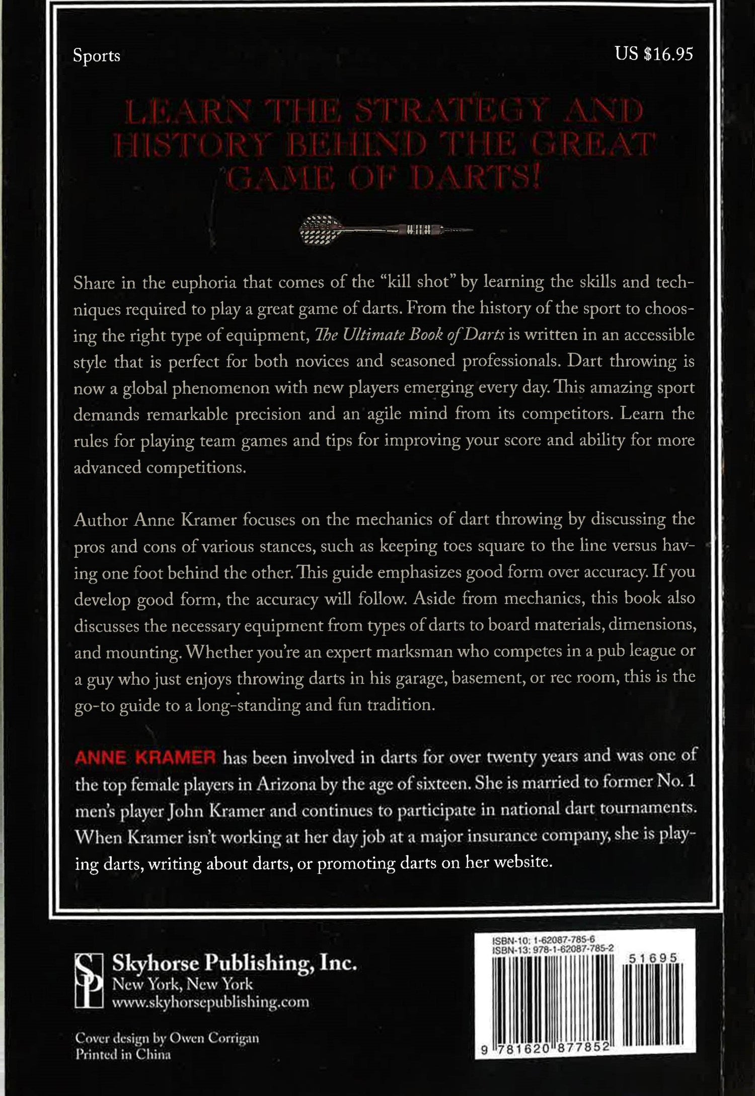 Share in the euphoria that comes of the "kill shot" by learning the skills and techniques required to play a great game of darts. From the history of the sport to choosing the right type of equipment, The Ultimate Book of Darts is written in an accessible style that is perfect for both novices and seasoned professionals. Dart throwing is now a global phenomenon with new players emerging every day. This amazing sport demands remarkable precision and an agile mind from its competitors. Learn the rules for playing team games and tips for improving your score and ability for more advanced competitions. Author Anne Kramer focuses on the mechanics of dart throwing by discussing the pros and cons of various stances, such as toes square to the line versus one foot behind the other. This guide emphasizes good form over accuracy. If you develop good form, the accuracy will follow. Aside from mechanics this book also discusses the necessary equipment from types of darts to board materials, dimensions, and mounting. Whether you're an expert marksman who competes in a pub league or a guy who just enjoys throwing sharp objects, this is the go-to guide to a longstanding and fun tradition.
