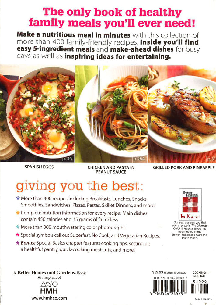 Modern home cooks are concerned with getting healthy food on the table quickly, and Better Homes and Gardens The Ultimate Quick & Healthy Book offers the perfect solution. Included are 400 recipes ready in 30 minutes or less, and every main dish has fewer than 450 calories and 15 grams of fat. This book proves that quick cooking and healthy cooking can be synonymous. There are recipes for every occasion, from breakfast to dinner to make-ahead meals and entertaining. Every recipe includes full nutritional information and handy icons that highlight Superfast, No-Cook, Vegetarian, and Heart Healthy dishes. With more than 180 full-colour photographs, the book is as beautiful as it is practical.