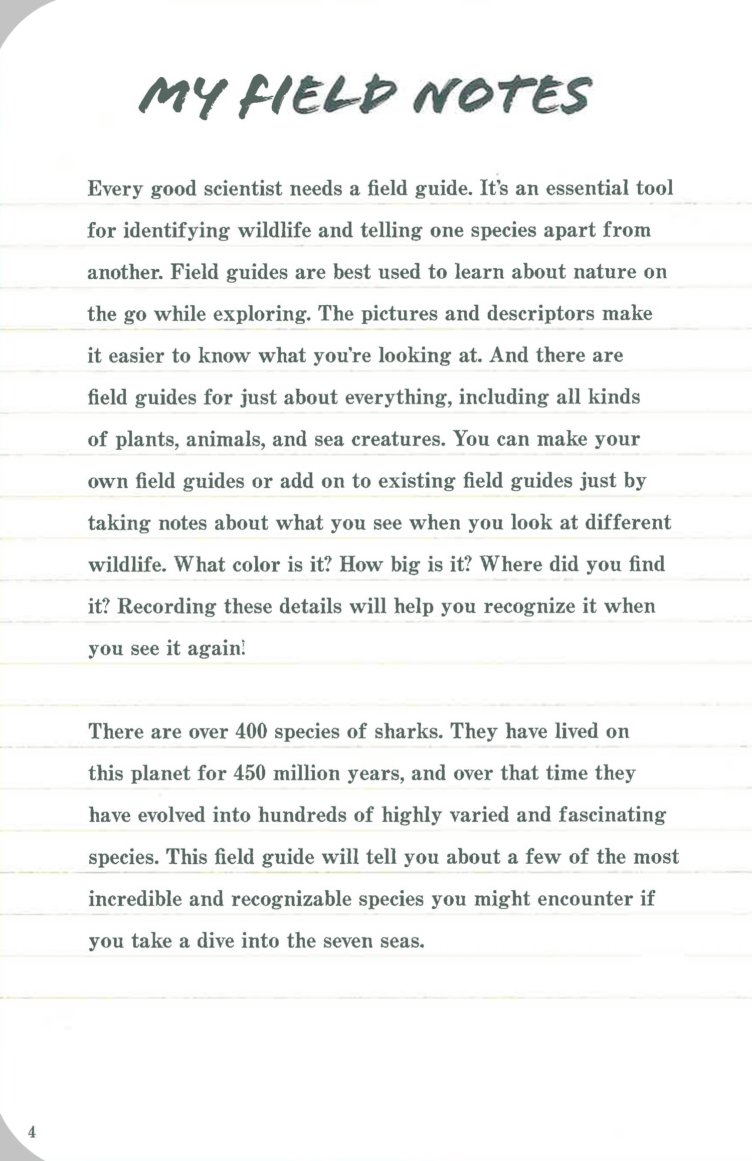 Pick up the journal of a marine biologist and discover underwater mysteries with The Ultimate Shark Field Guide. Encounter sharks of all shapes and sizes and note observations on each species' appearance, size, diet, and more. Detailed watercolor illustrations will captivate young readers. This spectacular visual guide gets you up close and personal with some of the fiercest creatures on Earth, including the bull shark, the great white, the Ganges river shark, the whale shark, and the great hammerhead. Explore underwater landscapes with these incredible animals in The Ultimate Shark Field Guide!