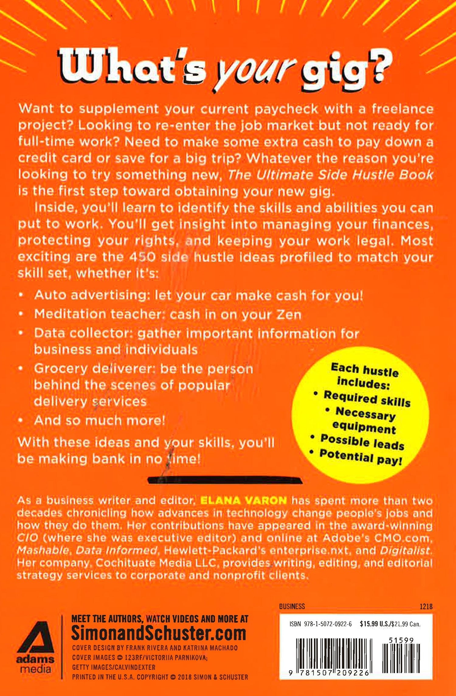 Get your side hustle on with this handy guide that gives you hundreds of ideas on how to make extra cash--and have fun doing it! Do you work a regular job, but still find yourself wishing you had a little extra money? Or maybe you just want some extra fulfillment after hours that you just aren't finding in your 9-5. A second job--also known as a side hustle--might be the answer! Learn how to take advantage of the gig economy and turn your time, space, skills, or stuff into extra cash. The Ultimate Side Hustle Book presents up-to-the minute research on 450 fun, resourceful, and often rewarding side hustle jobs, including detailed information on the skills you need and experience required for each, how easy it is to find work, and of course, pay rates--all in an easy-to-read and fun-to-use format. In addition to helpful facts and figures, you'll find real-life anecdotes and tips from successful side hustlers sprinkled throughout. From dog walking and tutoring to vehicle advertising and refereeing recreational sports leagues, you're sure to find that perfect side hustle that fits you and your lifestyle.