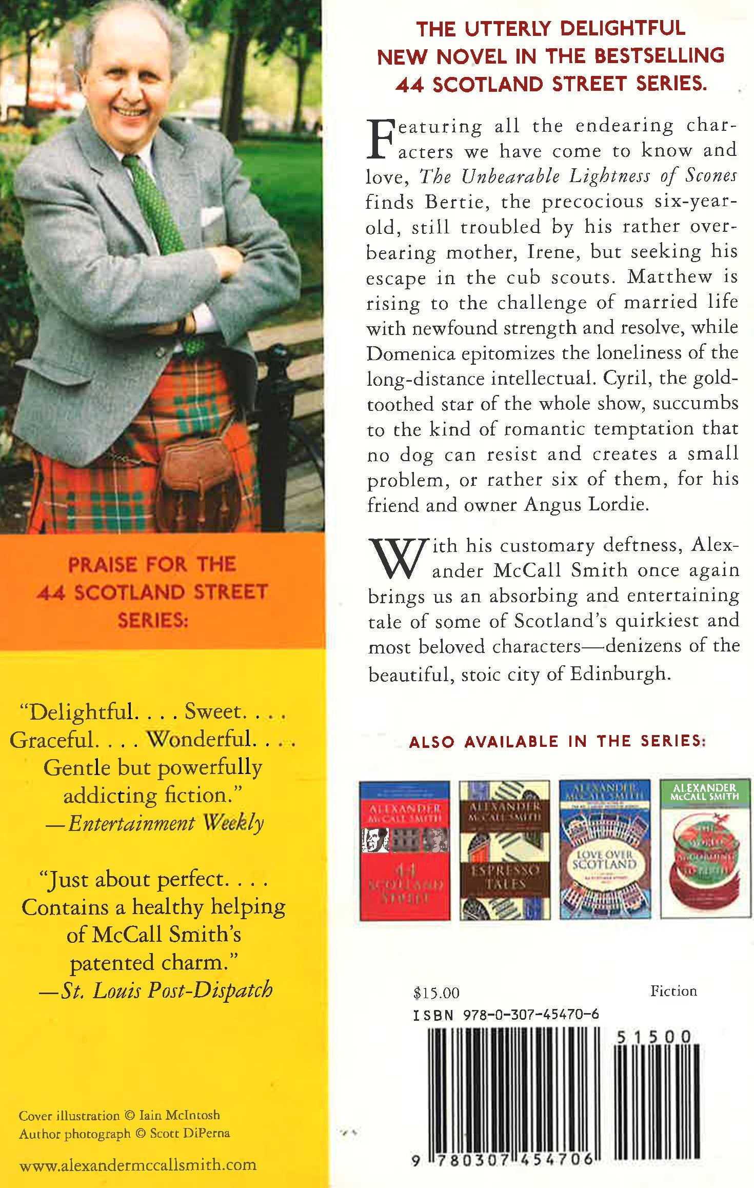 The witty and utterly delightful new novel in the national bestselling 44 Scotland Street series. Featuring all the quirky characters we have come to know and love, The Unbearable Lightness of Scones, finds Bertie, the precocious six-year-old, still troubled by his rather overbearing mother, Irene, but seeking his escape in the Cub Scouts. Matthew is rising to the challenge of married life with newfound strength and resolve, while Domenica epitomizes the loneliness of the long-distance intellectual. Cyril, the gold-toothed star of the whole show, succumbs to the kind of romantic temptation that no dog can resist and creates a small problem, or rather six of them, for his friend and owner Angus Lordie. With his customary deftness, Alexander McCall Smith once again brings us an absorbing and entertaining tale of some of Scotland's most quirky and beloved characters--all set in the beautiful, stoic city of Edinburgh. *This book may have remainder mark*